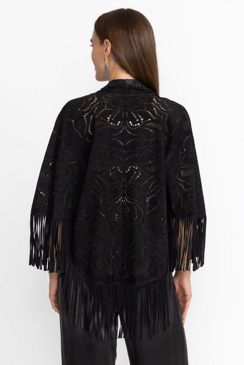 Crafted from 100% luxurious suede, the Laser Cut Suede Poncho is a layering piece with undeniable style. Featuring an open front and dramatic fringe at the hemline, this unique poncho is embellished with laser-cut detailing at the back. Layer over a bold fitted top and pair with classic denim for a stunning casual look.