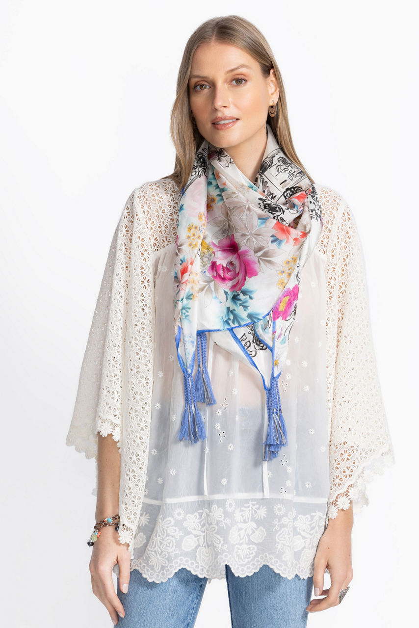 Crafted from 100% luxurious silk, the Laville Silk Scarf is a rich colorful accessory. Featuring vibrant floral blooms dotting the background, this unique scarf is embellished with iconic architecture from all around the world. Wear over your hair tied at the neck for windy days to maintain a perfectly coiffed style.