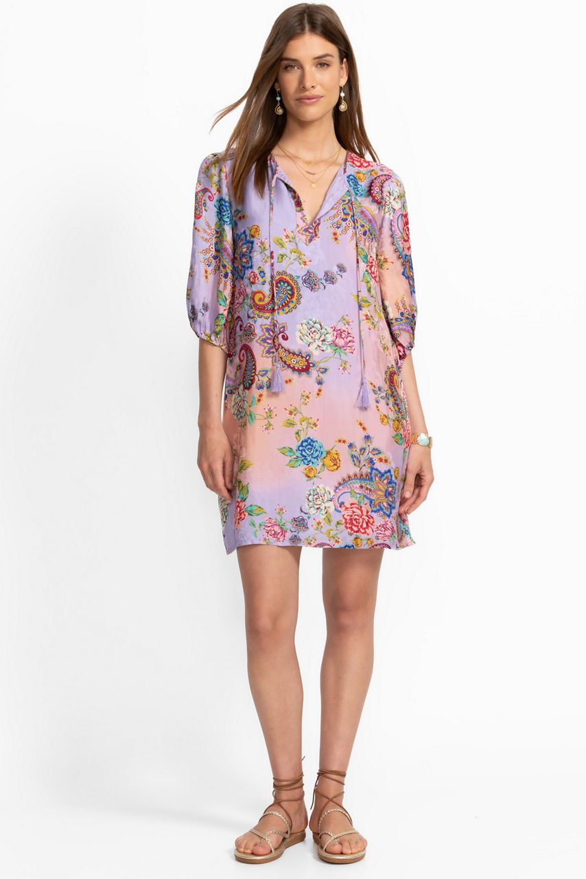 Boldly embellished with vibrant florals and decorative paisley, the Lavinia Dress is crafted from a lightweight flowing fabric. Thoughtfully designed with a split V-neckline adorned with tassels, this dress offers a straight silhouette finished with 3/4 length bishop sleeves. Pair with pastel flats and delicate jewelry for an elegant daytime event.