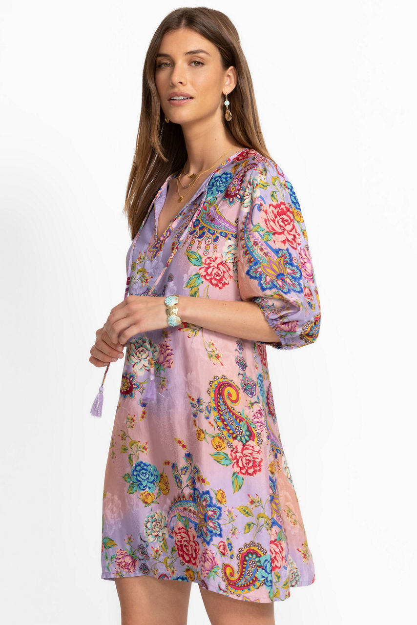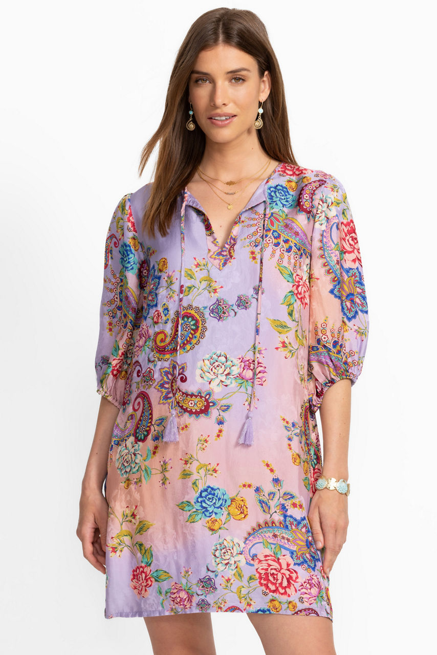 Boldly embellished with vibrant florals and decorative paisley, the Lavinia Dress is crafted from a lightweight flowing fabric. Thoughtfully designed with a split V-neckline adorned with tassels, this dress offers a straight silhouette finished with 3/4 length bishop sleeves. Pair with pastel flats and delicate jewelry for an elegant daytime event.