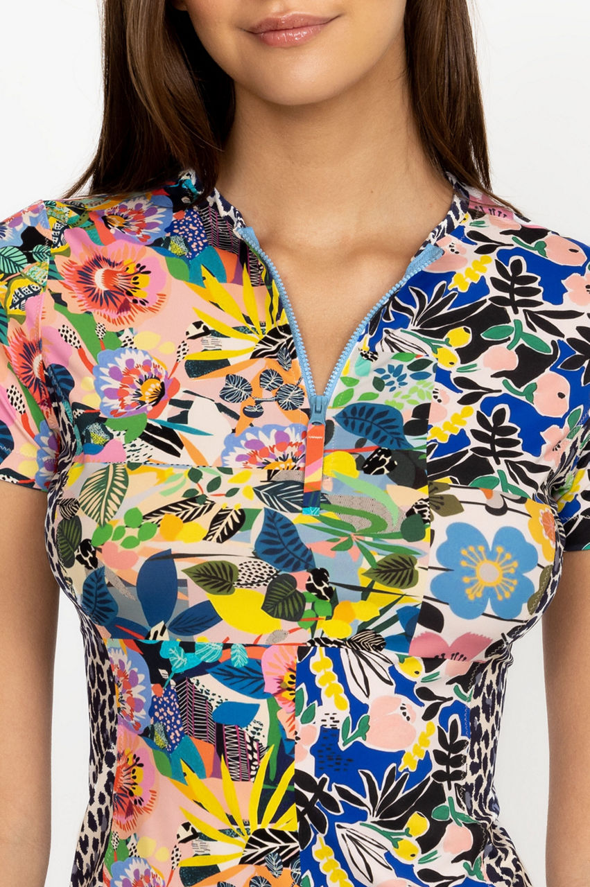 The Layla Surf Shirt demonstrates an effortlessly union of practicality and style. Perfect for an array of water-based activities and sun-filled escapes, this surf shirt is festooned with elegant blooms and boasts a front zip closure and contrast leopard print panels at the sides. Finish the look with matching board shorts for a coordinated and playful approach to vacation style.