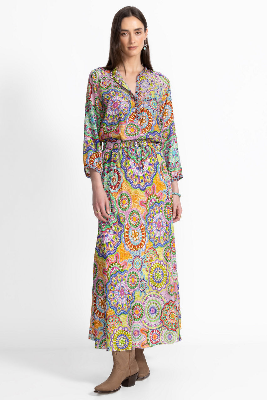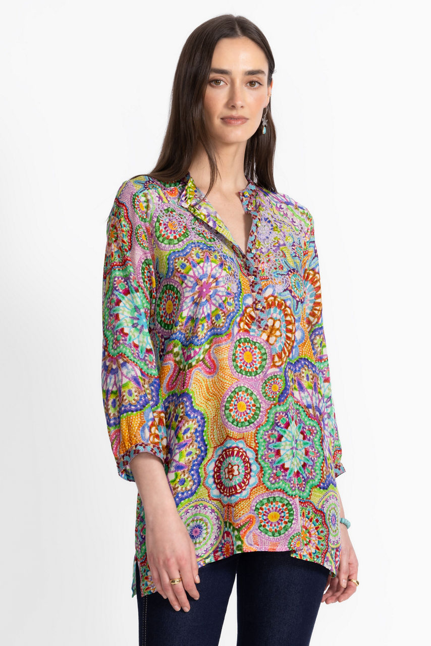 Beautifully embellished with a retro-inspired floral print, the Leena Tunic is crafted from 100% flowing silk. Featuring a Henley neckline and gathered 3/4 length sleeves, this relaxed-fit tunic adds a splash of color to any look. Pair with black leggings and bold flats for an eclectic weekend look.
