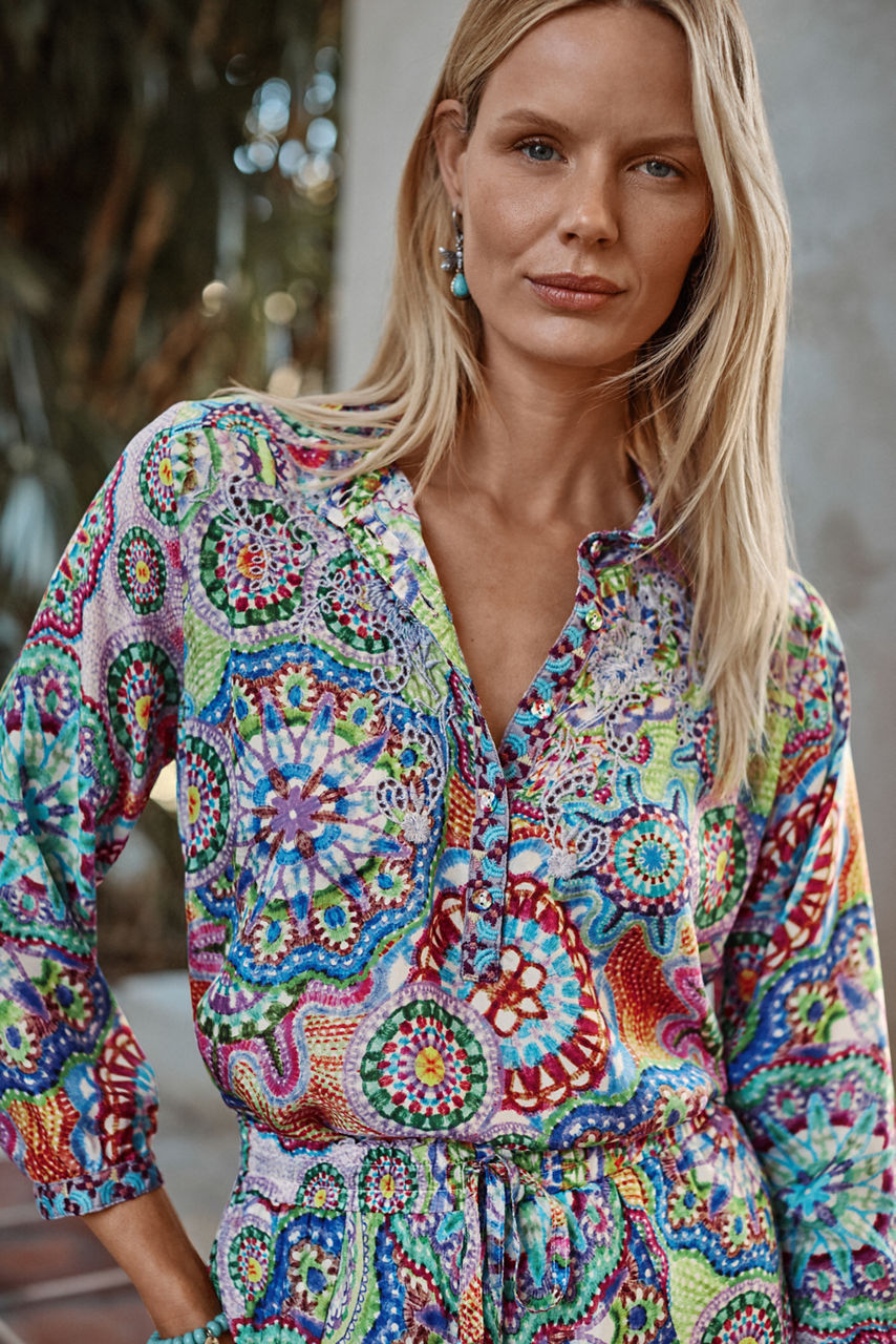 Beautifully embellished with a retro-inspired floral print, the Leena Tunic is crafted from 100% flowing silk. Featuring a Henley neckline and gathered 3/4 length sleeves, this relaxed-fit tunic adds a splash of color to any look. Pair with black leggings and bold flats for an eclectic weekend look.