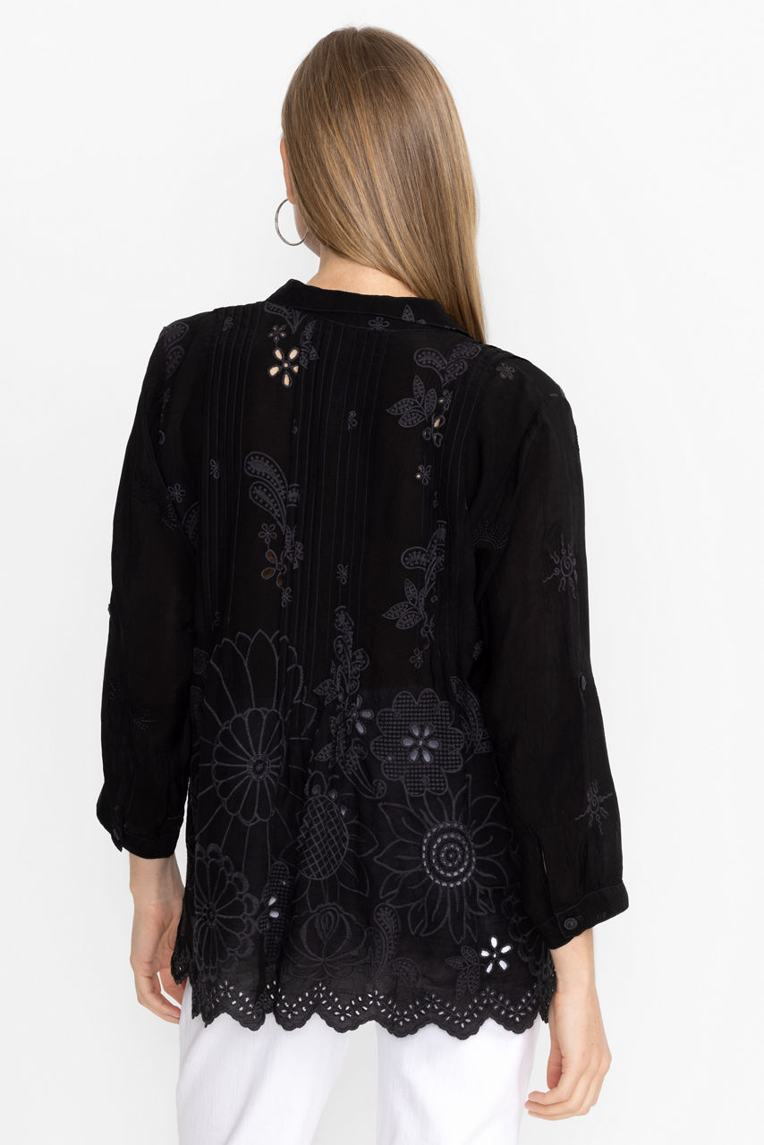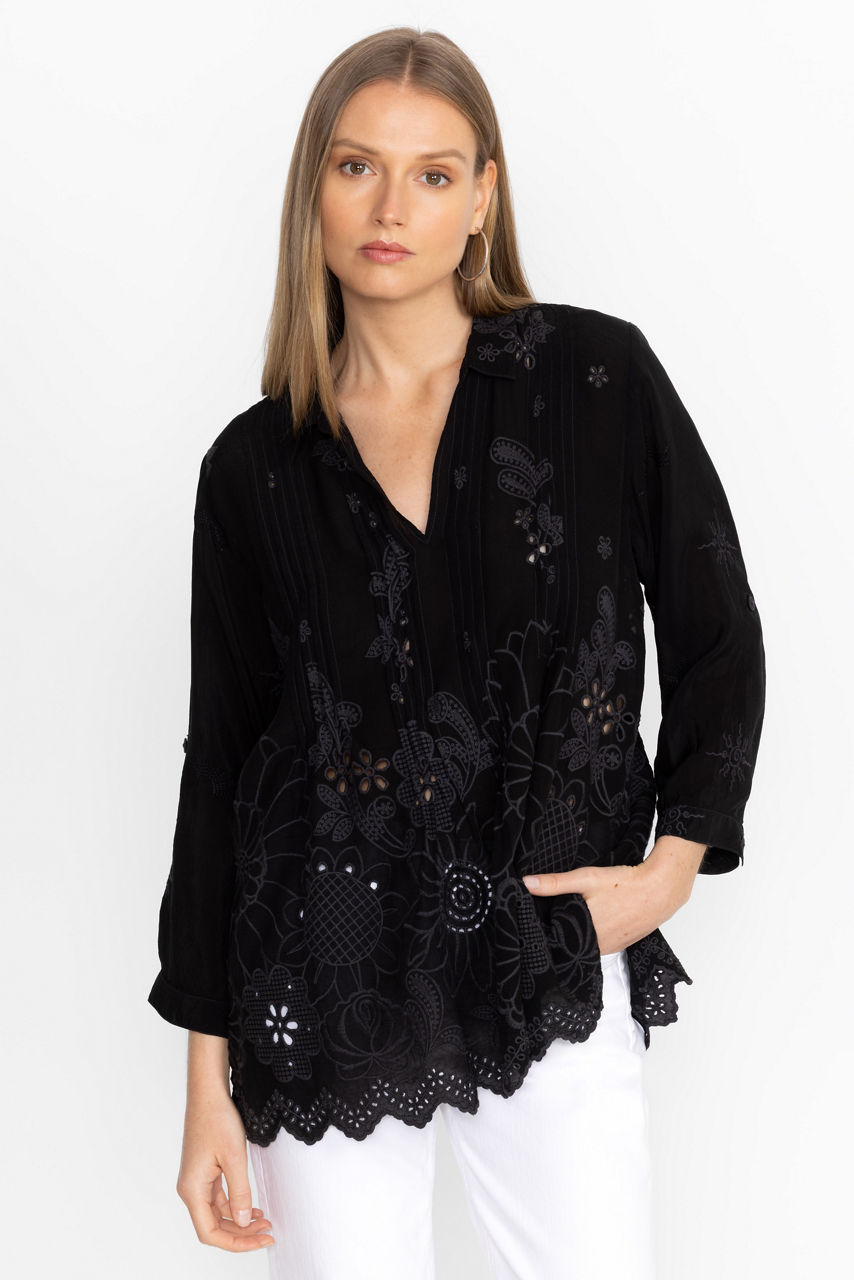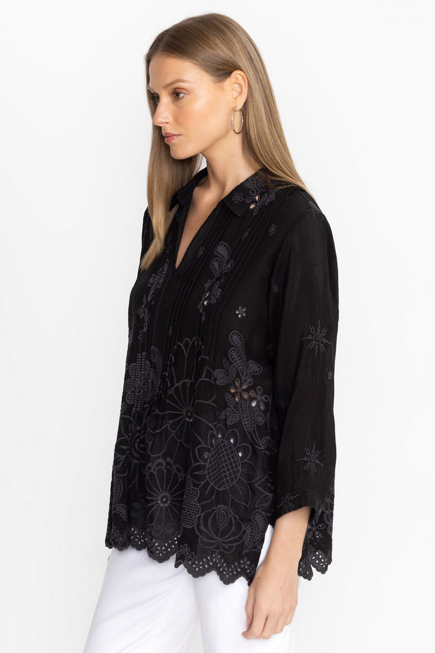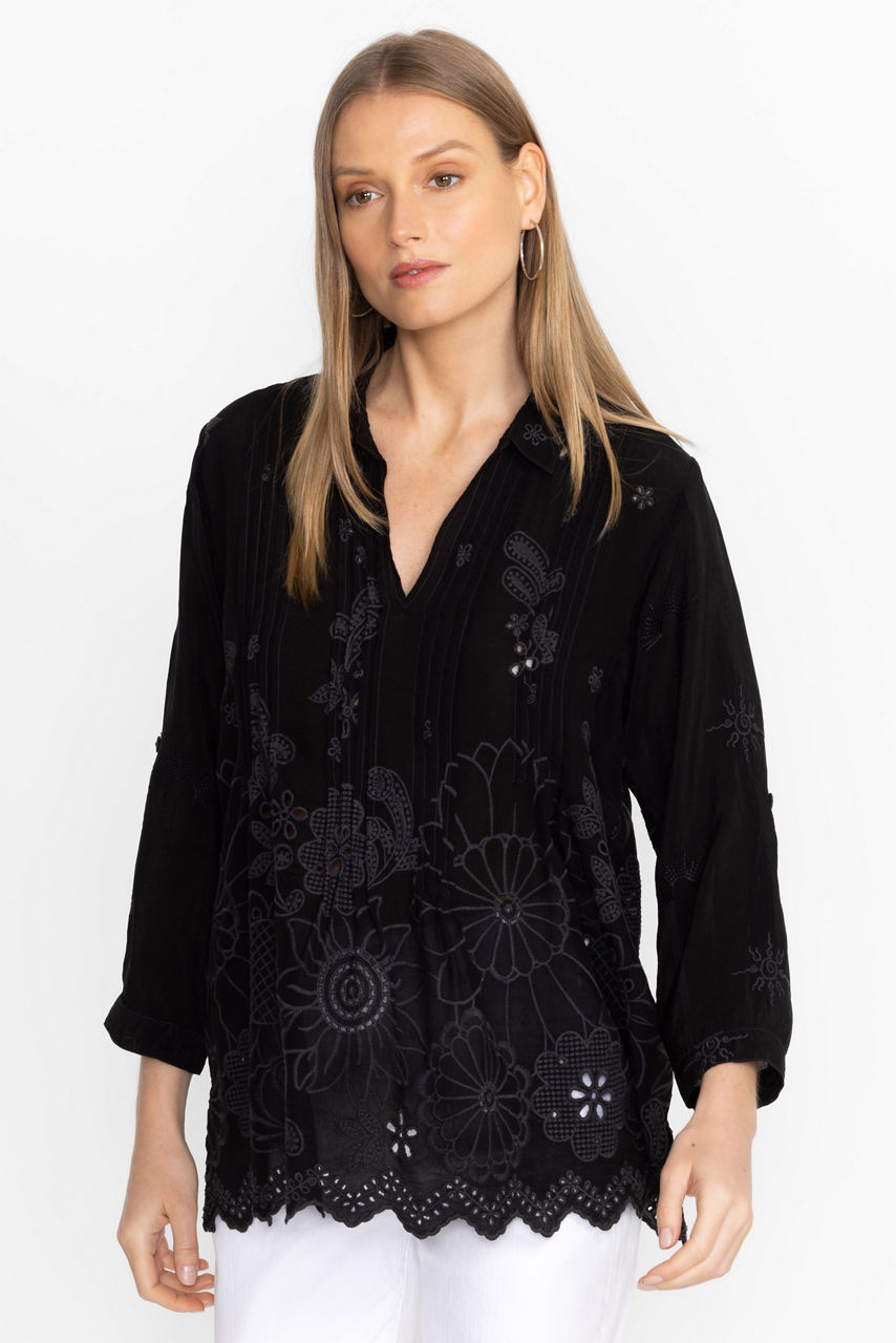 Crafted from a lightweight flowing fabric, the Lemmi Blouse is highlighted with ornate embellishments. Featuring a collared split V- neckline and intricate pintuck detailing at the front and back, this lovely blouse is finished with romantic scalloped edges at the hemline. Pair with a fitted skirt and sandals for an evening out.