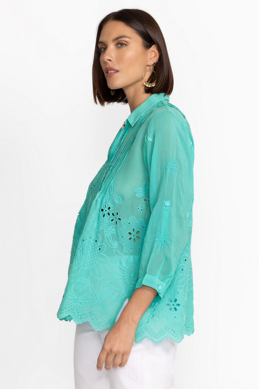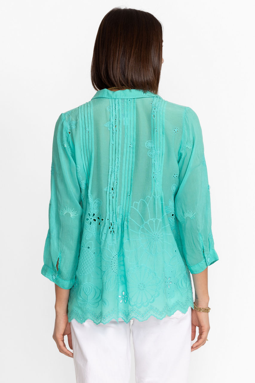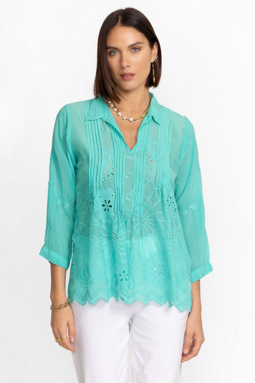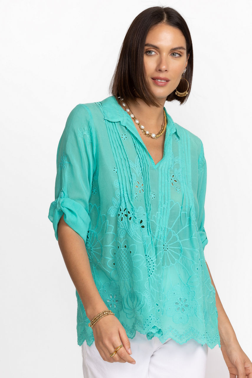 Offering a structured yet feminine silhouette, the Jazlynn Lemmi Blouse is crafted from lightweight material with a hint of stretch. Featuring a scallop hem, pintuck detail on the front and back, and sleeves that roll up to a button tab, this V-neck top comes in a clean, crisp white. Pair with your favorite trousers and sleek boot to round out the look.