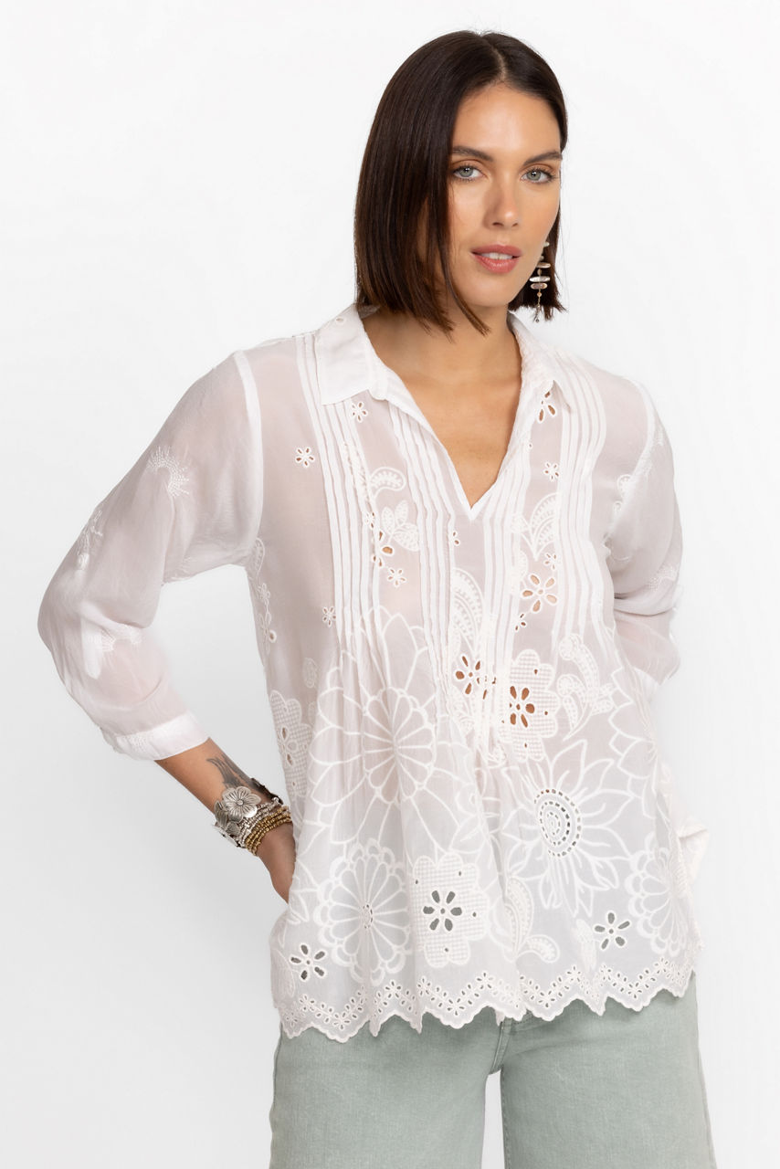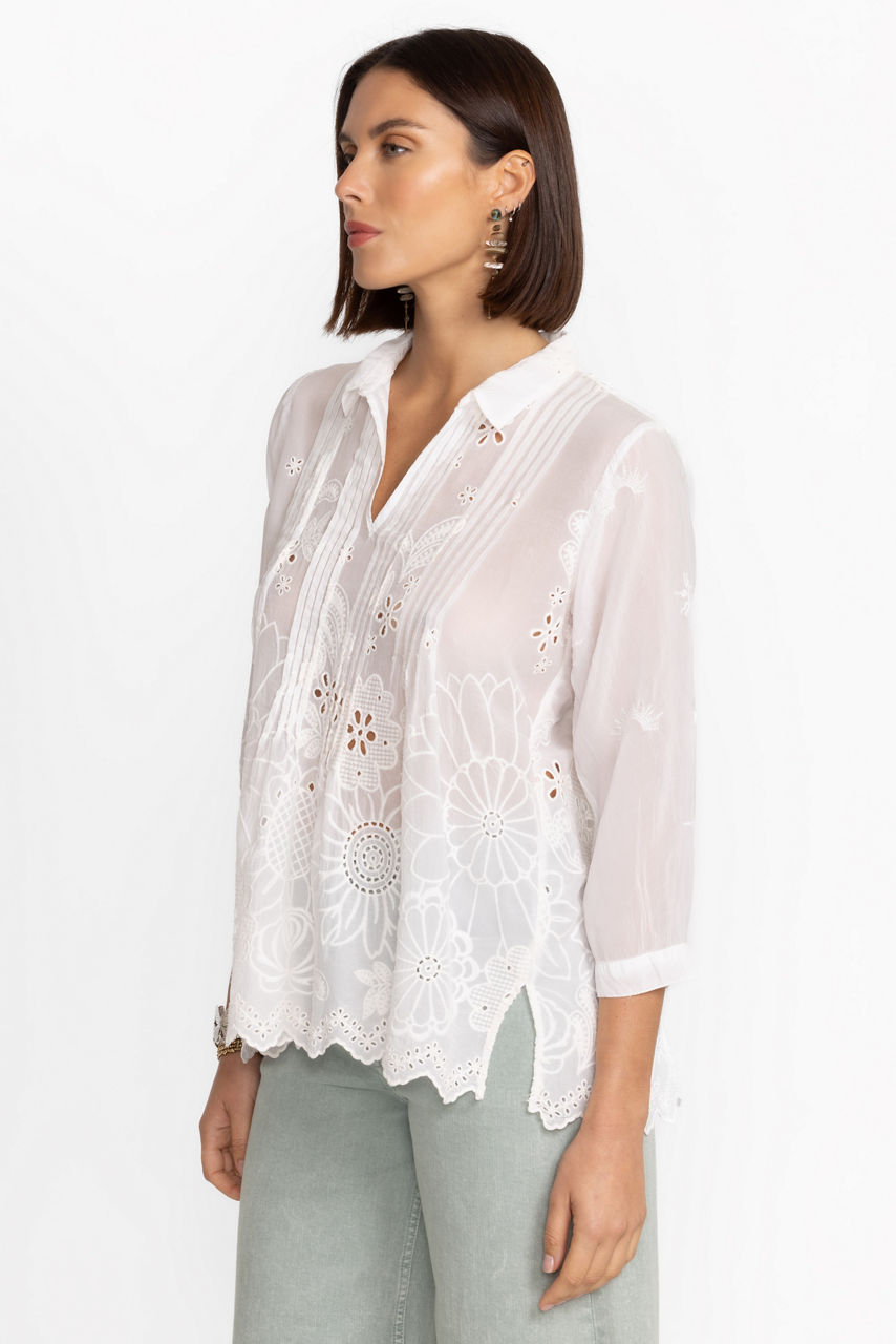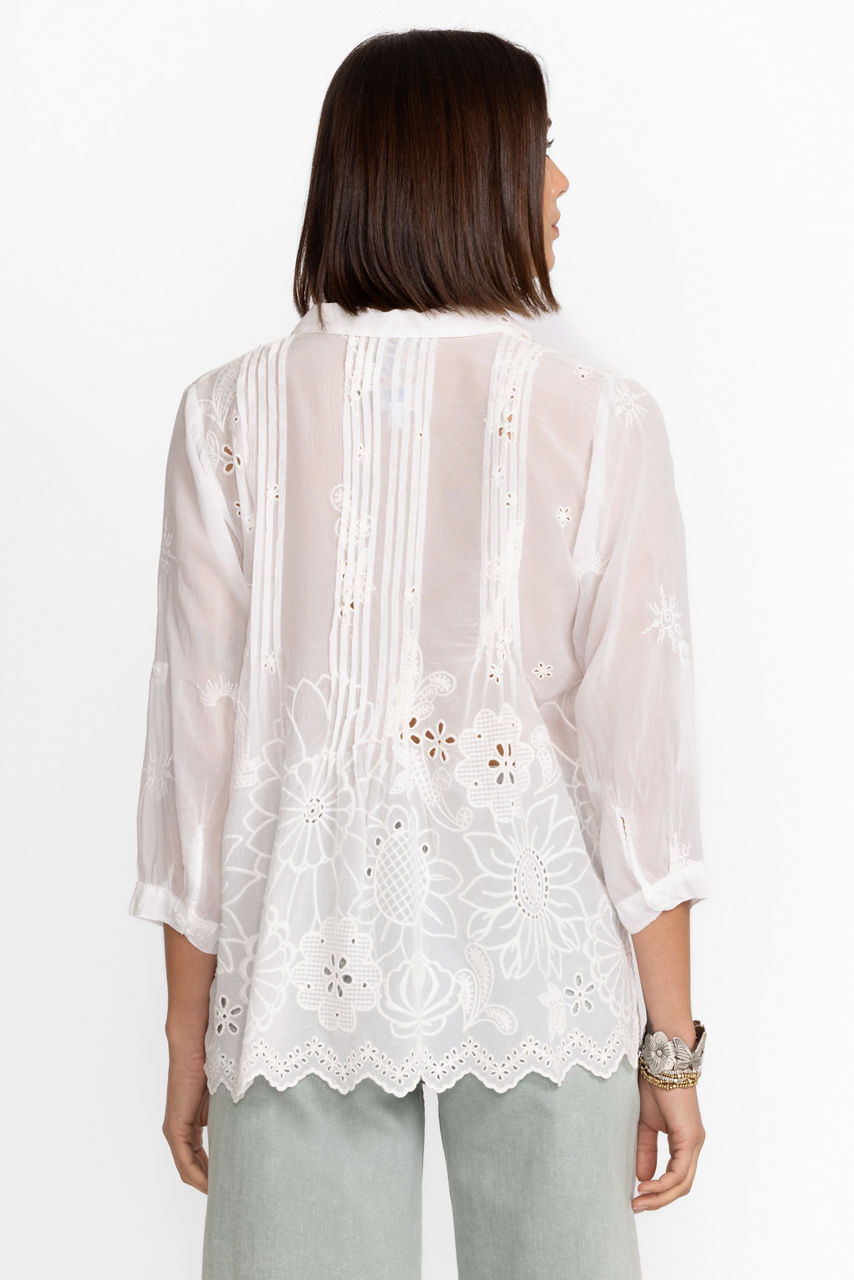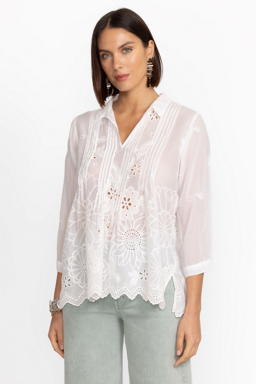 Offering a structured yet feminine silhouette, the Jazlynn Lemmi Blouse is crafted from lightweight material with a hint of stretch. Featuring a scallop hem, pintuck detail on the front and back, and sleeves that roll up to a button tab, this V-neck top comes in a clean, crisp white. Pair with your favorite trousers and sleek boot to round out the look.