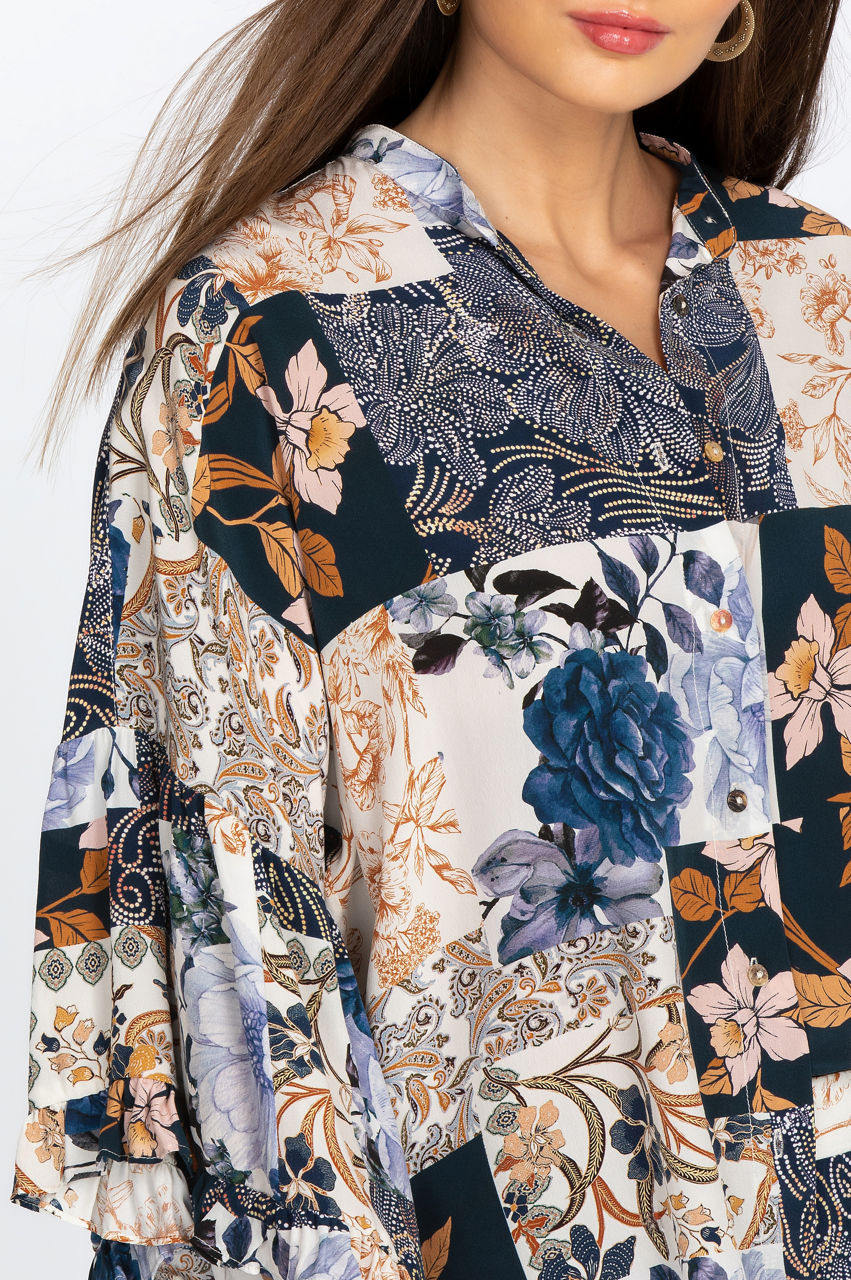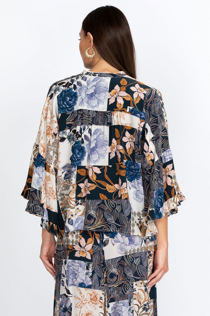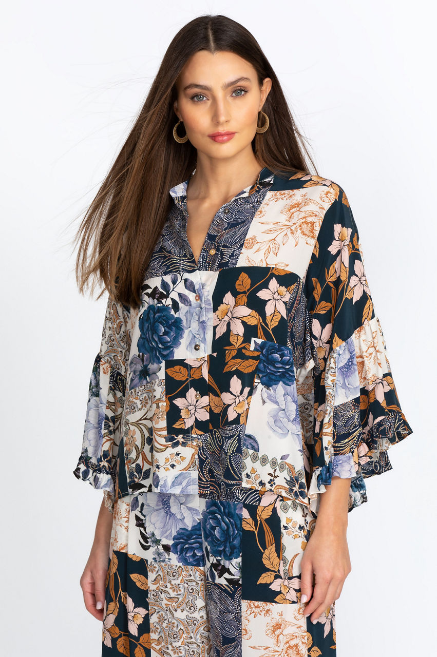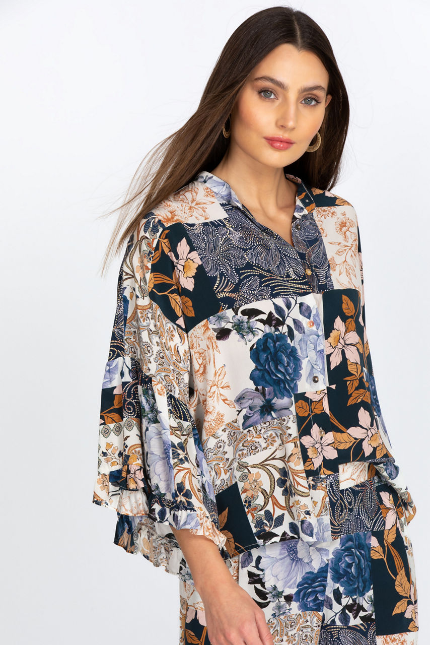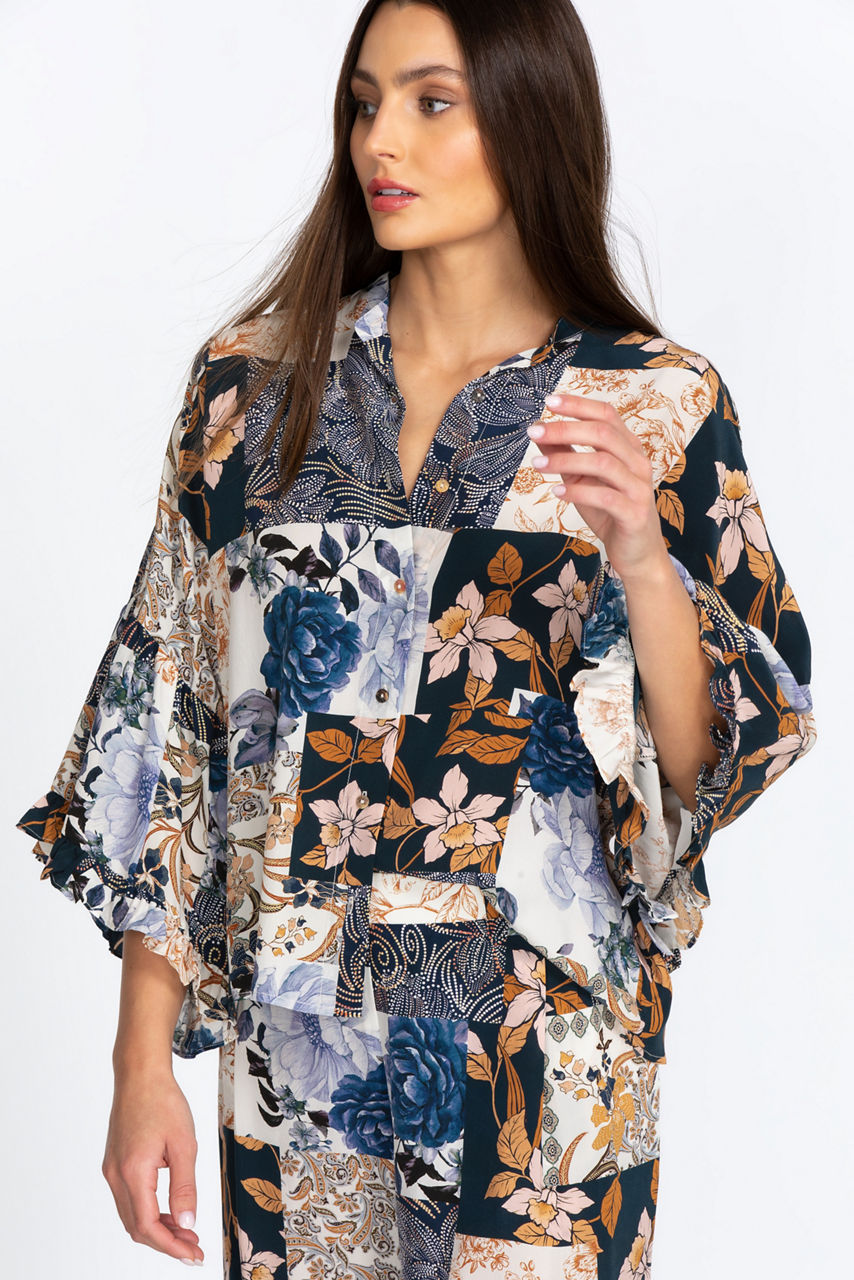 Feminine and flirty, our Leo Button-Down Top is a medley of color and design. A short, upright collar allows you to showcase your neckline. Long, drop earrings will only accentuate this effect. Bold blacks, dark blues, deep golds meld with creams, light blues, and soft purples to create a top that will match any skirt or pants in your wardrobe. Flowing butterfly sleeves end in deep, ruffled angles of the same fabric. Dress it up or dress it down; you will always be the best-dressed woman in any crowd wearing our Leo Button Down Top.
