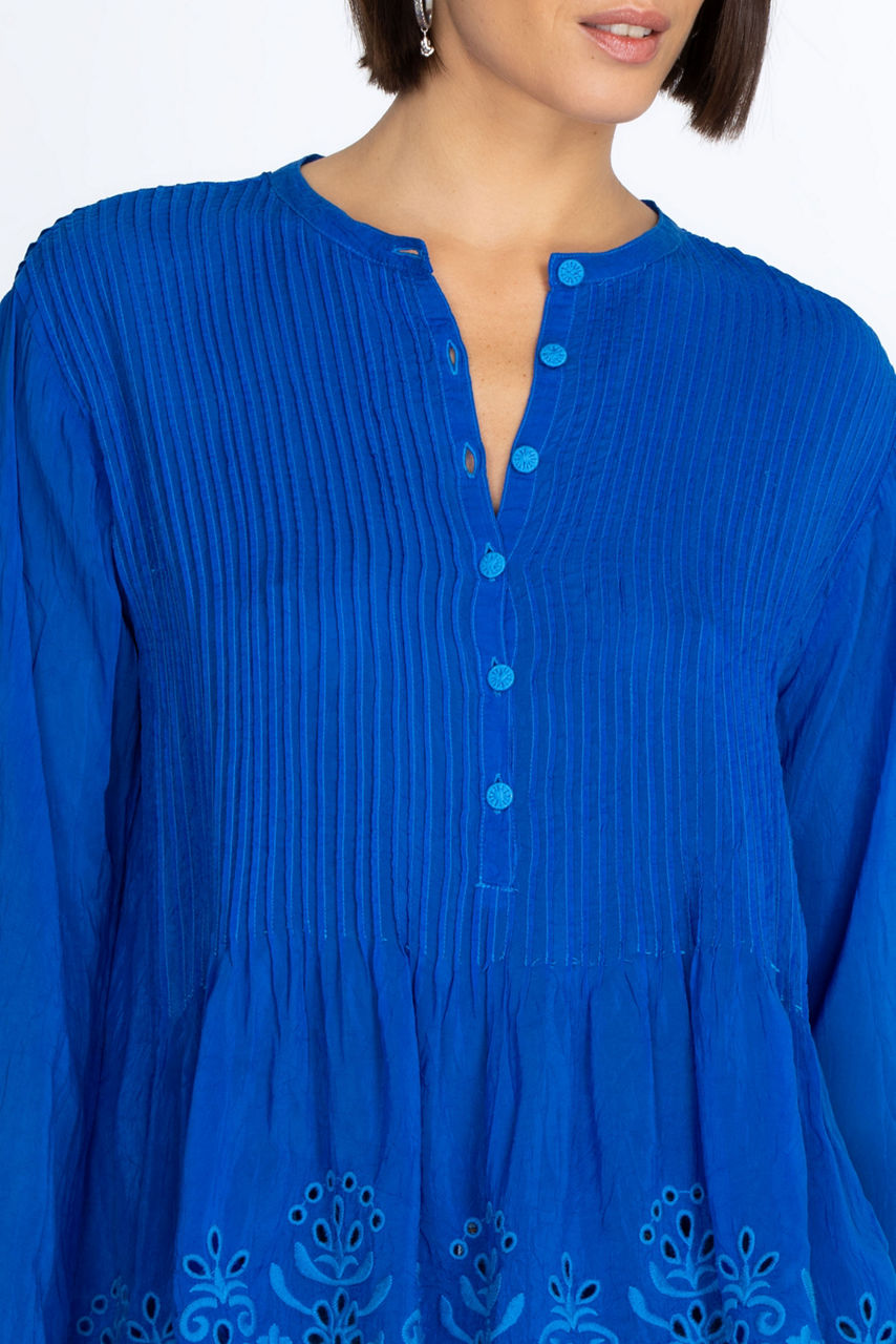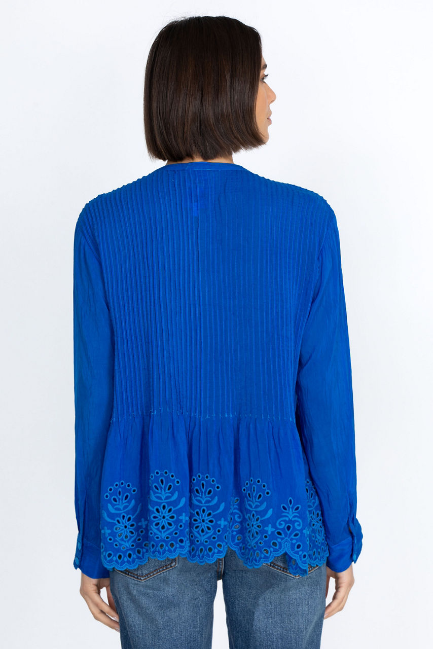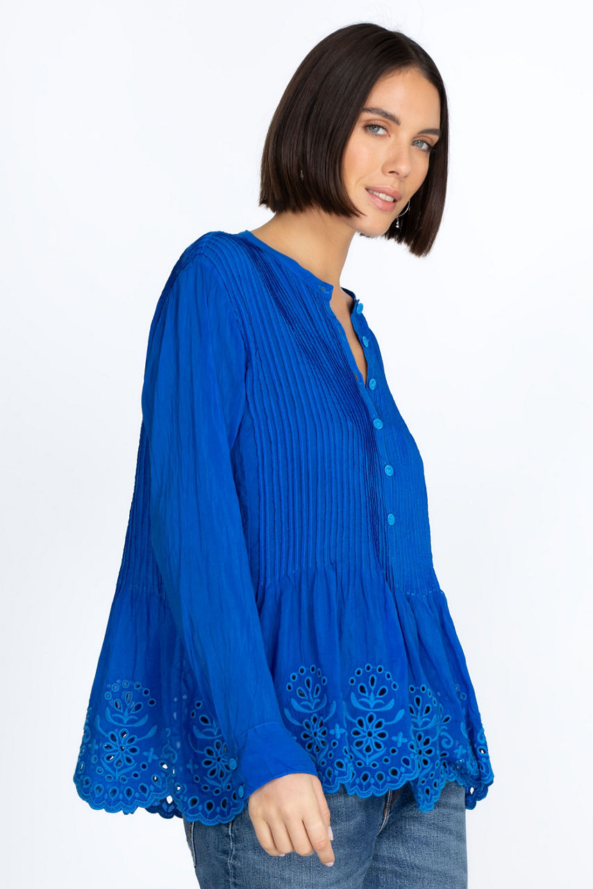 The Leonie Pintuck Blouse puts a modern spin on romanticism. Perfect for weekend lunches and brighter days, this blouse is spun from a soft material and features a round neck, buttoned cuffs and an intricate scalloped, embroidered hem. Style with jeans and flats for a versatile daytime look.