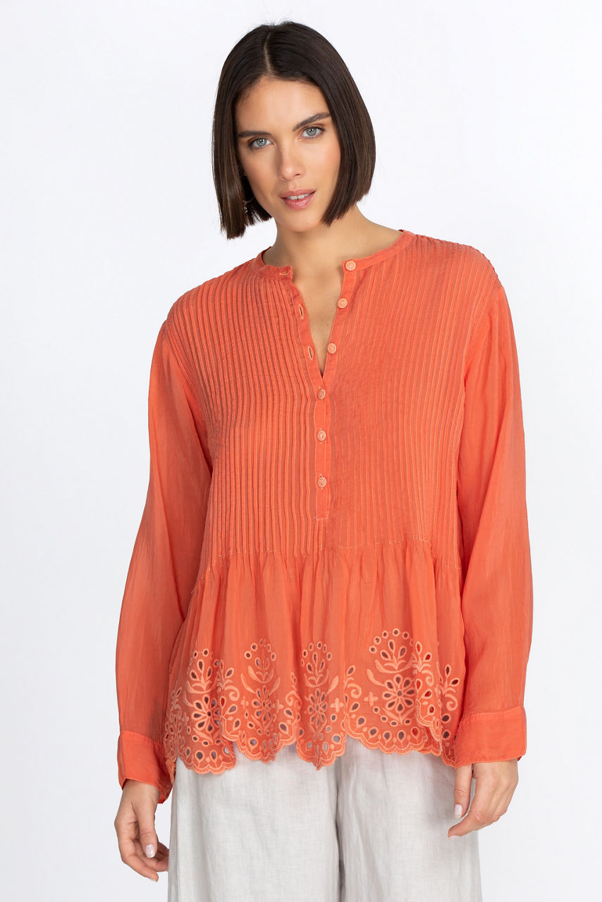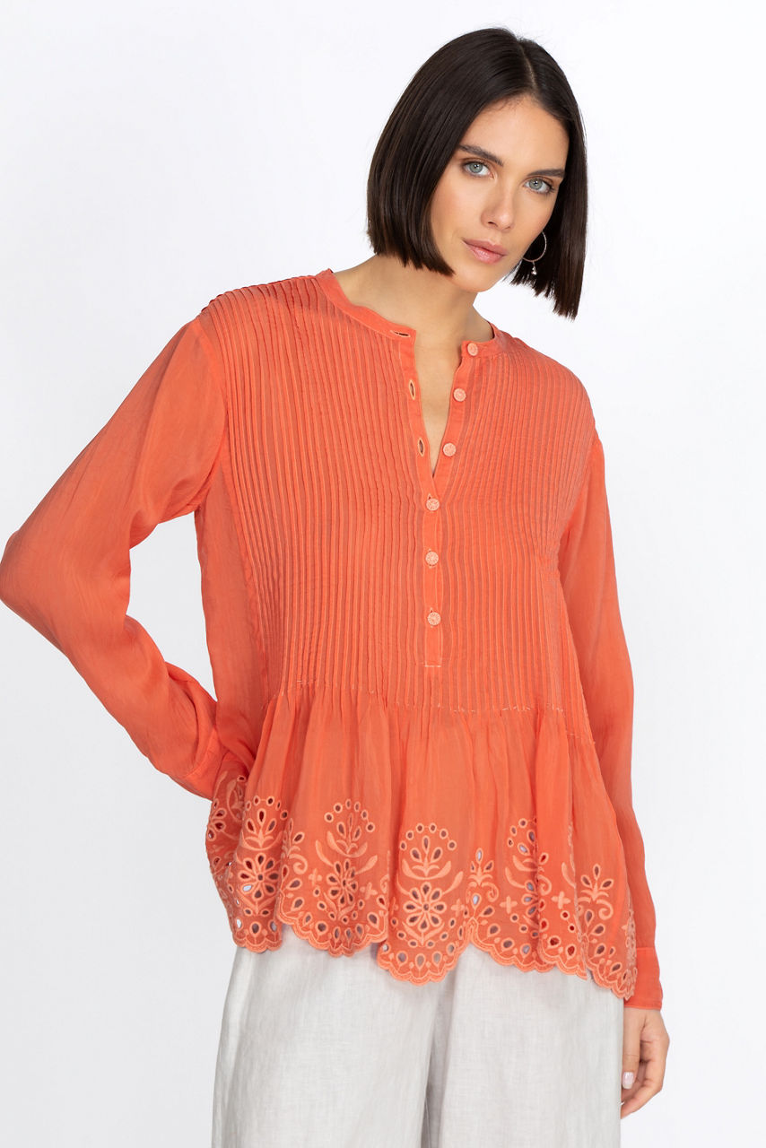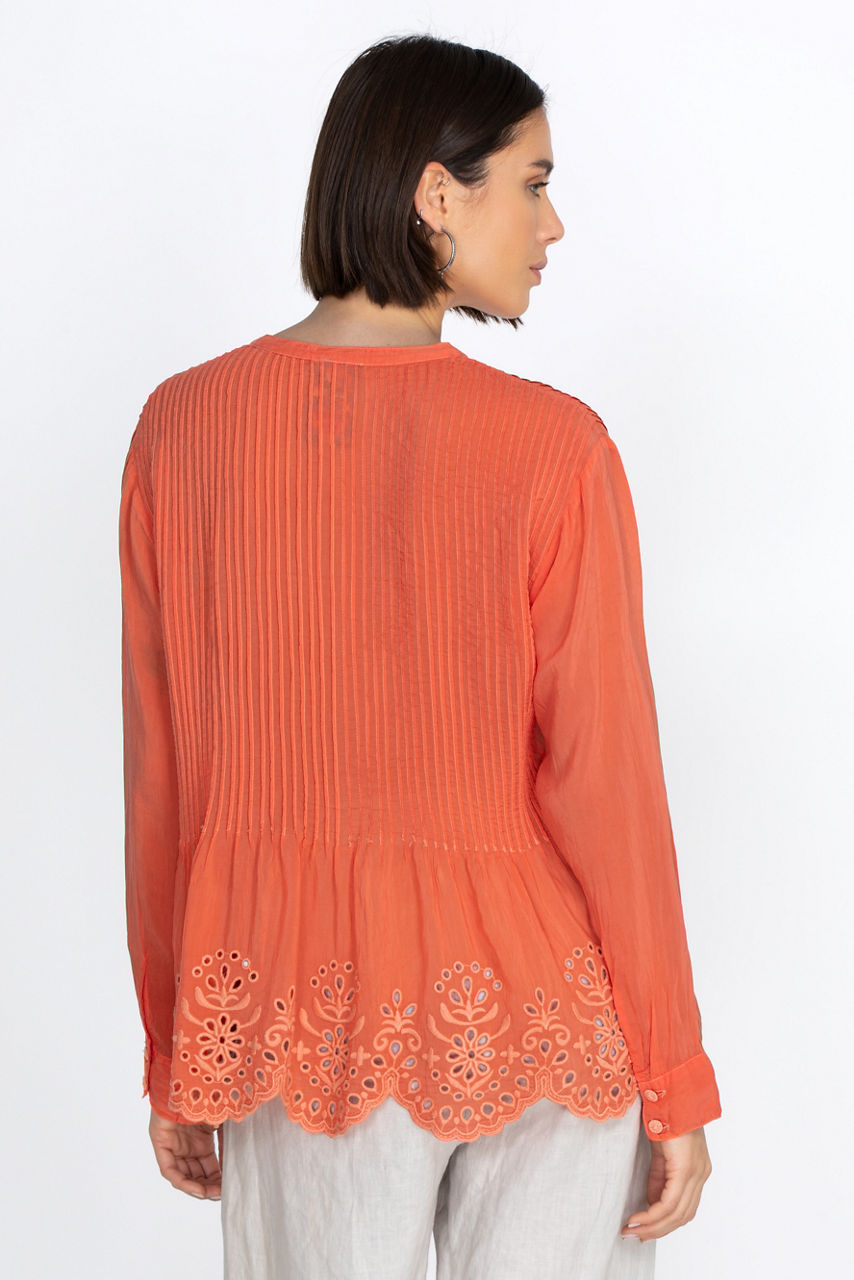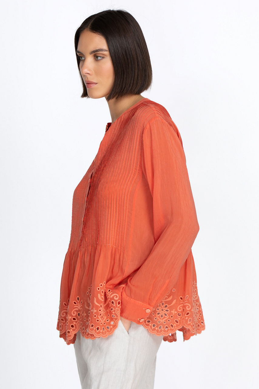 The Leonie Pintuck Blouse puts a modern spin on romanticism. Perfect for weekend lunches and brighter days, this blouse is spun from a soft material and features a round neck, buttoned cuffs and an intricate scalloped, embroidered hem. Style with jeans and flats for a versatile daytime look.