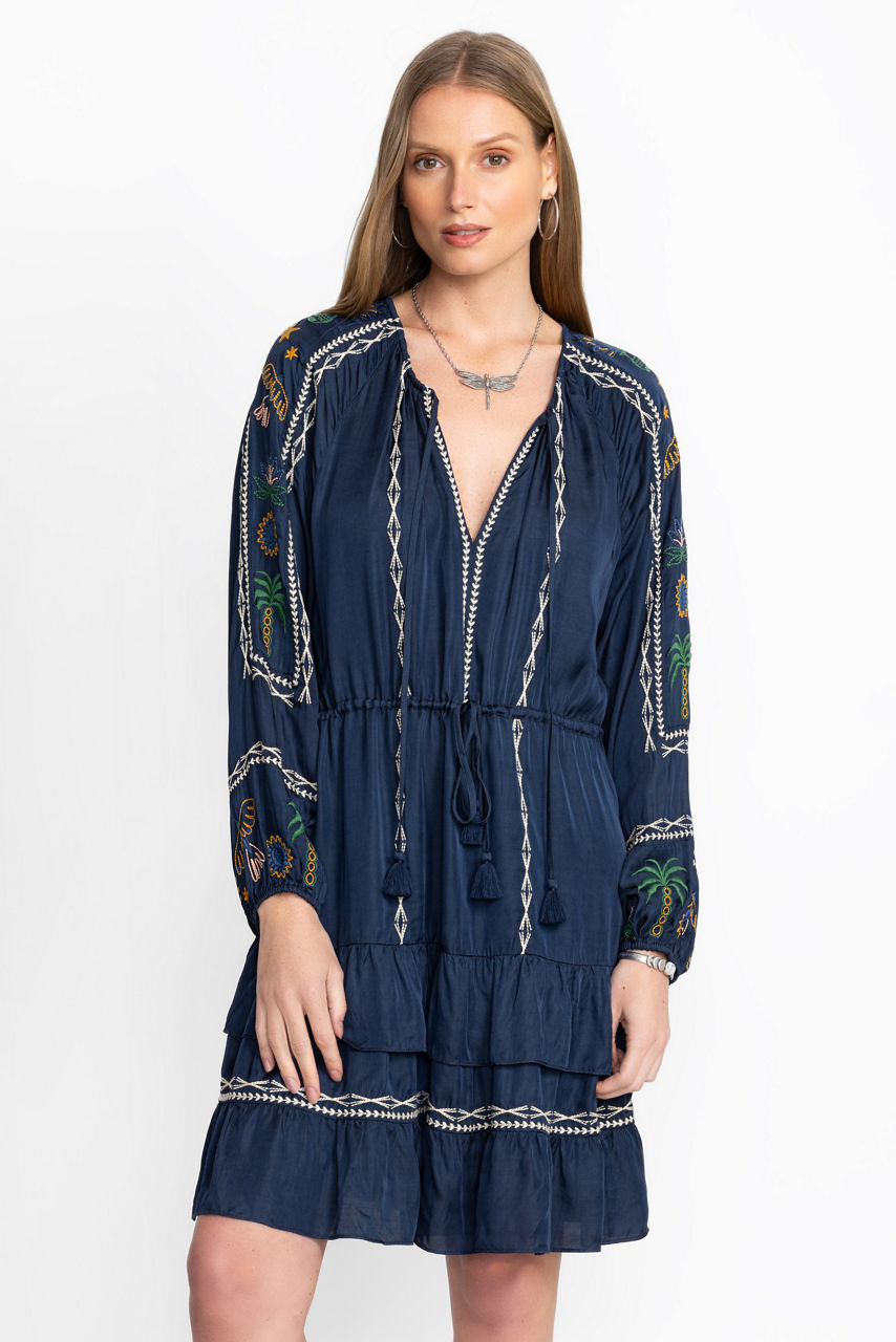 Thoughtfully designed with a distinctly feminine feel, the Lexie Tiered Mini Dress offers a classic silhouette. Featuring a split V-neckline with delicate ties, this dress offers dramatic Bishop sleeves with lace insets and colorful embroidered detailing. Finished with a waist tie and tiered A-line skirt, this dress can be paired with kitten heels and glittering silver jewelry for a polished evening look.
