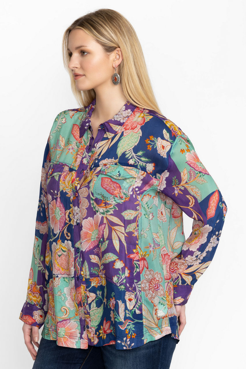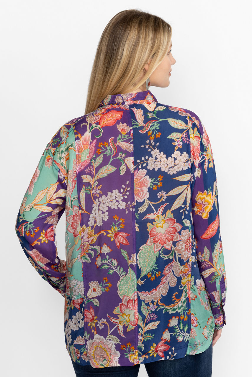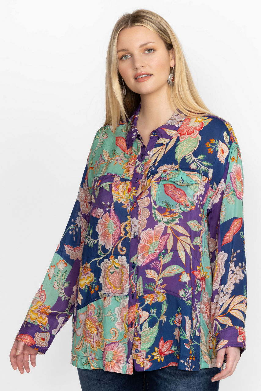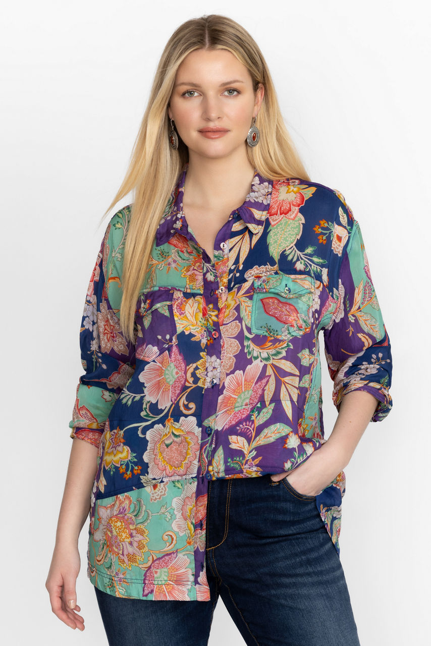 Featuring bold colorful blossoms, the Vivienne Leya Button Up adds versatility and fun to your work wardrobe. Featuring a button front and eye-catching floral pattern, this blouse is finished with delicate fabric covered buttons for added detail. Pair with professional slacks and kitten heels for a perfectly polished workday look.