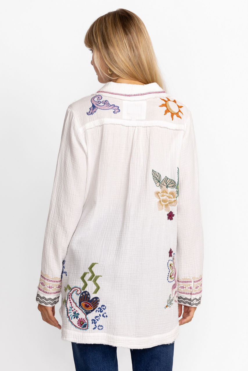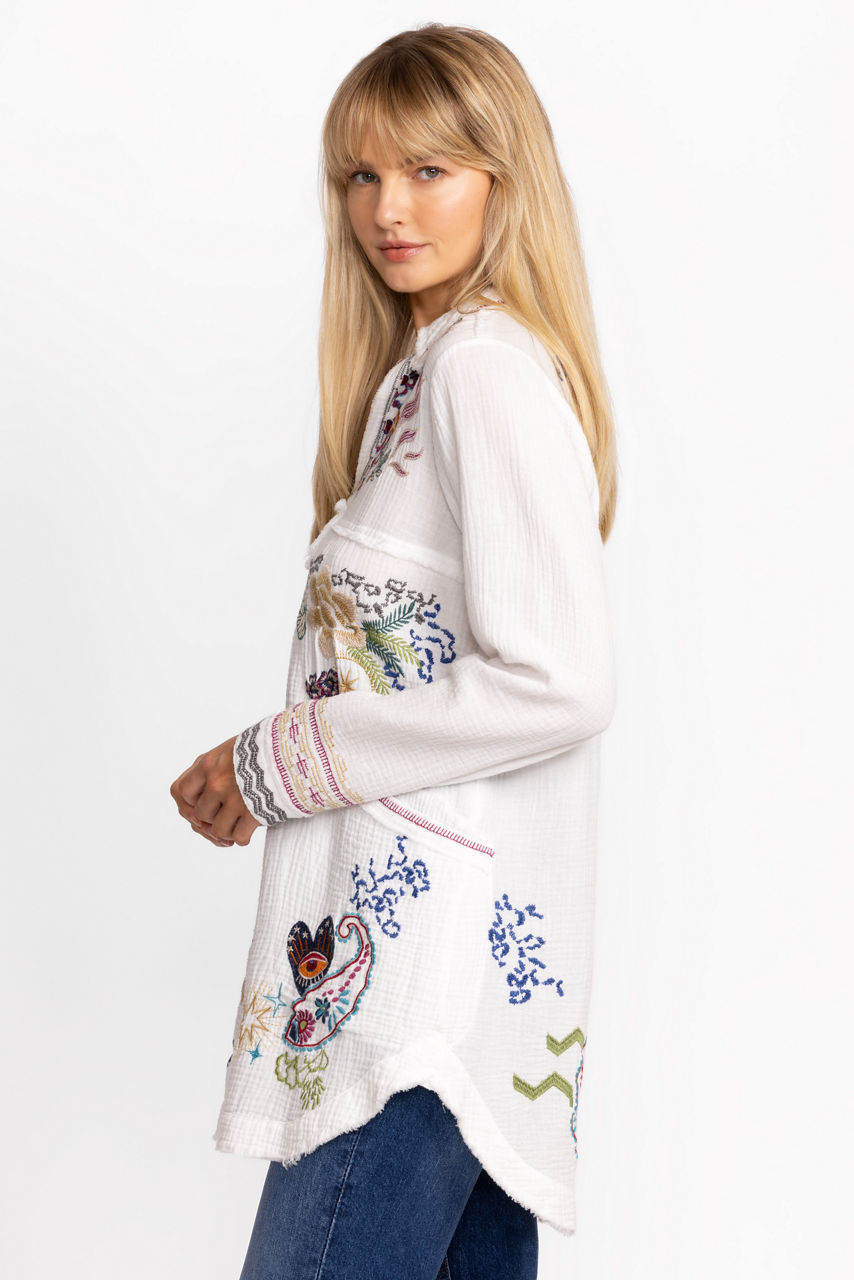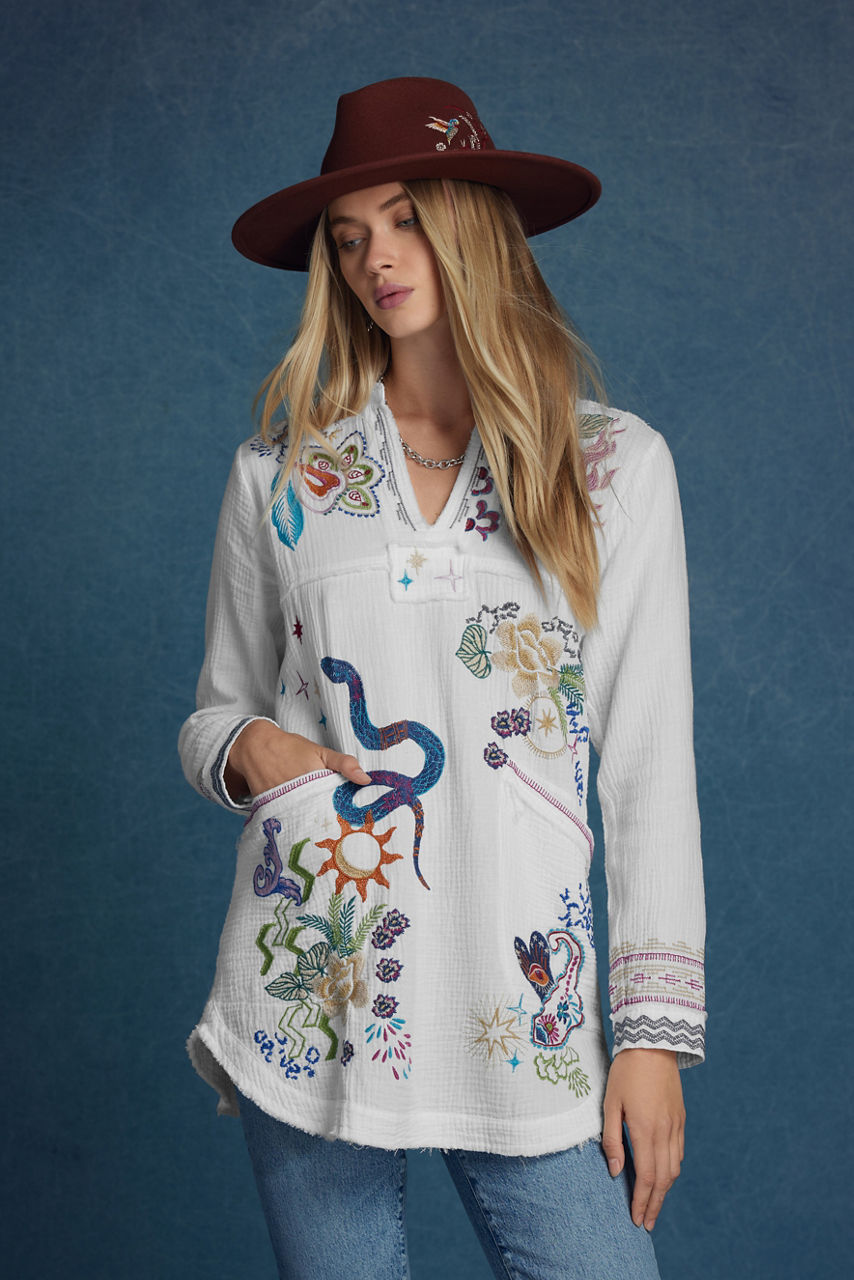 Crafted from 100% breathable cotton, the Leyva Tunic is the perfect combination of comfort and whimsy. Featuring a split V-neckline with a classic collar, this shirt is adorned with colorful placement embroidery and is finished with patch pockets and a shirttail hem. Pair with fitted leggings and leather flats for a retro-inspired casual look.