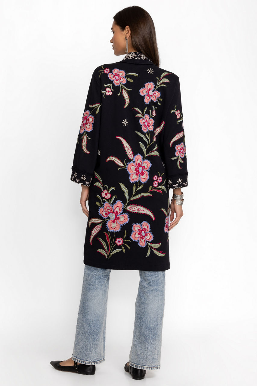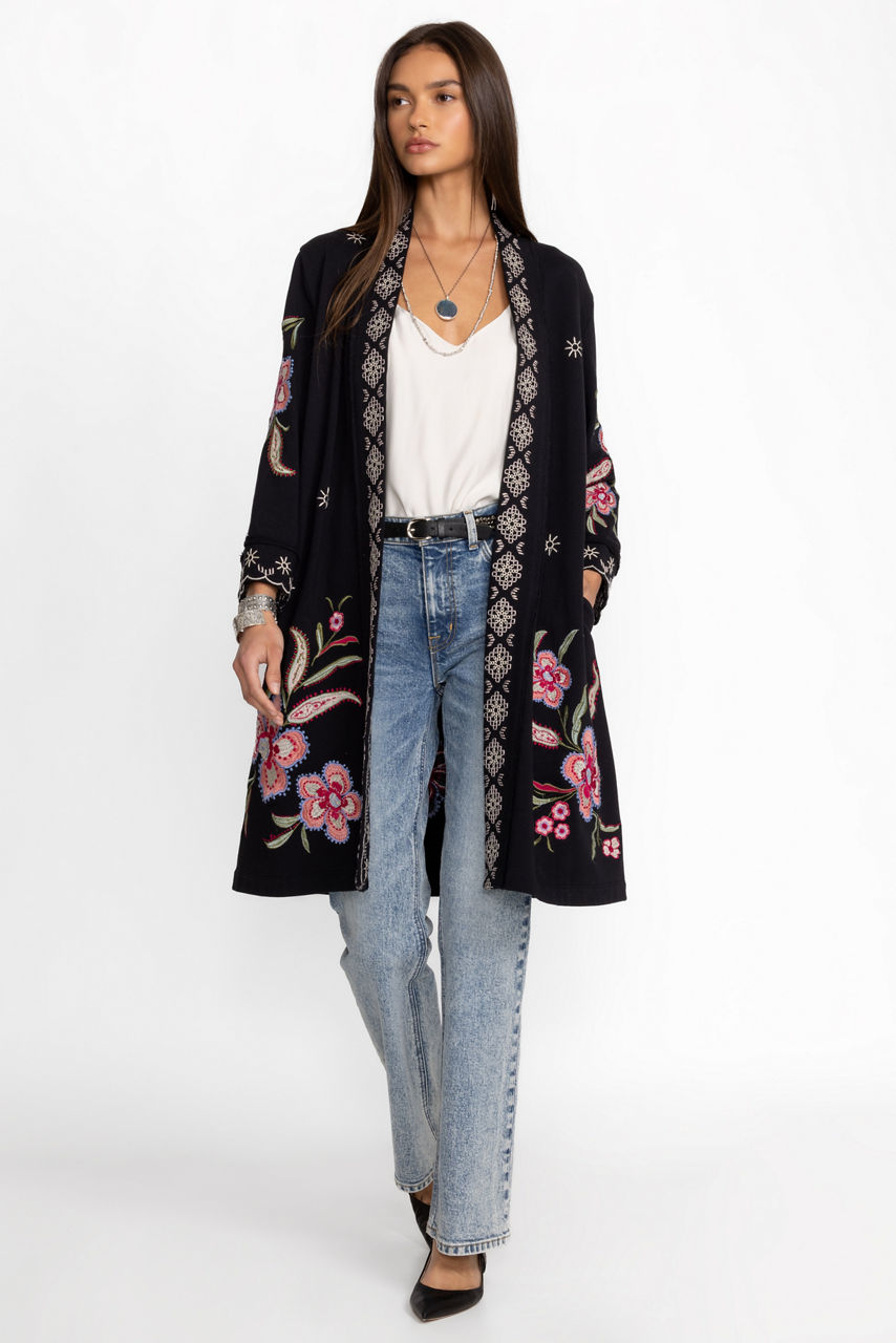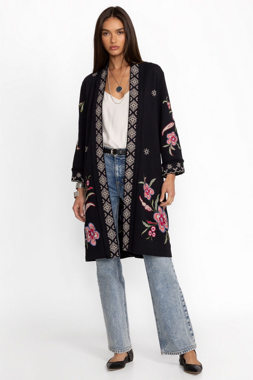 Beautifully detailed with vibrant blooms, the Libbi French Terry Kimono Coat creates a stunning outer layer. Crafted from 100% cotton and adorned with delicate placement embroidery, this coat features an open front and side pockets. Layer over a fitted midi dress and pair with boots for a polished look ready for a night out.