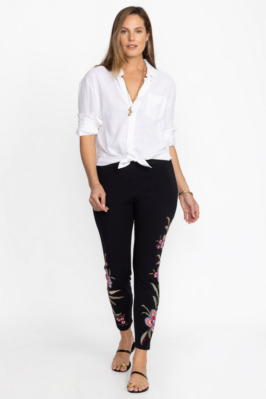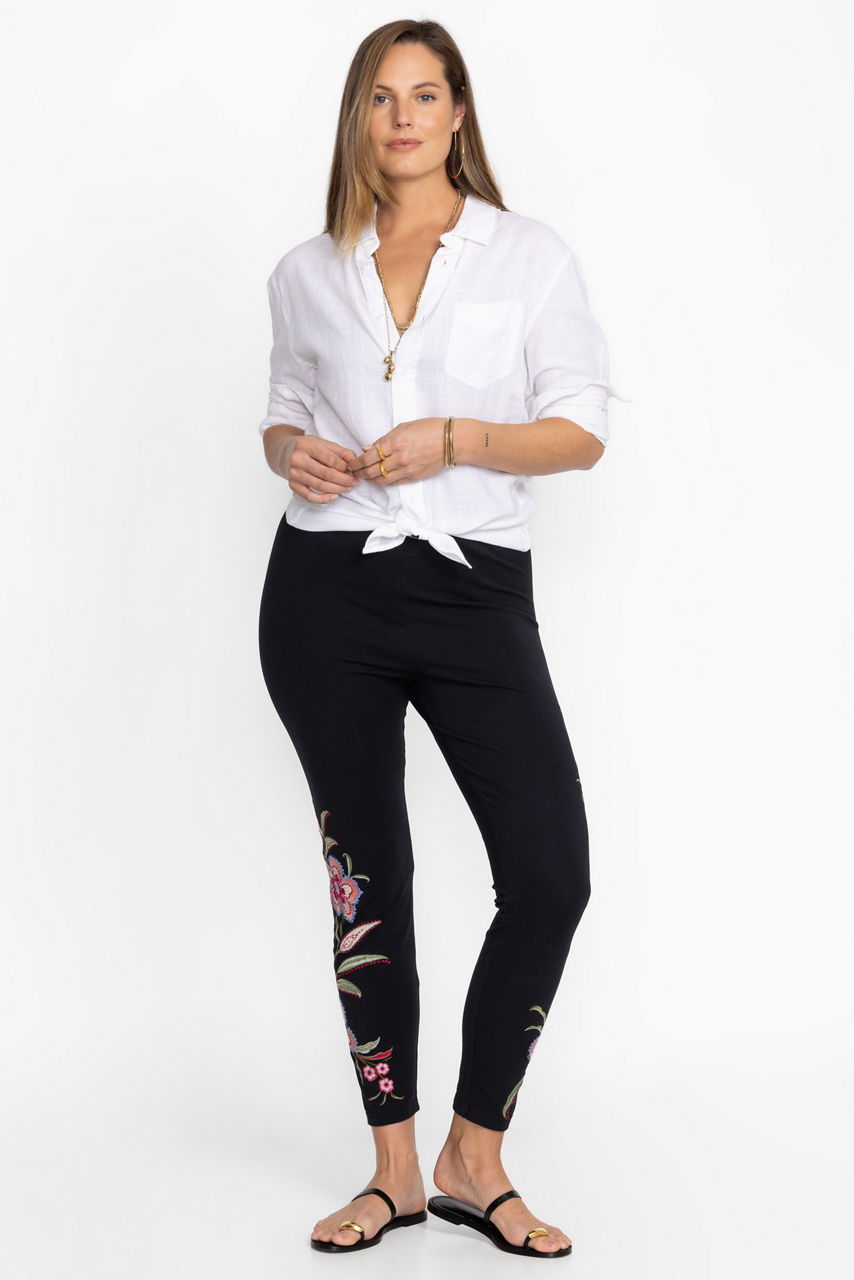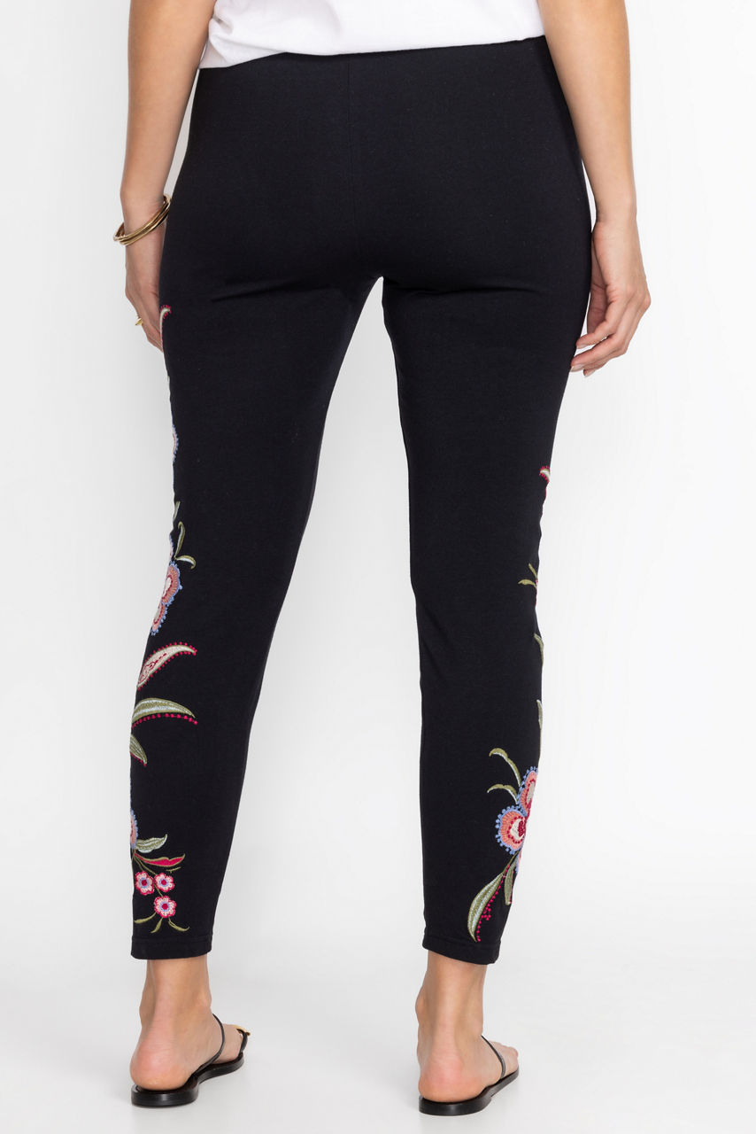 Thoughtfully crafted with style and comfort in mind, the Libbi Leggings feature bold floral blooms for a pop of color. Crafted from a cotton blend with a hint of stretch, these leggings offer an elastic waist and vibrant placement embroidery for an elevated casual look. Pair with a black turtleneck and layer with the Libbi French Terry Kimono for a coordinated ensemble.