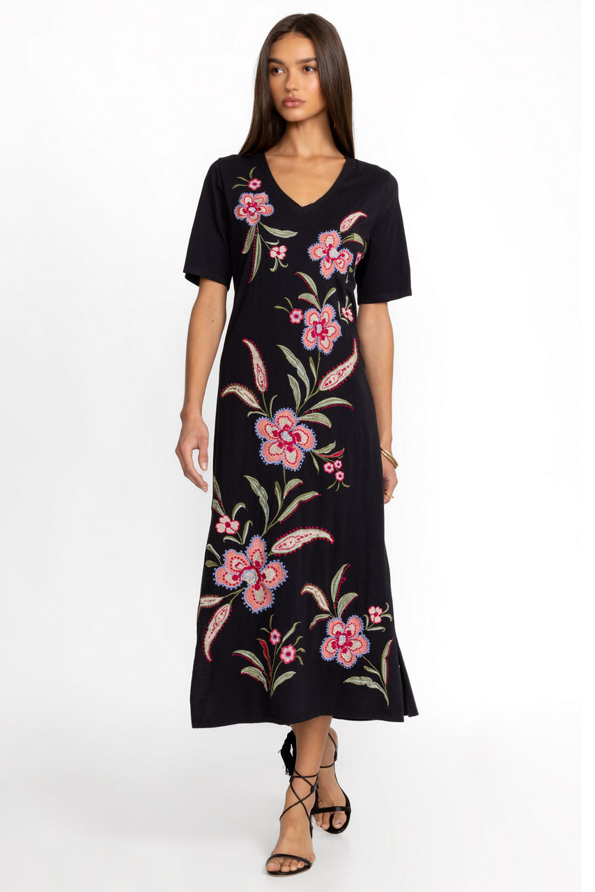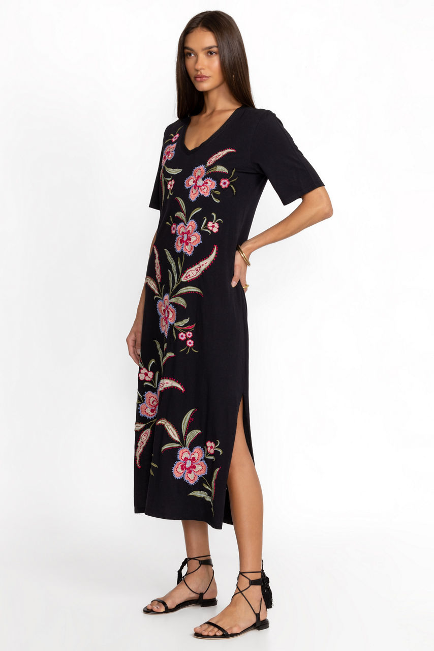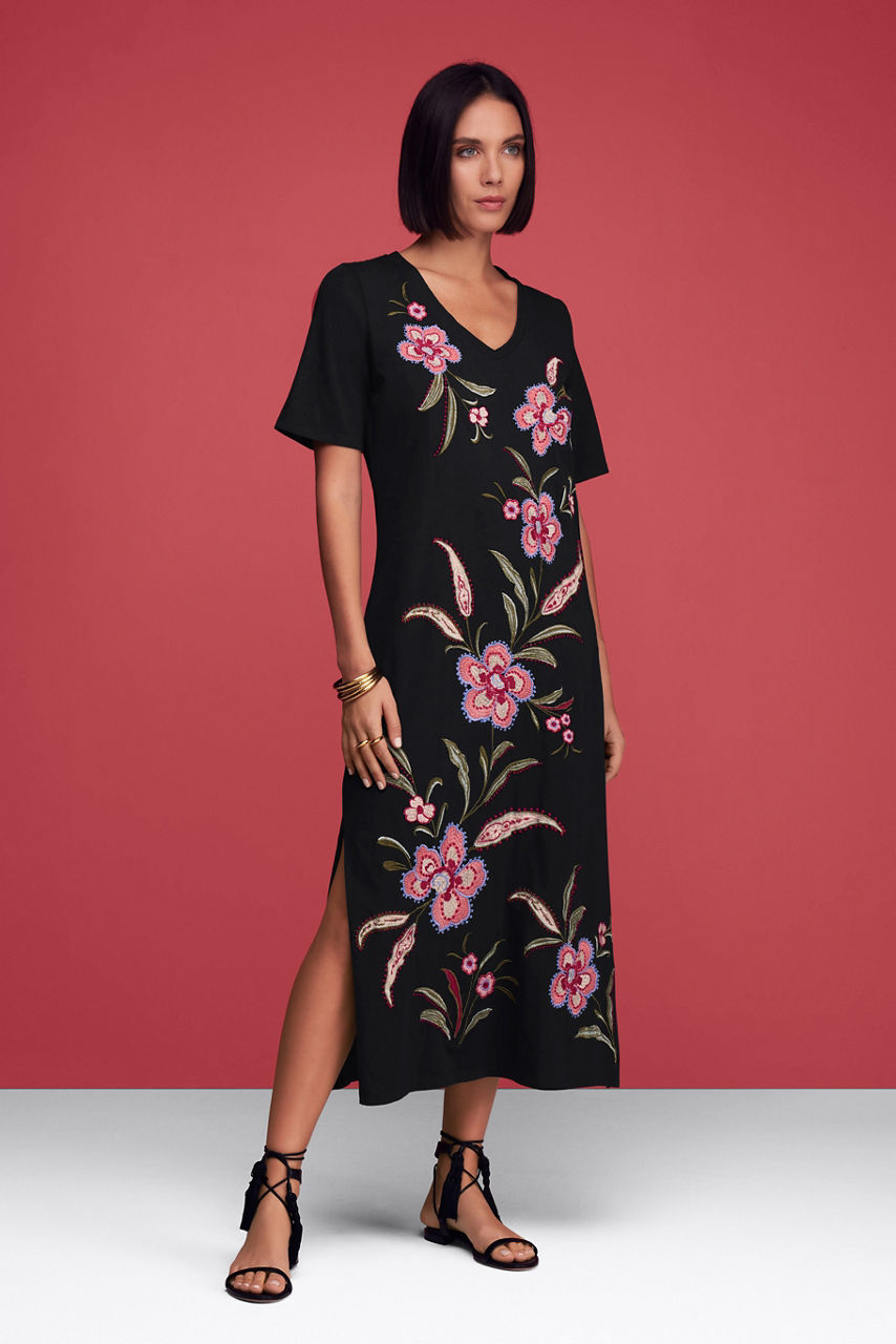 Crafted from 100% breathable cotton, the Libbi Trapunto T-Shirt Dress elevates your casual wardrobe. Featuring a V-neckline and flowing bodice, this dress is adorned at the front and back with intricate placement embroidery depicting vibrant floral blooms. Style with fashion sneakers and a denim jacket for a fun casual pairing.