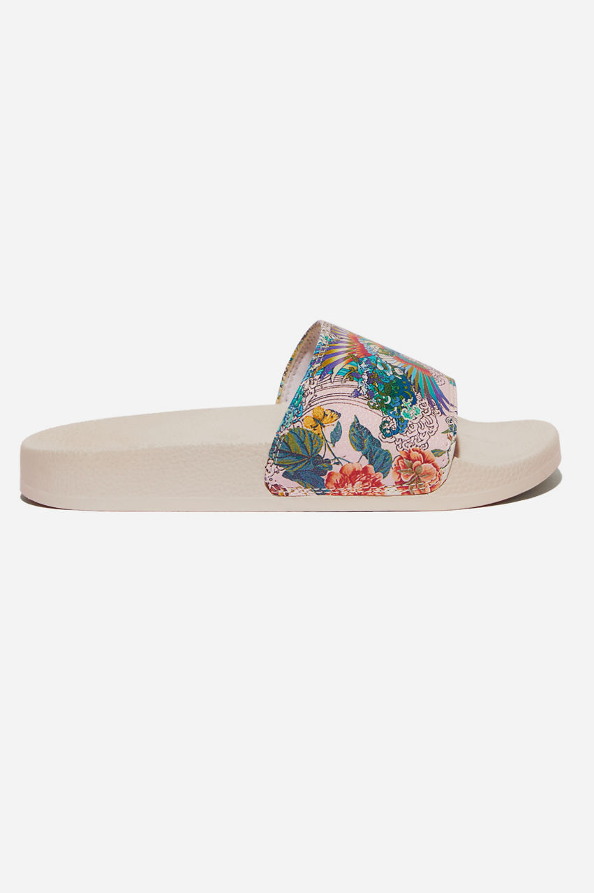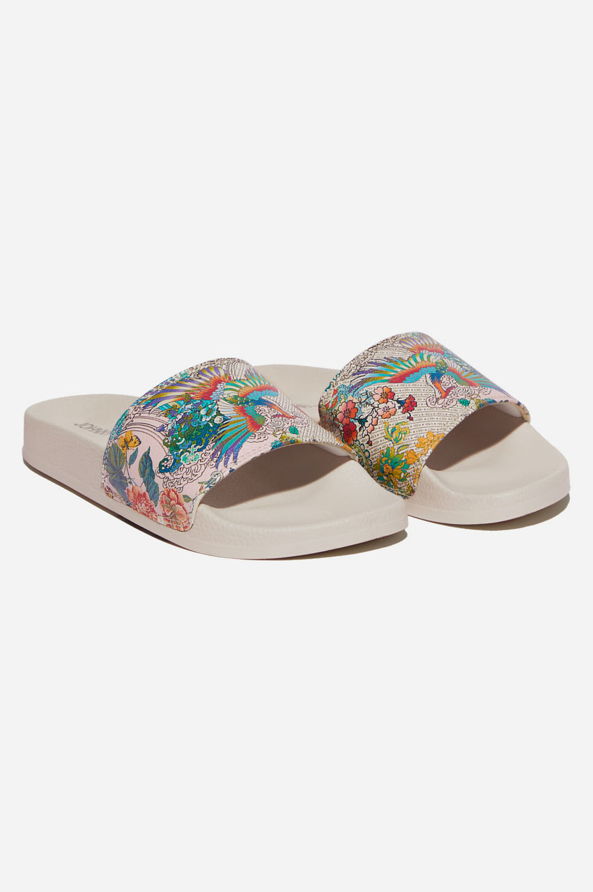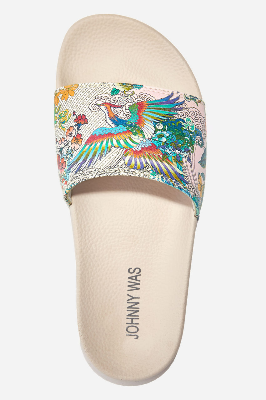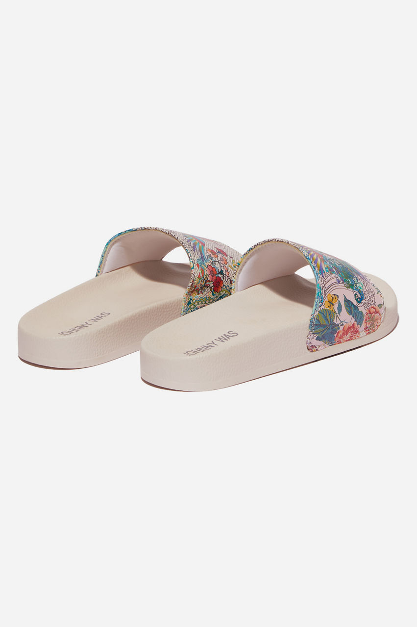 Oh-so-chic and effortlessly on-trend, our Light Dreamer Poolslide is the must-have accessory for summer. These timeless flats are perfect for going from beach to boulevard in a breeze. The whimsical print and bohemian-inspired details can seamlessly tie any warm-weather look together from your favorite bathing suits to beachy linen pants and white tees.