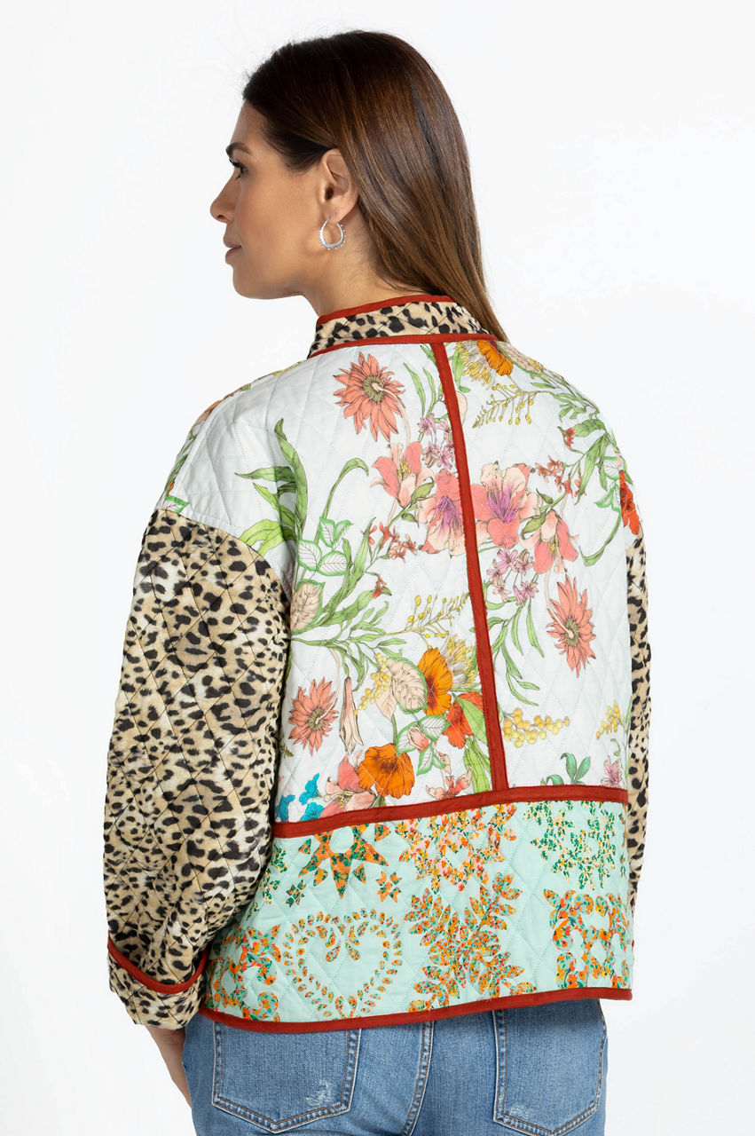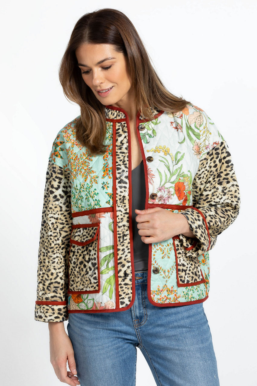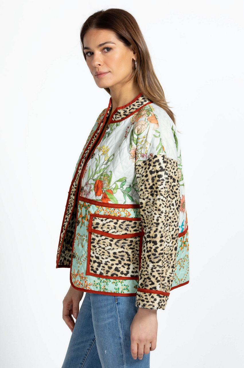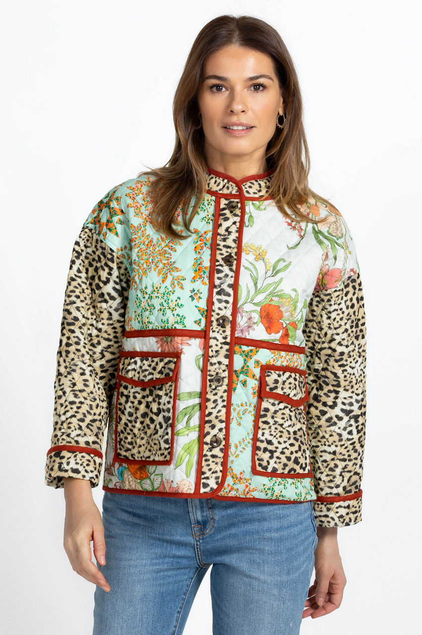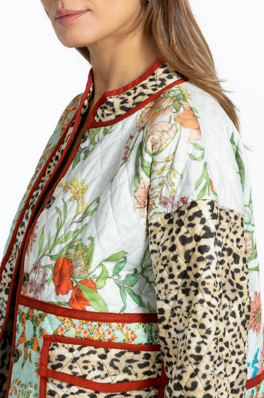 Designed from durable cotton, the Liliana Quilted Patch Pocket Jacket is a luxe take on a practical trans-seasonal silhouette. Cut in a regular fit, this jacket features a round neck, a front button closure, long sleeves, and striking leopard print trims. Enhanced by a quilted effect and a contrast blossoming floral print, this jacket can be styled with everything from denim to loungewear.