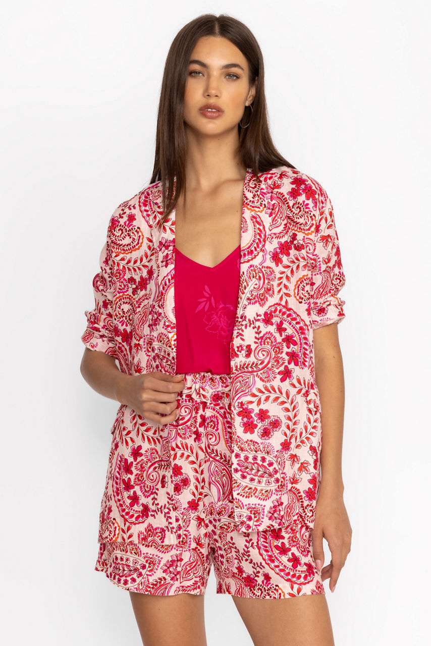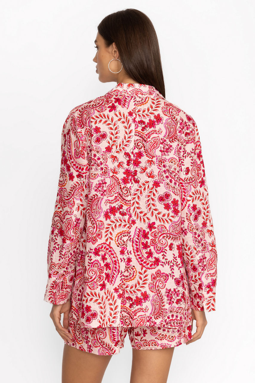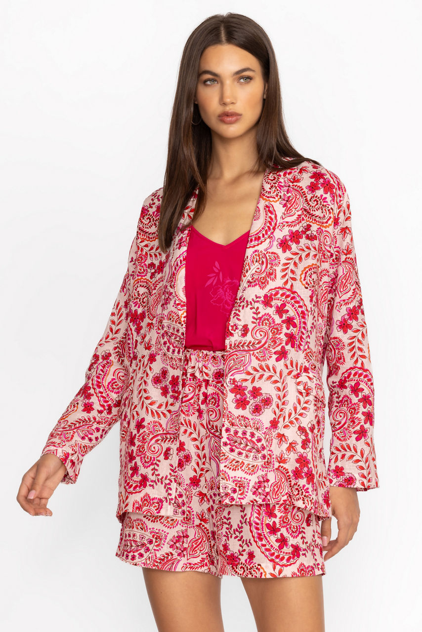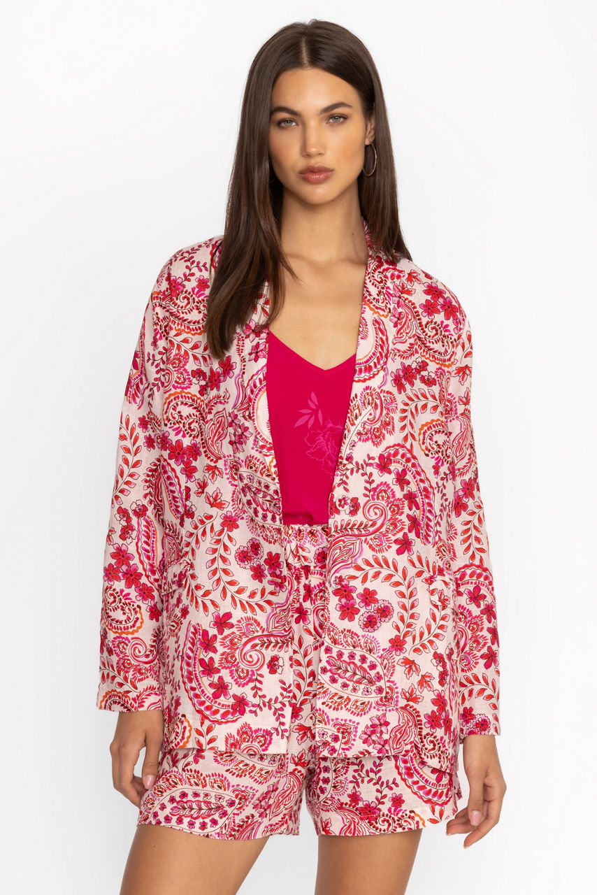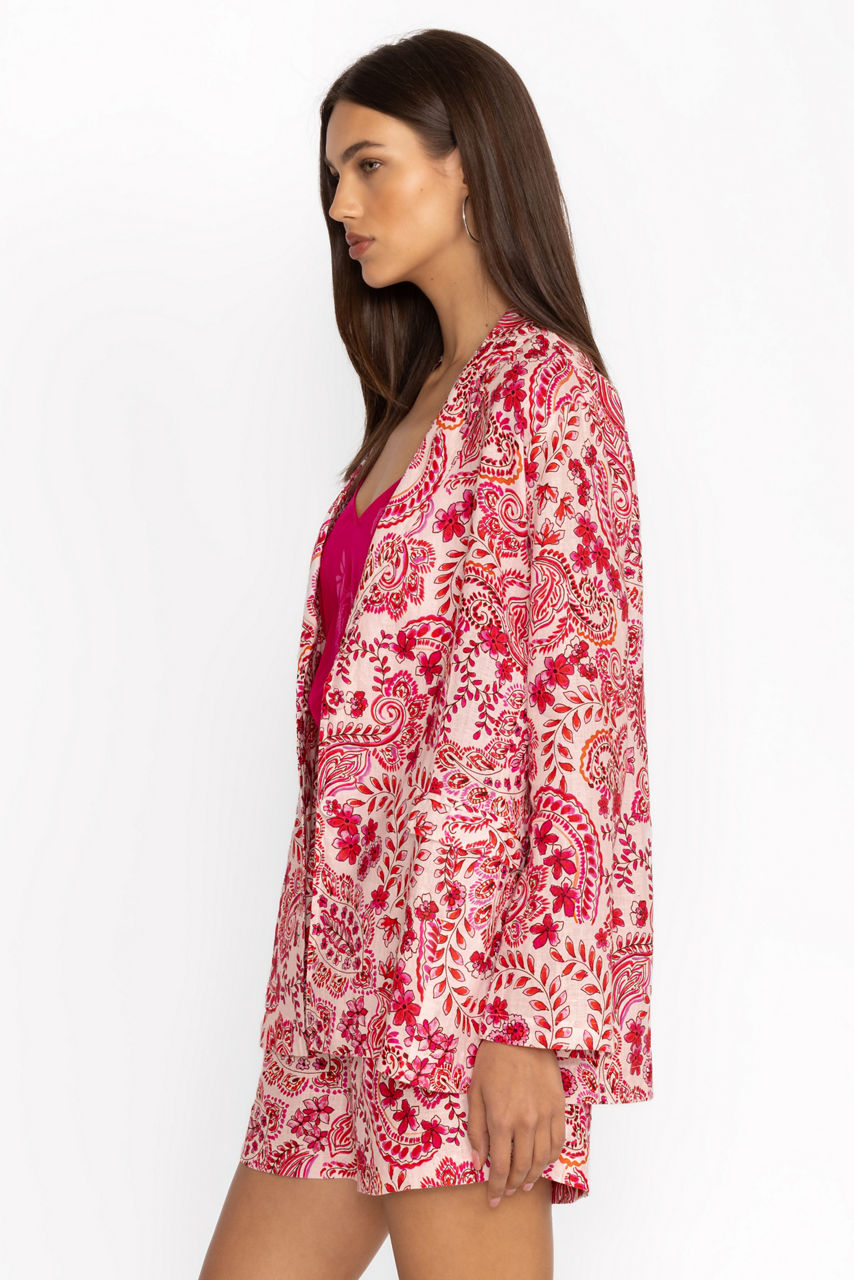 Bold and rich in vibrant color, the Lillet Linen Blazer is crafted from 100% breathable linen. Featuring an open lapel and notched collar, this brilliant blazer offers chic fabric covered buttons and pocket flaps at the hipline. Layer over the Etta Silk Cami and pair with white linen trousers of an elevated work look with unmistakable style.