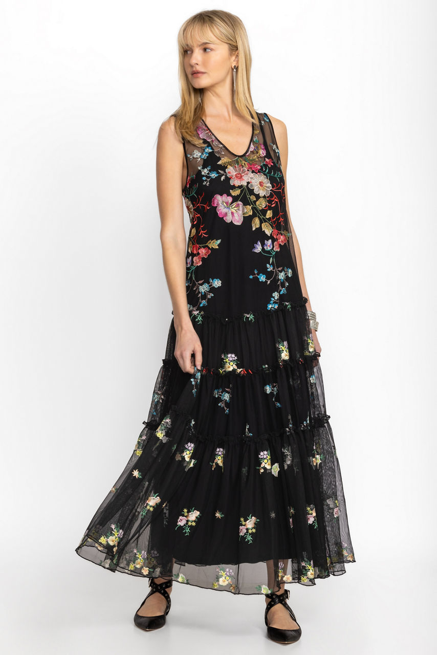 Beautifully detailed with vibrant blooms, the Liliana Mesh Dress is perfect for the warmer season. Featuring a V-neckline and fitted bodice, this sleeveless maxi dress is adorned with colorful placement embroidery for a timeless look. Pair with espadrille sandals and add a colorful clutch for a date night ensemble.