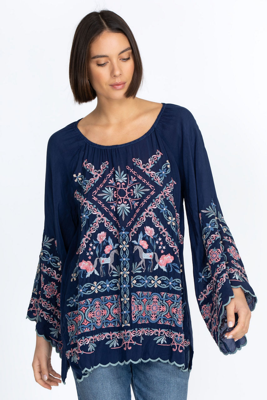Part whimsical, part ethereal, the Lina Tunic is an effortless choice for laid-back occasions. Designed from floaty rayon, this tunic is defined with a detailed floral embroidery and finished with scalloped edges. Style with jeans or team with a breezy skirt for a relaxed take on daytime dressing.