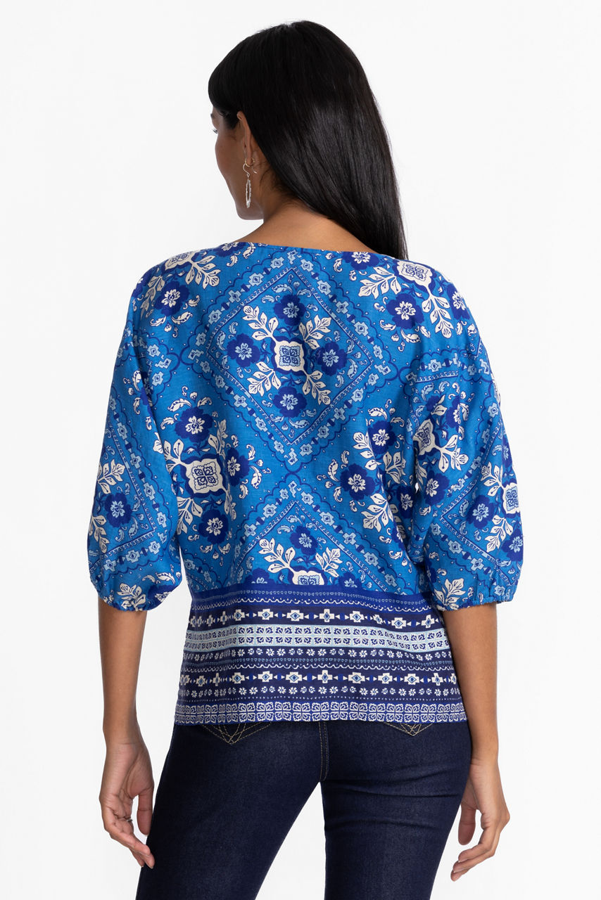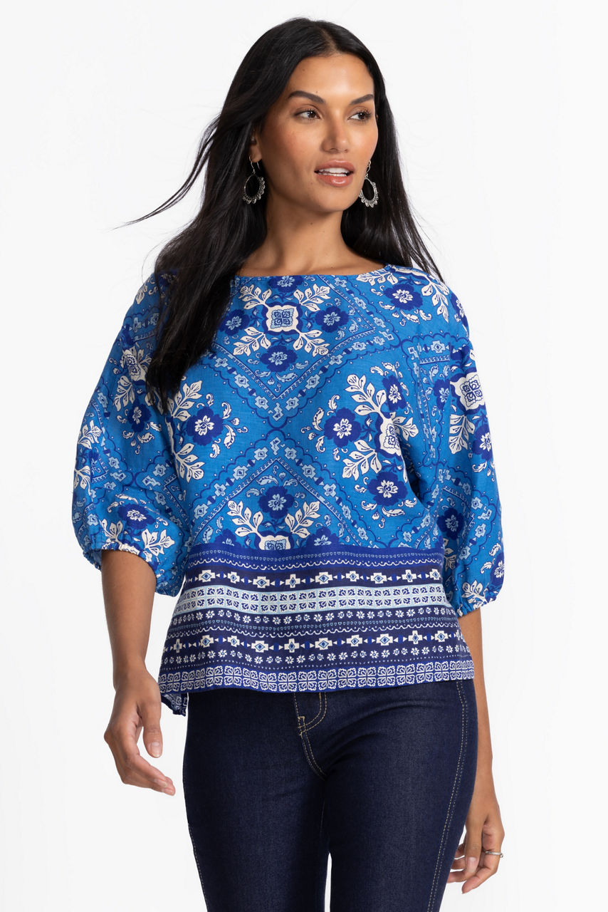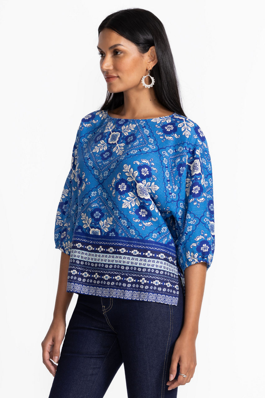 Thoughtfully adorned with a brilliant tile pattern in hues of blue, the Linen Boatneck Blouse is accented by a contrasting stripe at the hemline. Crafted from 100% breathable linen, this lightweight blouse is finished with gently puffed 3/4 sleeves. Pair with white linen pants and mule heels for a resort-ready ensemble.