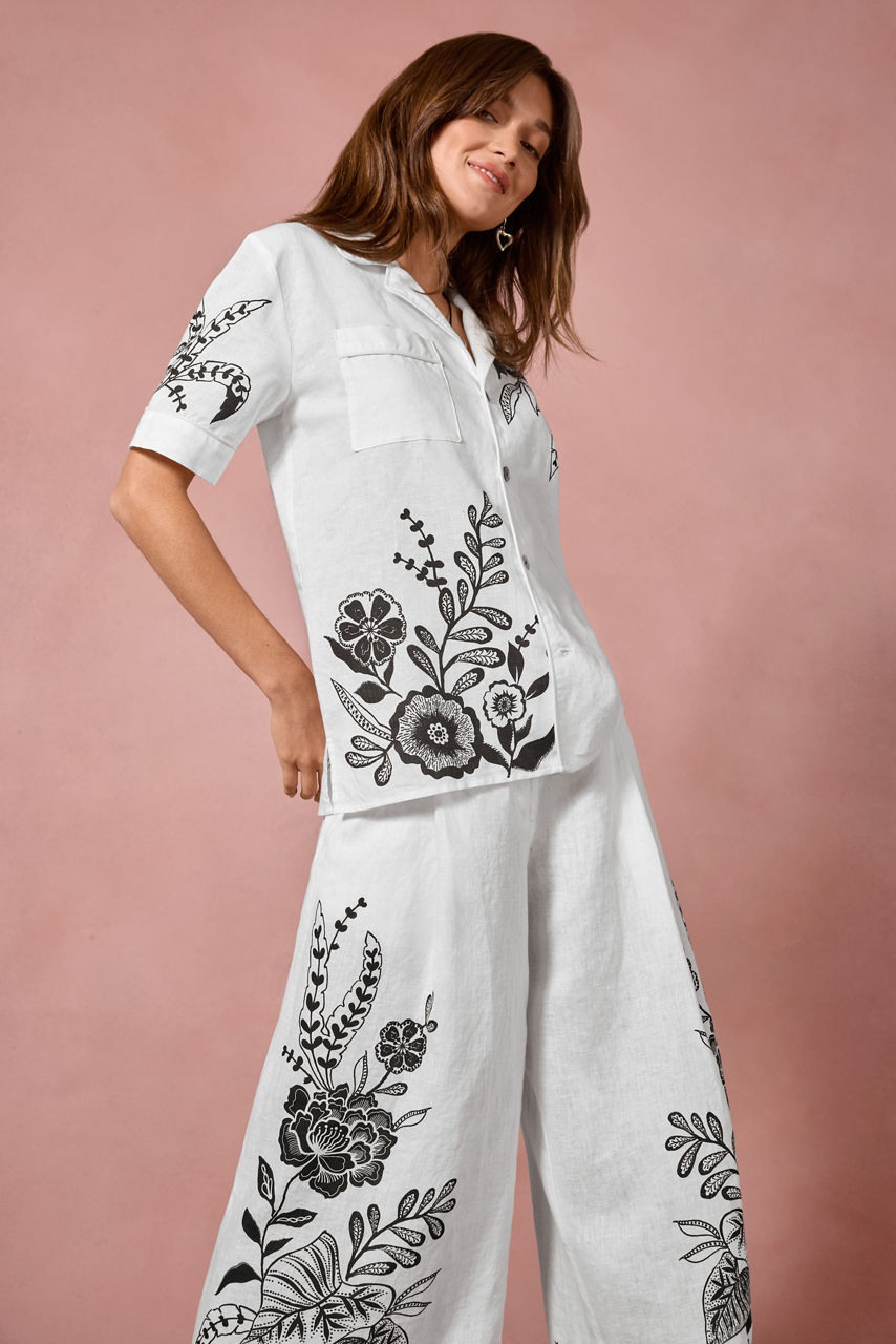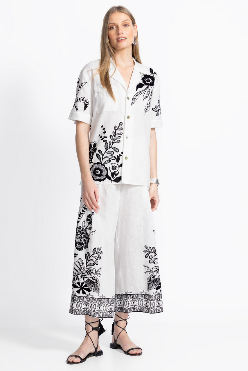 The Linen Camp Shirt is crafted from rich 100% linen. Thoughtfully designed with a convertible collar and a classic button-front this relaxed-fit shirt features stunning embroidered floral detailing and is finished with piping along the edges. Pair with the Ezra Pleated Linen Culottes and black flats for a polished casual look.