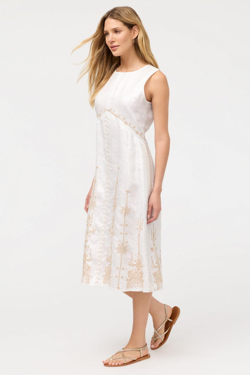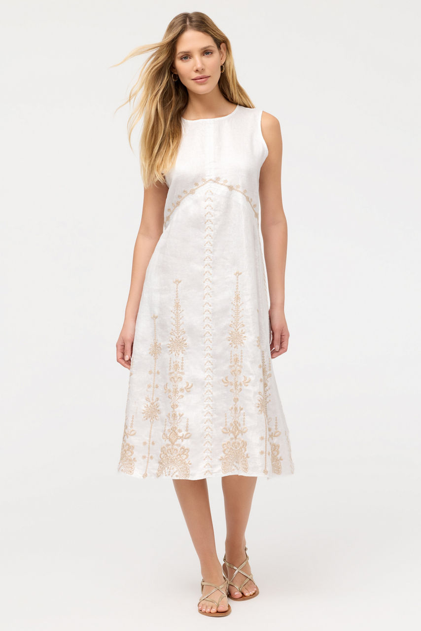 Thoughtfully crafted from 100% breathable linen, the Linen Chevron Midi Tank Dress is offered in ethereal silvery white. Designed with a crew neckline and a keyhole at the back, this sleeveless dress is finished with an eye-catching chevron seam at the bodice for a unique look. Pair with espadrille wedges and a wide-brim sun hat for a walk in the sun.