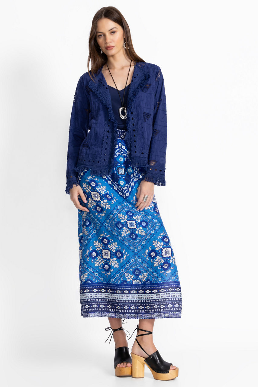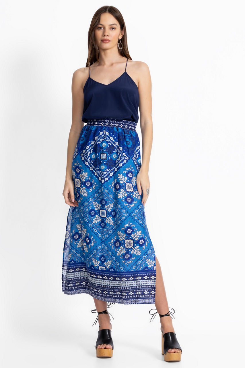 Beautifully embellished with an intricate tile print in hues of blue, the Linen High Slit Skirt is equally stylish and comfortable. Crafted from 100% linen, this skirt offers an elastic waist and high slits at the sides for a breezy look. Pair with the Linen Boatneck blouse and glittering silver jewelry for a perfectly coordinated ensemble.