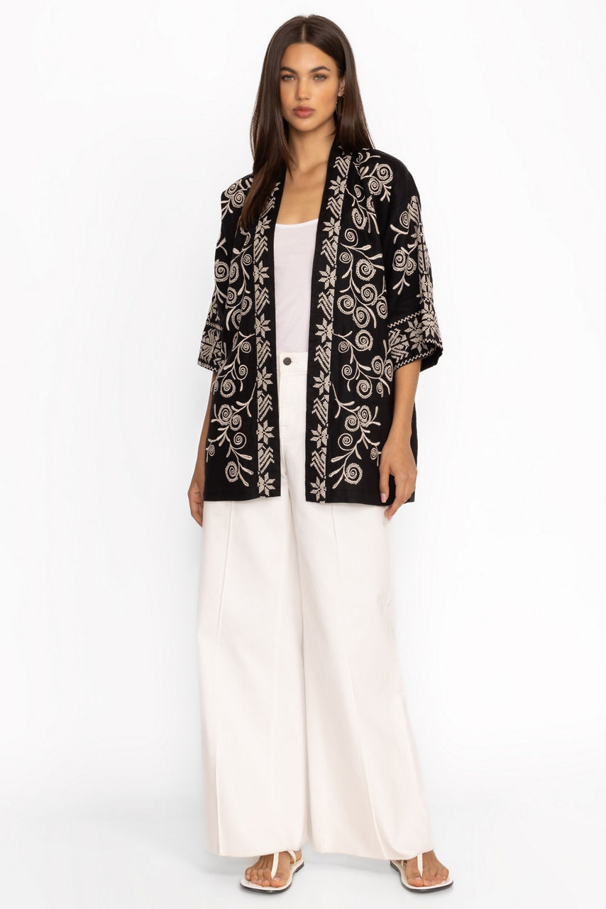 Crafted from 100% breathable linen, the Hannani Shawl Collar Kimono is the perfect top layer for breezy days and nights. Featuring a shawl collar with and open front, this elegant kimono is finished with 3/4 sleeves and side seam pockets. Layer over the Etta Silk Cami and pair with easy palazzo linen pants for a timeless casual look.