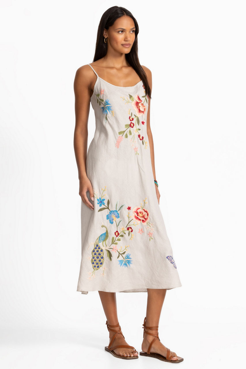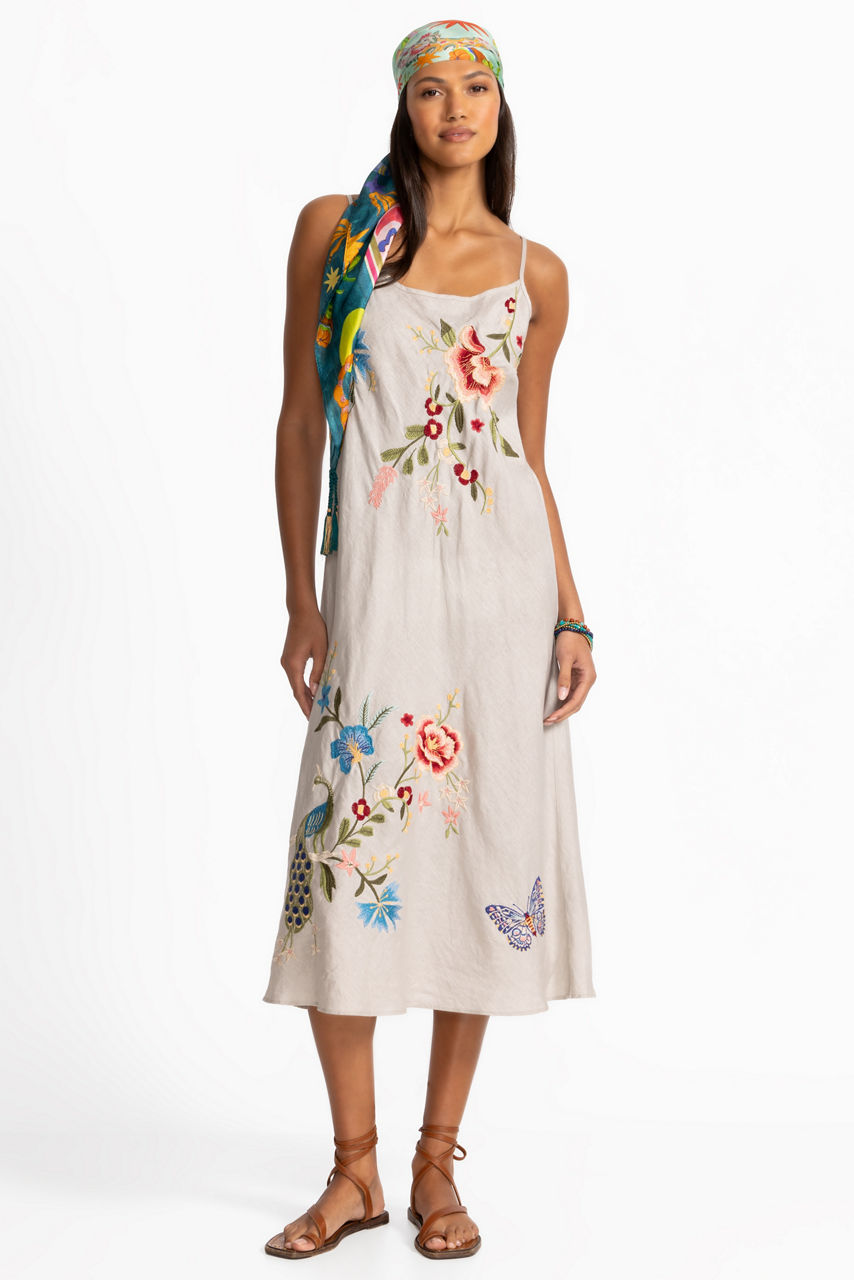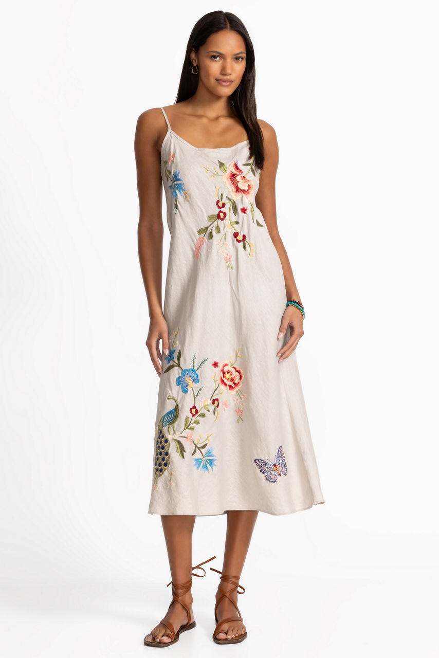 Beautifully embellished with intricate embroidered floral details, with the Linen Modern Slip Dress is crafted from breezy 100% linen. Designed with a scooped neckline and adjustable spaghetti straps, this slip dress offers a bias cut slip silhouette. Pair with delicate jewelry and a fringe scarf for an evening out.