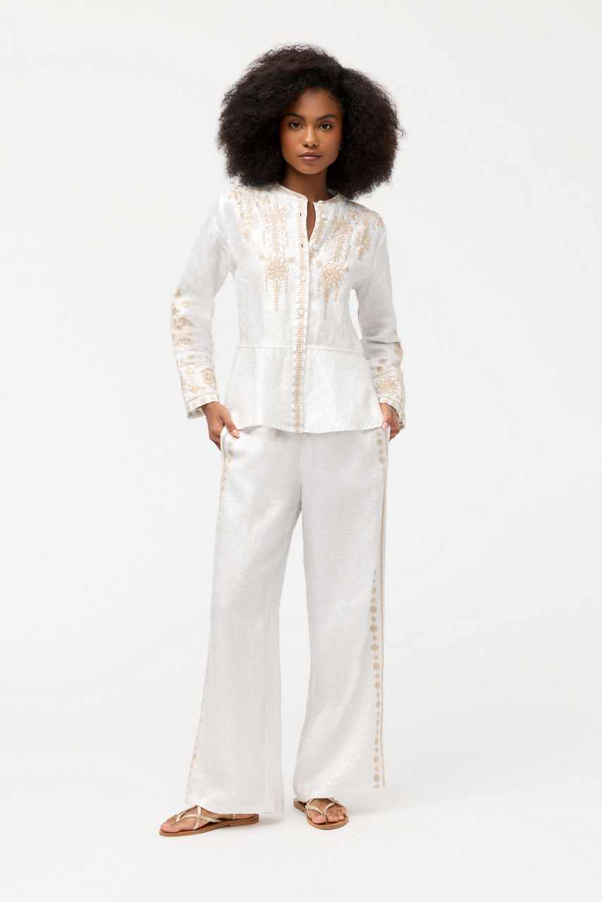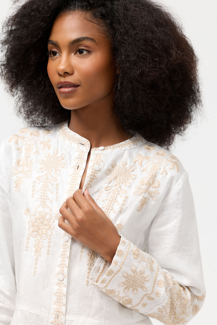 Crafted from 100% breathable linen, the Marik Linen Peplum Jacket blends casual comfort and elevated style. Designed with a button-front and a peplum at the waist, this long sleeve jacket is accented with intricate embroidered detailing. Pair with the Malik Linen Pants and some raffia sandals for a polished finished look.