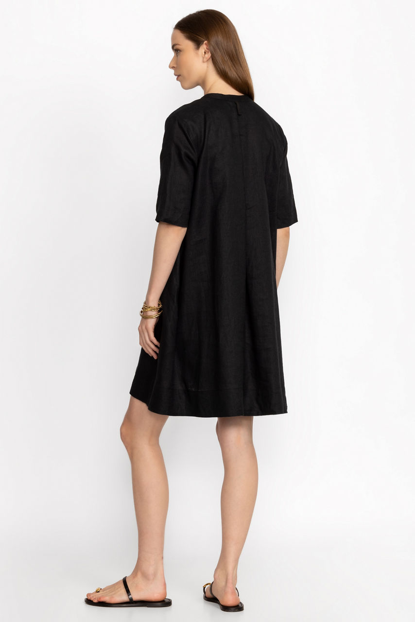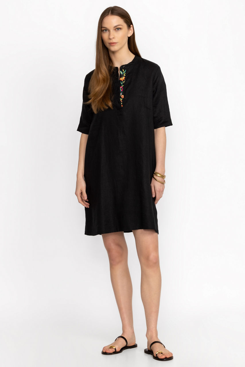 Crafted from 100% breathable linen, the Polo Dress with Mandarin collar is perfect for the warmest days. Featuring a split front Mandarin collar adorned with an intricately embroidered placket, this shift dress features half sleeves and pockets at the sides. Pair with leather sandals and eclectic jewelry for a fresh weekend alternative.