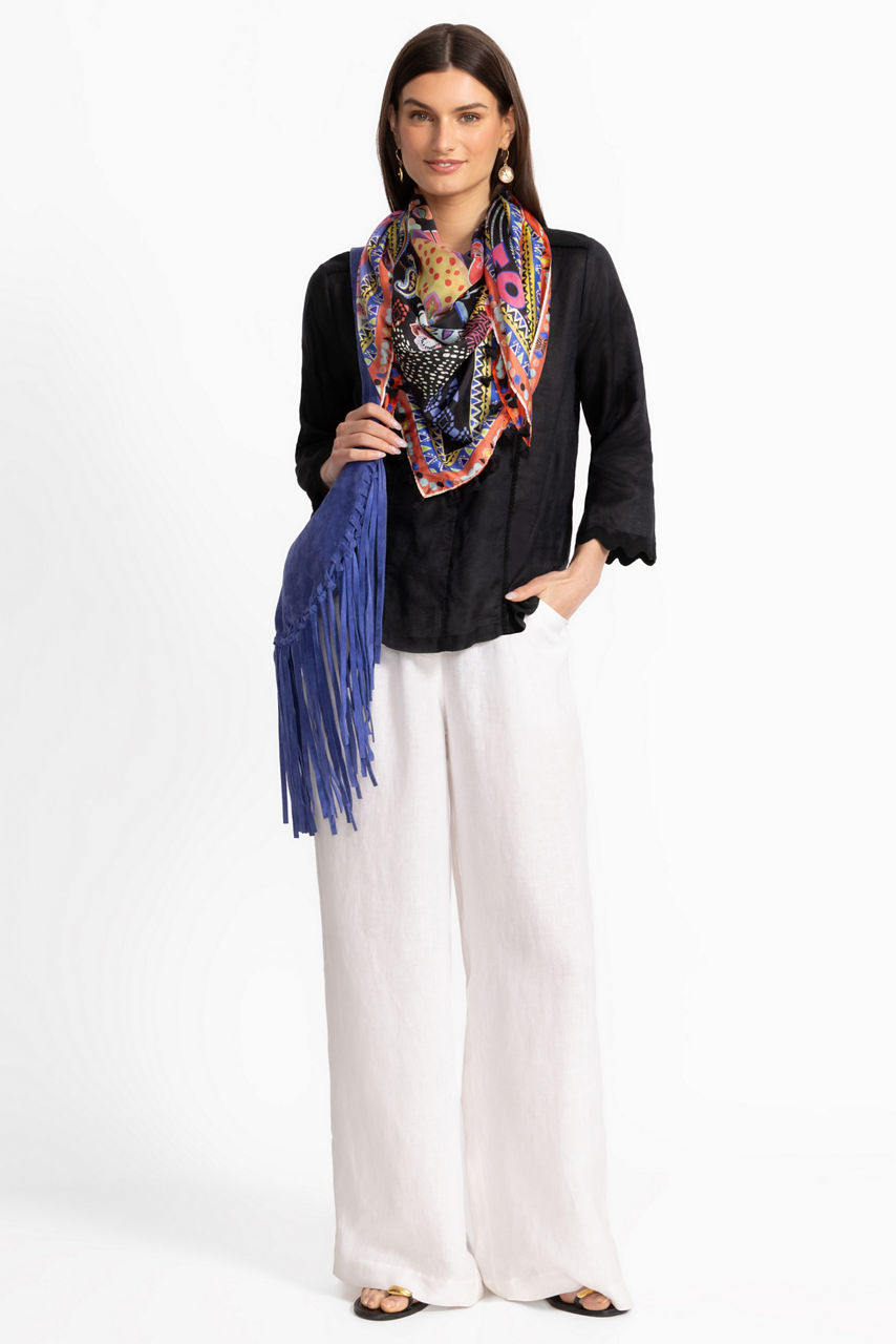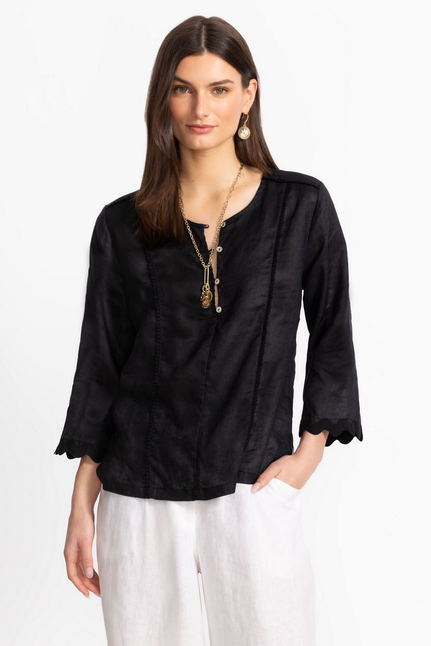 Beautifully crafted from breathable 100% linen, the Linen Princess Seam Top is equal parts casual comfort and elevated style. Designed with a keyhole at the front closure and intricately detailed trim at the seams and sleeves, this top is finished with side slits for a relaxed fit. Pair with contrasting wide-leg linen pants and casual sandals for a resort-ready look.