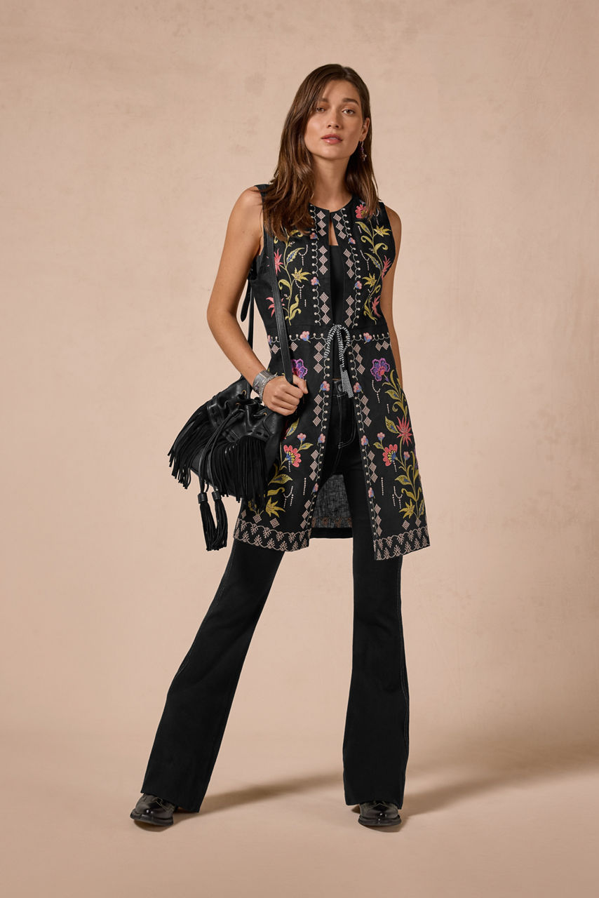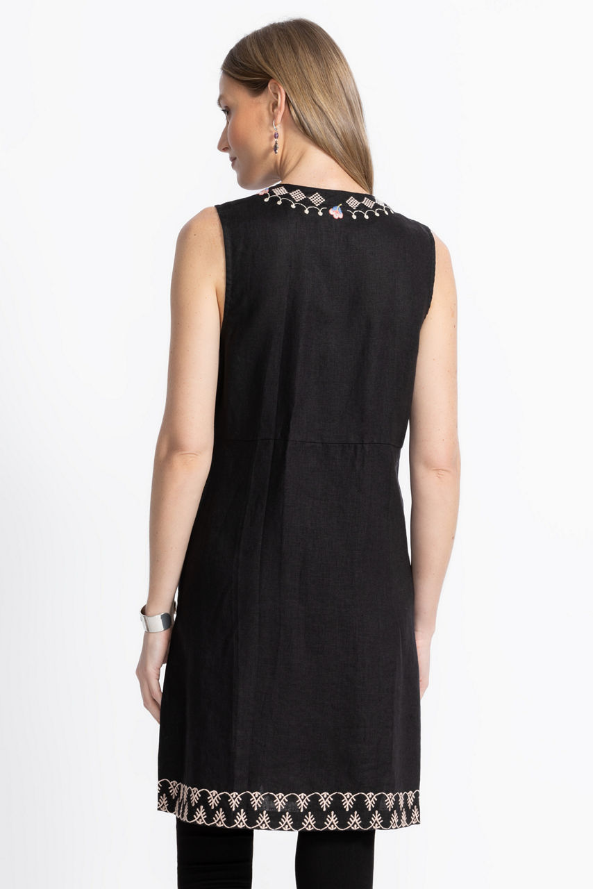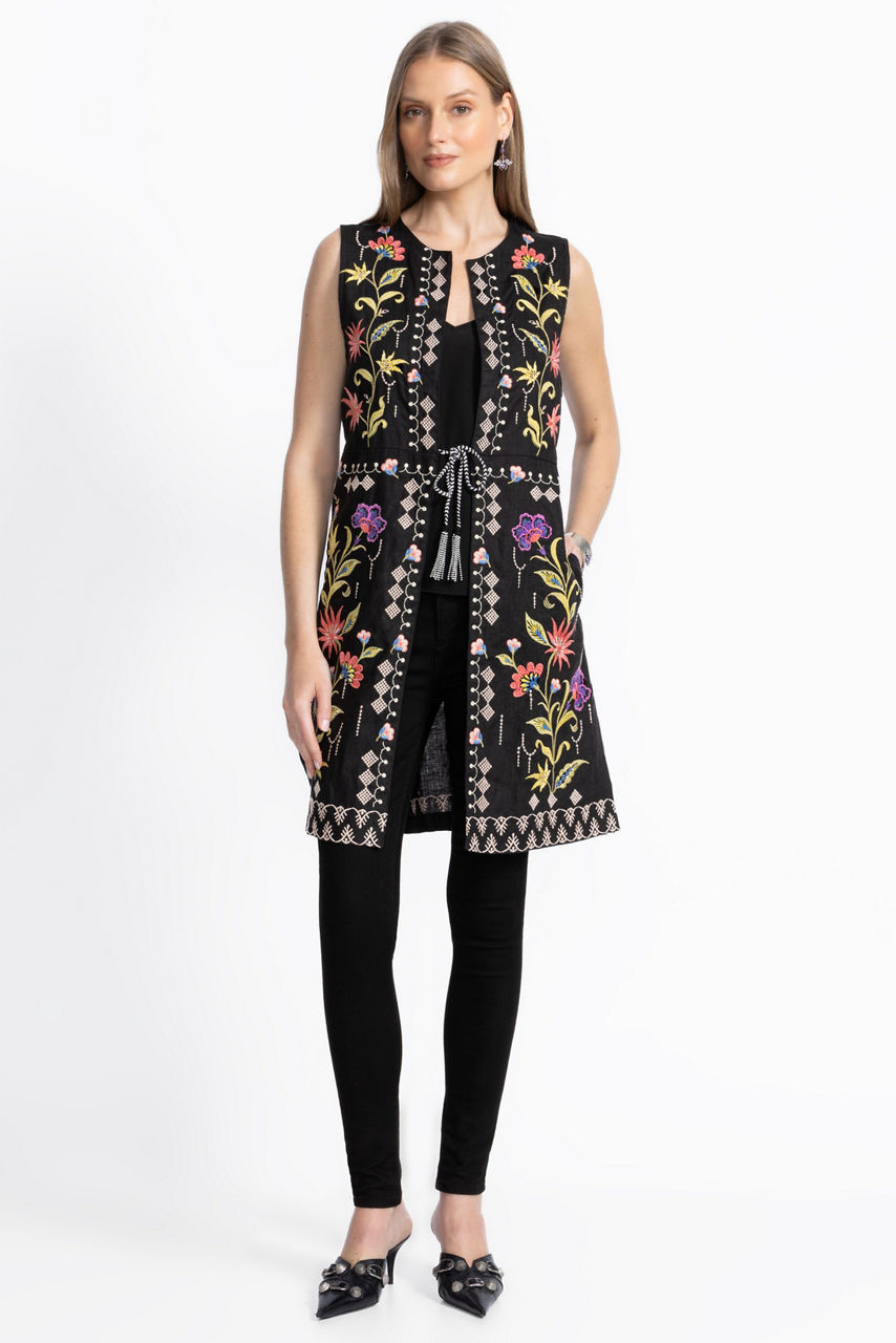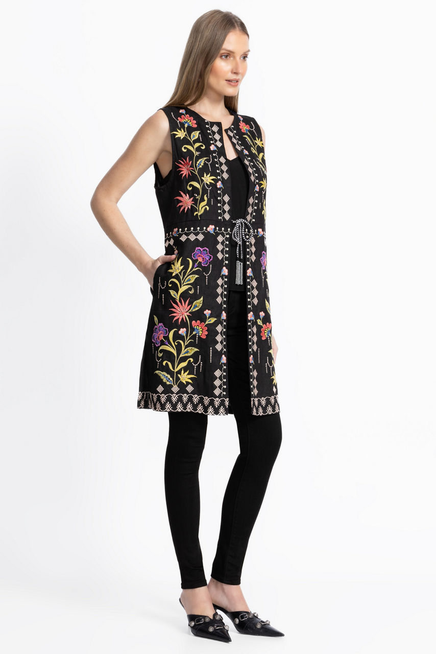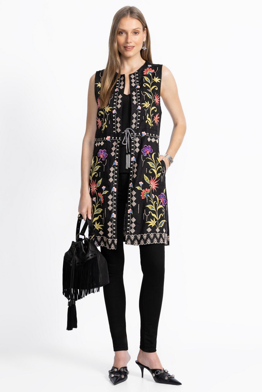 Exceptionally detailed with intricate placement embroidery in vibrant color, the Calista Linen Vest is adorned with a kaleidoscope of floral accents. Crafted from 100% linen, this tunic length vest features a braided tie at the waist finished with eye-catching beaded tassels. Layer over a coordinating long sleeve top and pair with fitted denim for a polished weekend look.