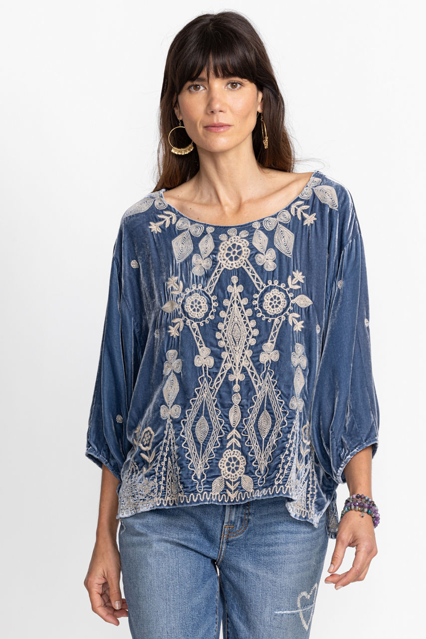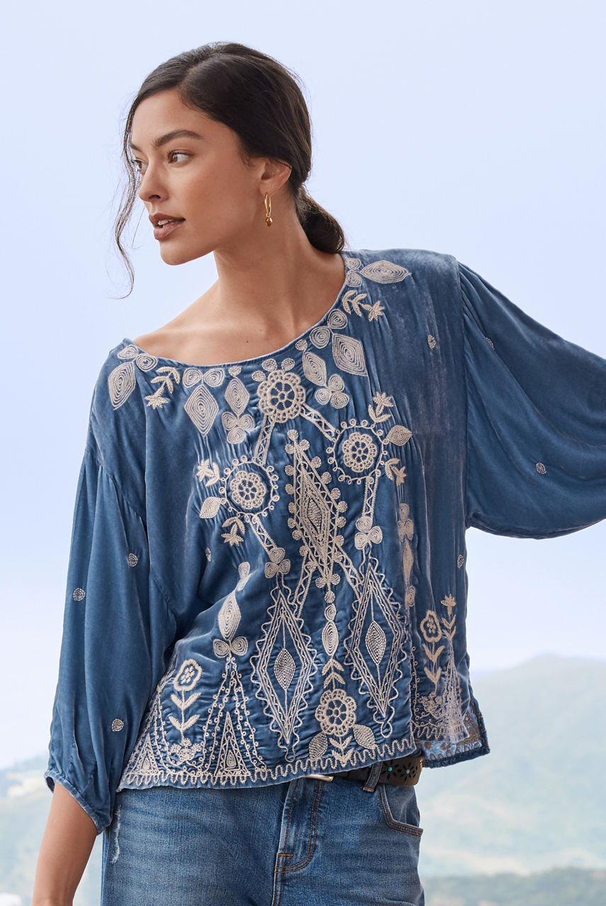 The height of free-spirited elegance, the Liona Velvet Boatneck Blouse is a subtle fusion of color and texture. This blouse is designed from plush silk blend velvet and features a boatneck, three-quarter length sleeves, and an intricate white placement embroidery comprising floral motifs. Style this blouse with jeans and bold jewelry for an eye-catching daytime ensemble.