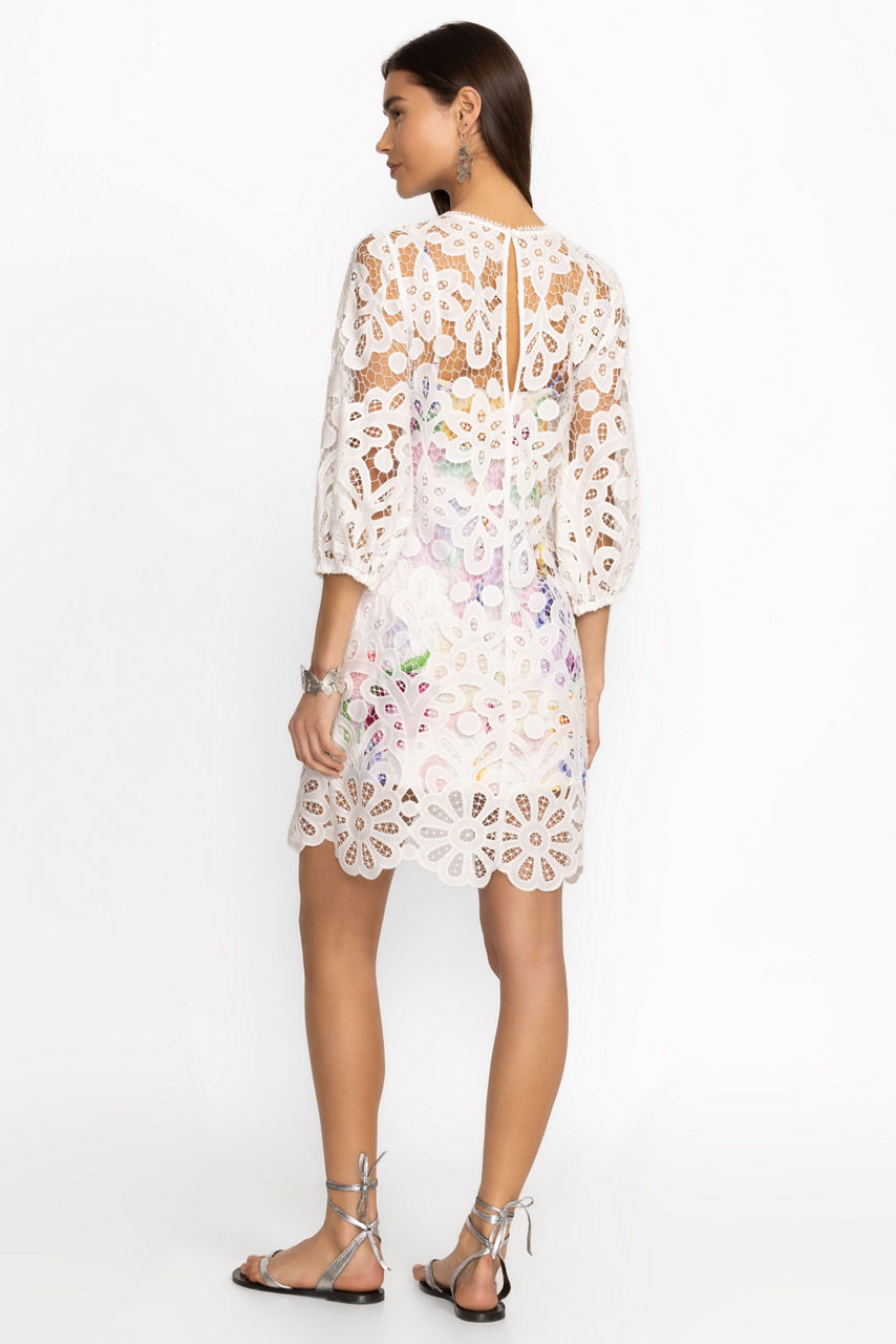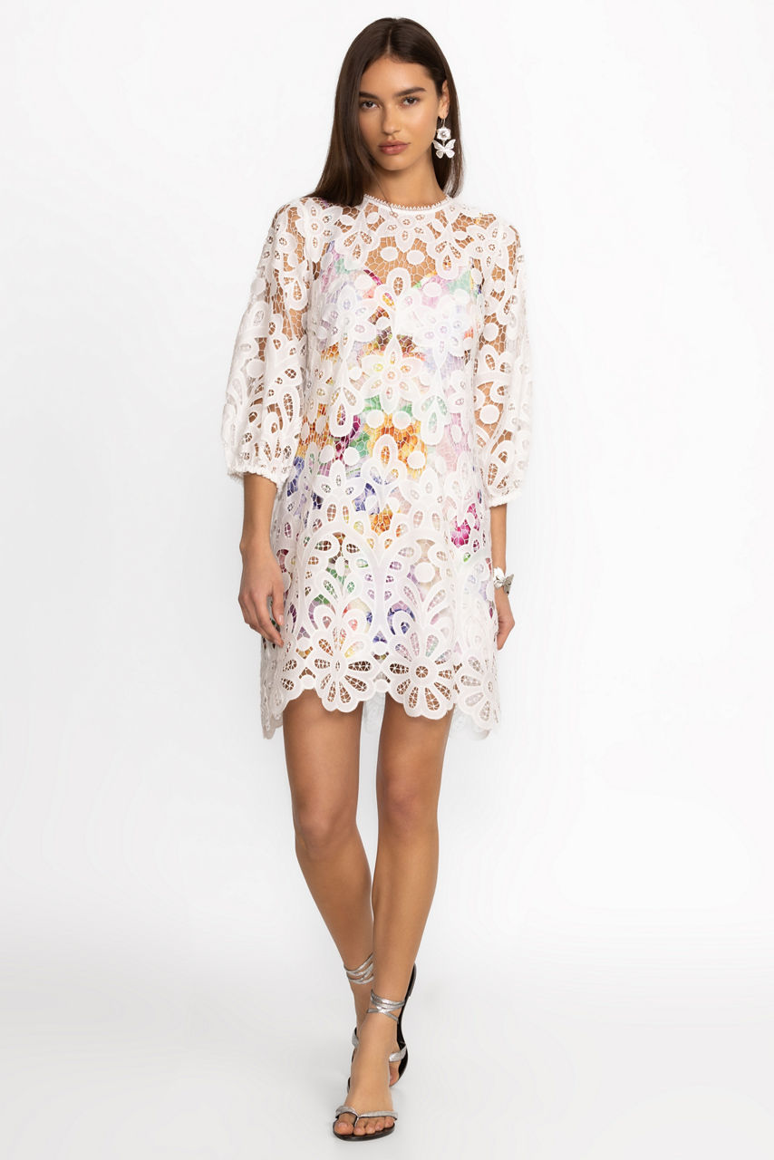 Crafted from a lightweight, flowing material, the Lisetta Lace Mini Dress creates a visually stunning image. Featuring a rounded neckline and gently puffed long sleeves, this slip-lined dress is finished with an intricately cut scalloped hemline. Pair with delicate jewelry and strappy sandals for an evening out.