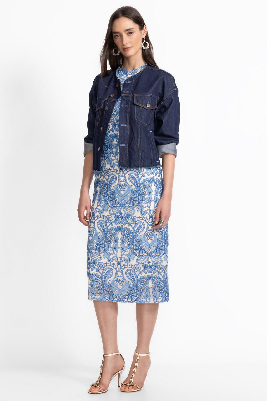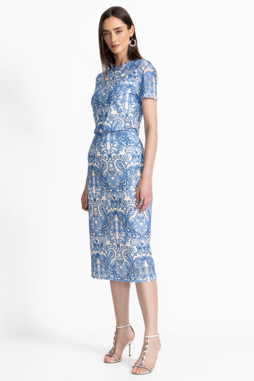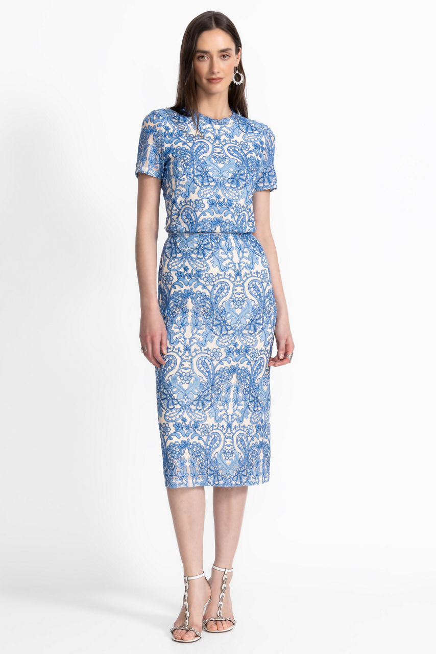 Crafted from a lightweight breezy mesh with a hint of stretch, the Lizandrea Mesh Midi Skirt is adorned with a lovely blue damask print. Featuring an elastic waist and stunning midi length, this skirt is finished with delicate embroidered detailing to enhance the ornate print. Pair with a white silk Cami and a denim jacket for an elevated casual combination.