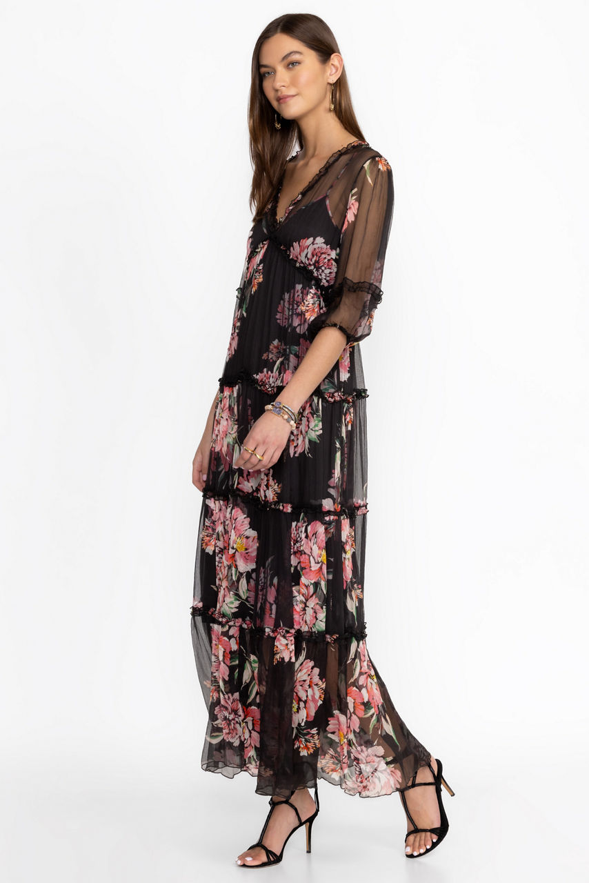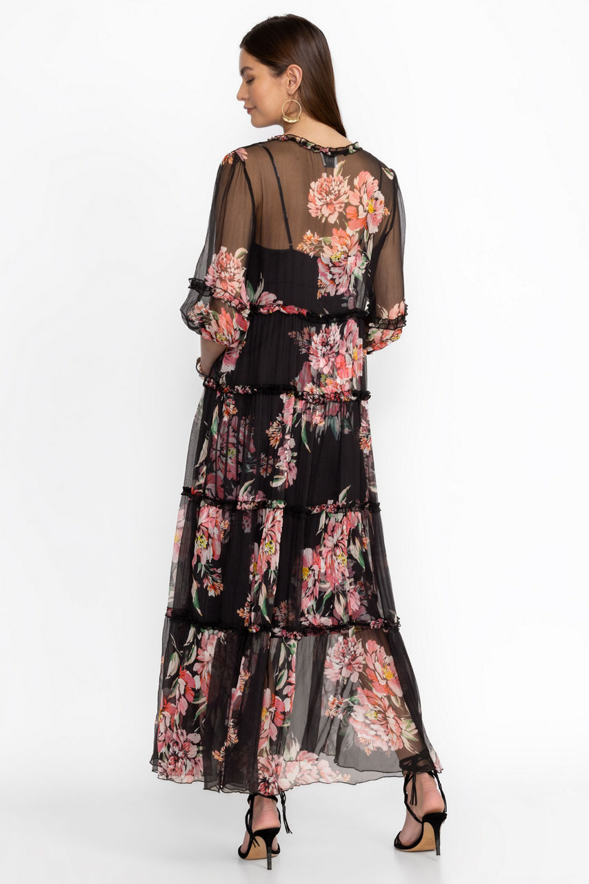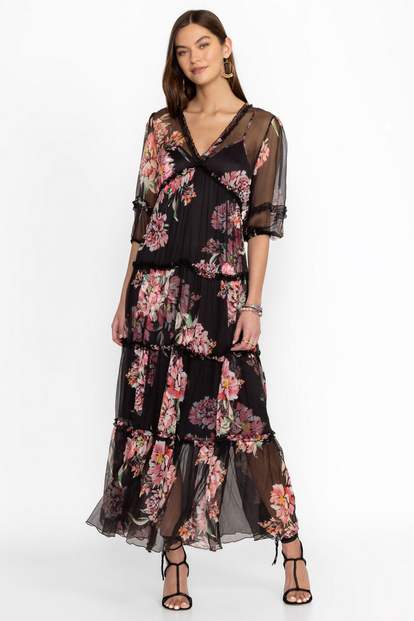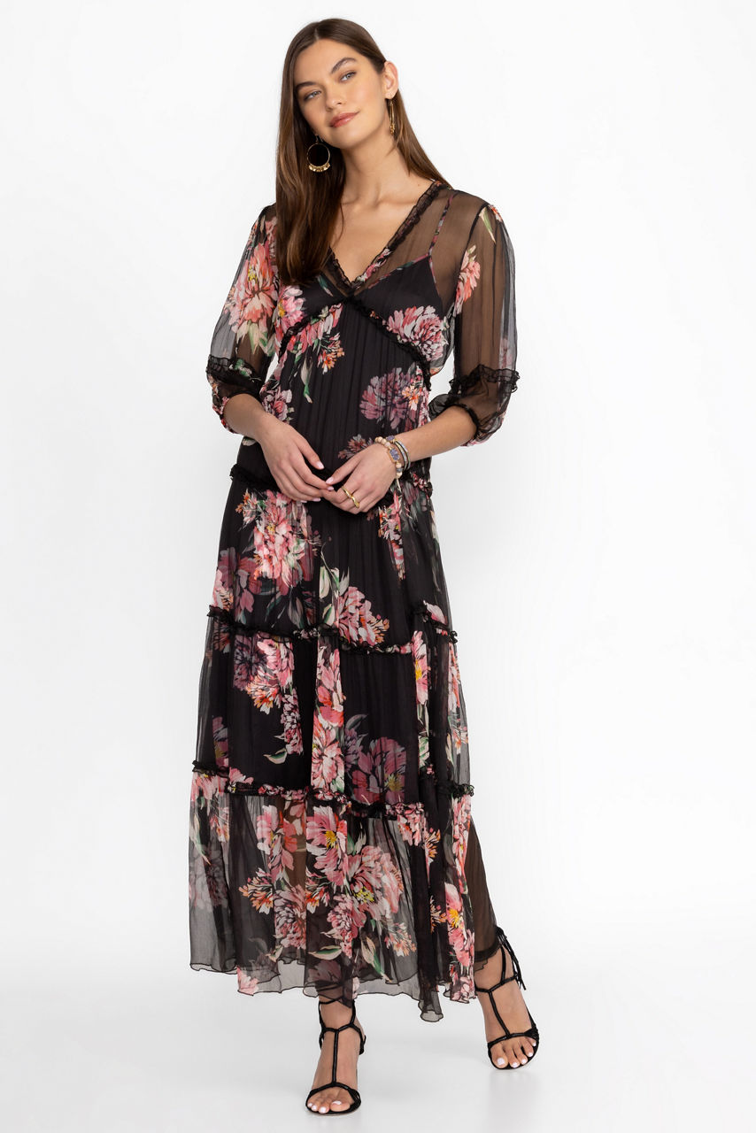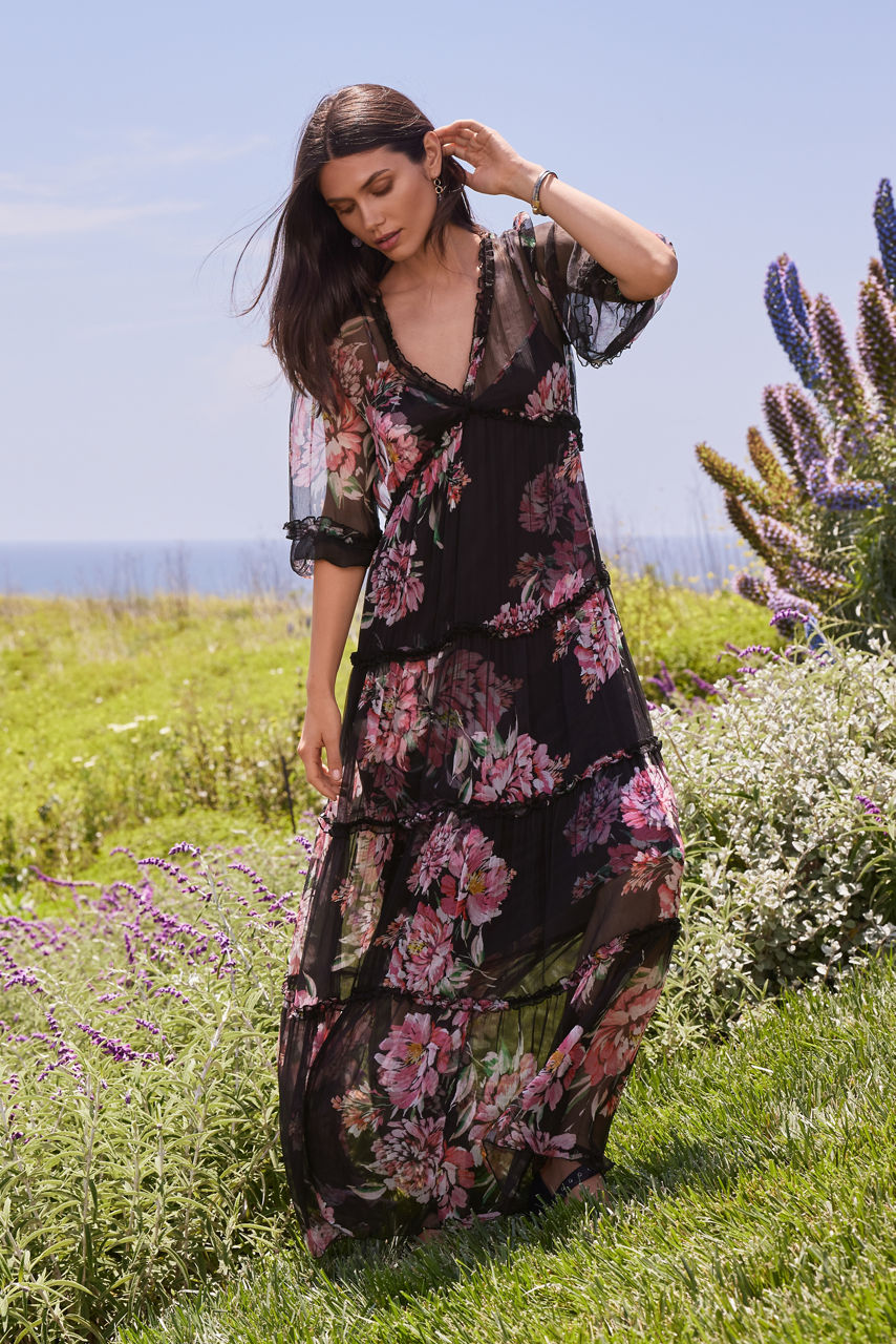 Crafted from 100% sumptuous silk, the Lizzy Ruffle Maxi Dress is beautifully adorned with bold floral blooms. Featuring a deep V-neckline and gently puffed sleeves, this slip-lined dress offers an empire waist and tiered A-line skirt for a flowing, feminine silhouette. Pair with espadrille wedges and a classic black clutch for an evening out.