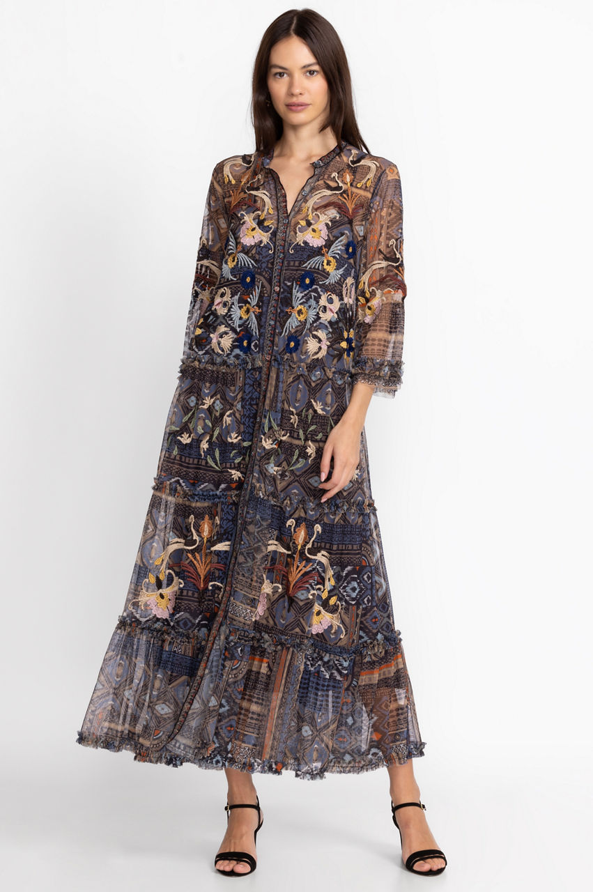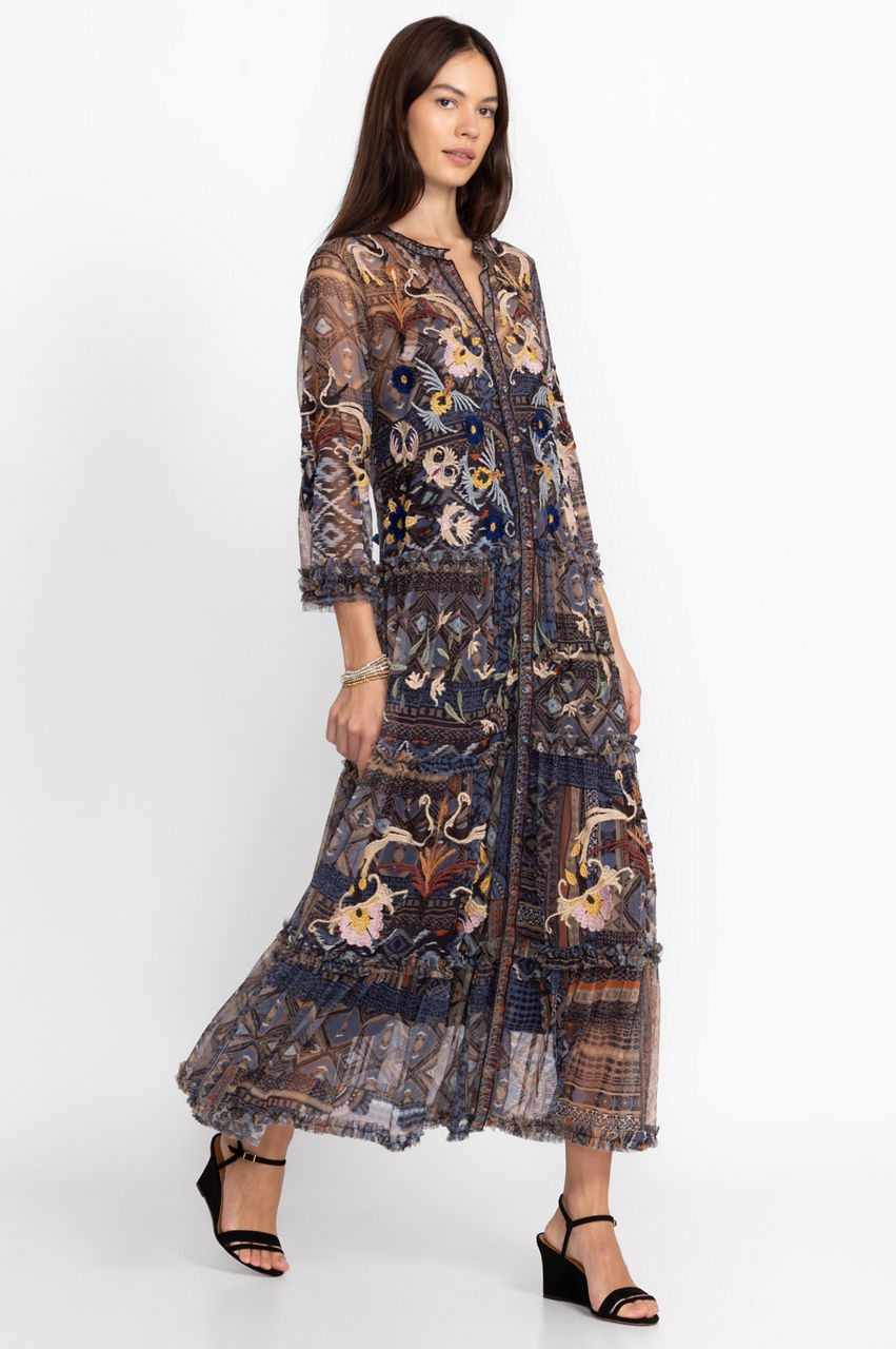 Romance blooms on the Loane Mesh Dress. A statement take on a timeless silhouette, this dress is designed from a lightweight mesh material and boasts a collar, a front button fastening, a floral and bird placement embroidery, and ruffles at the sleeves and hem for a fanciful touch. Style this dress with heeled sandals for an elegant evening look.