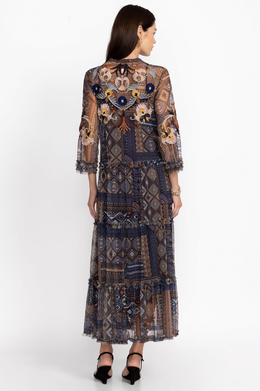 Romance blooms on the Loane Mesh Dress. A statement take on a timeless silhouette, this dress is designed from a lightweight mesh material and boasts a collar, a front button fastening, a floral and bird placement embroidery, and ruffles at the sleeves and hem for a fanciful touch. Style this dress with heeled sandals for an elegant evening look.