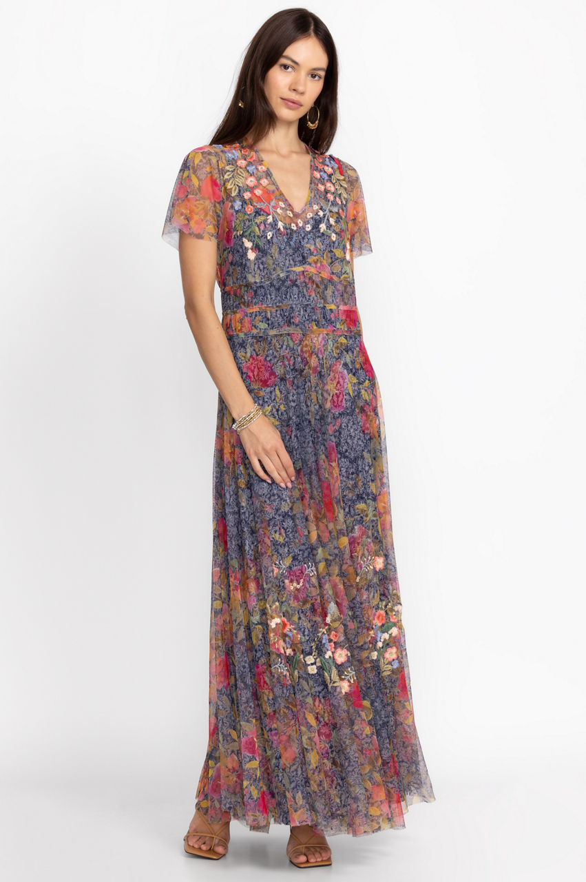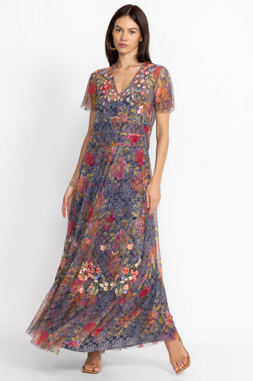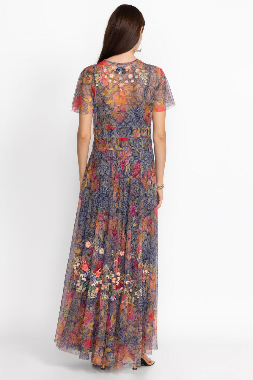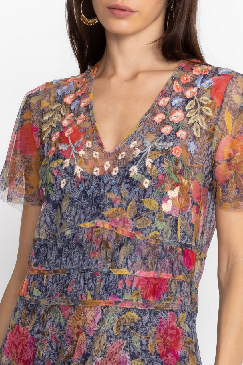 The height of feminine elegance, the Locust Mesh Dress is a head-turning choice for special occasions. This dress is designed from a transparent mesh material and features a flattering V-neck, short sleeves, a detailed placement embroidery, a raw edge hem, and a gathered waist to define the silhouette. Complete with a separate slip, this dress works wonders with heels and subtle jewelry.