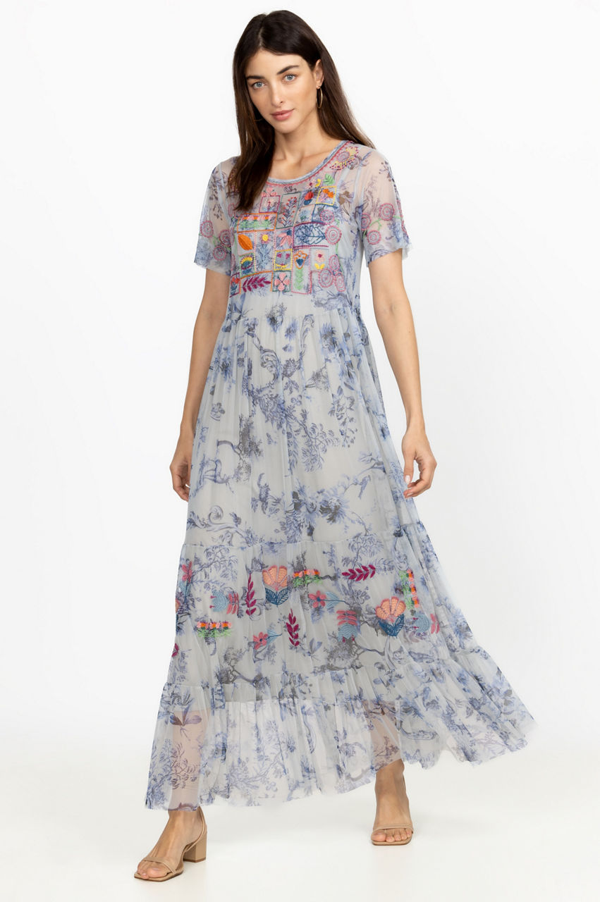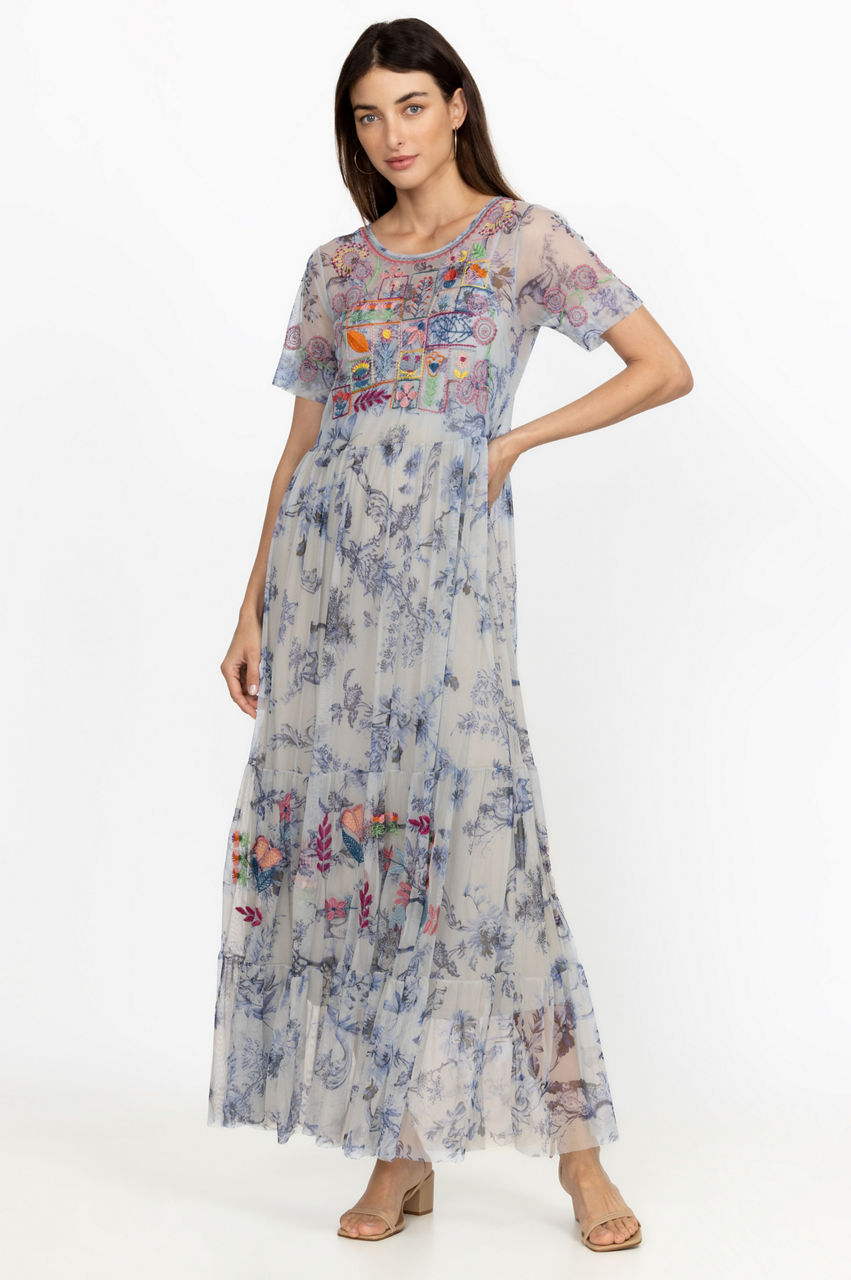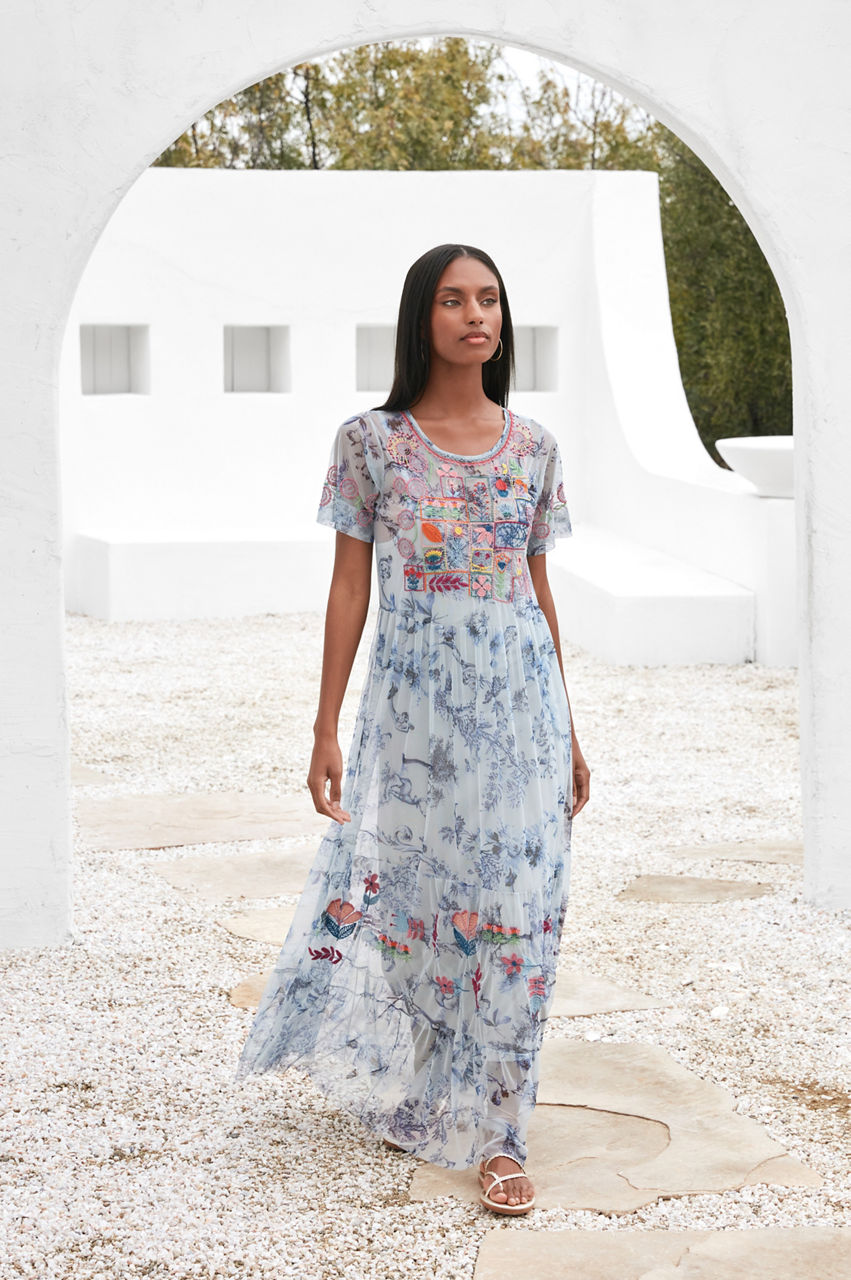 Color and pattern dominate the vibrant Logan Tiered Mesh Dress. Perfect for sun-splattered weather, this tiered dress is shaped to a maxi silhouette and boasts a round neck, short sleeves, a vintage blue floral print, and a placement embroidery comprising colorful floral motifs. Style with sandals for a feminine warm-weather look.
