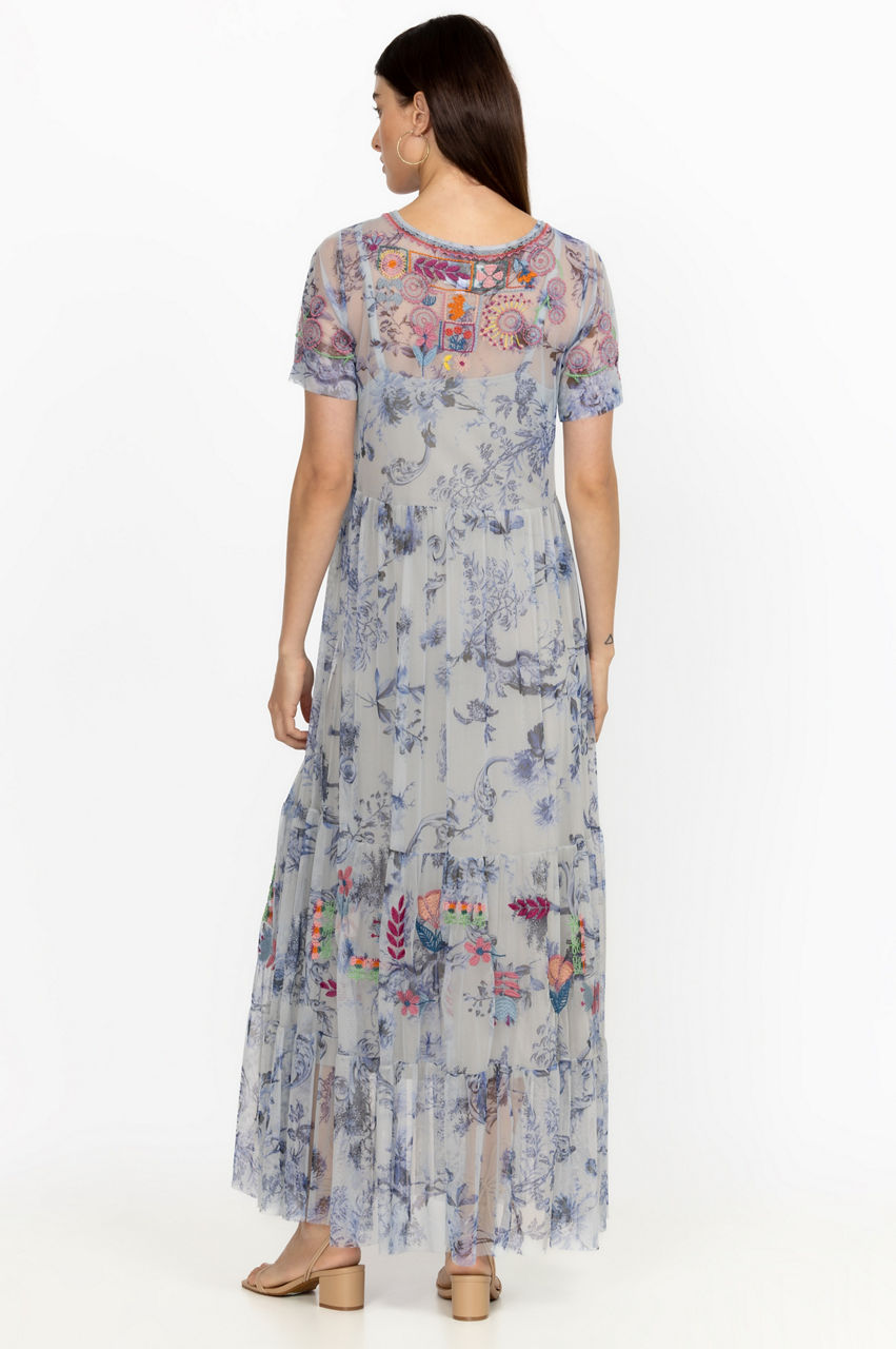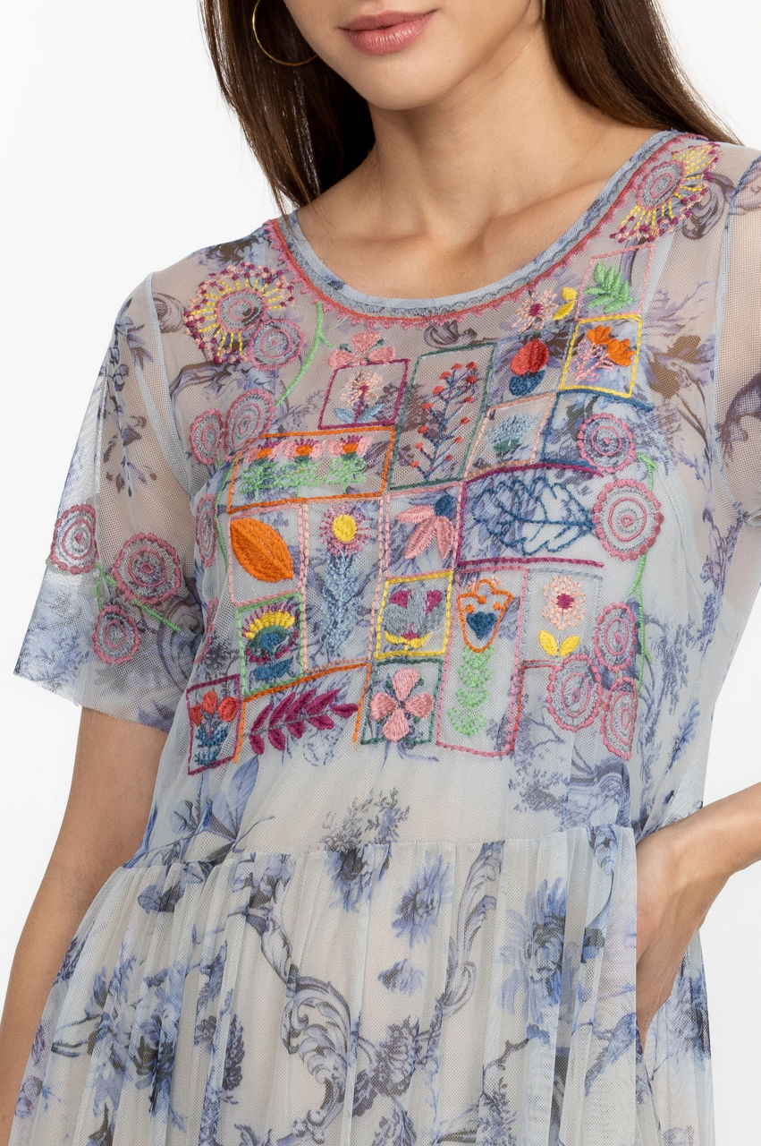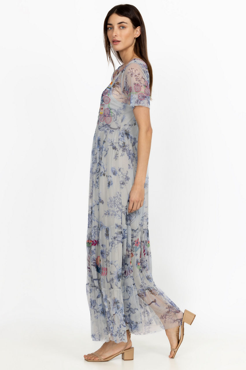 Color and pattern dominate the vibrant Logan Tiered Mesh Dress. Perfect for sun-splattered weather, this tiered dress is shaped to a maxi silhouette and boasts a round neck, short sleeves, a vintage blue floral print, and a placement embroidery comprising colorful floral motifs. Style with sandals for a feminine warm-weather look.