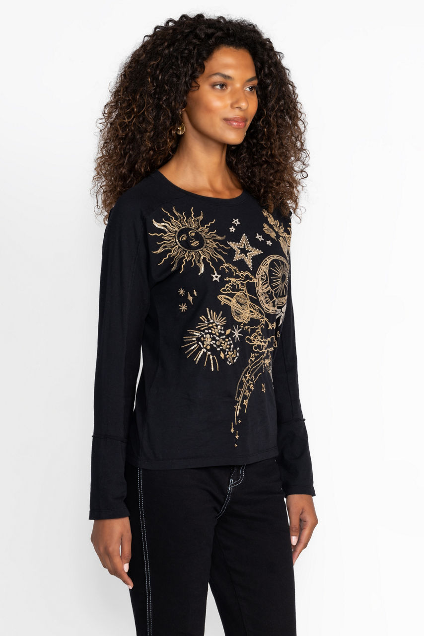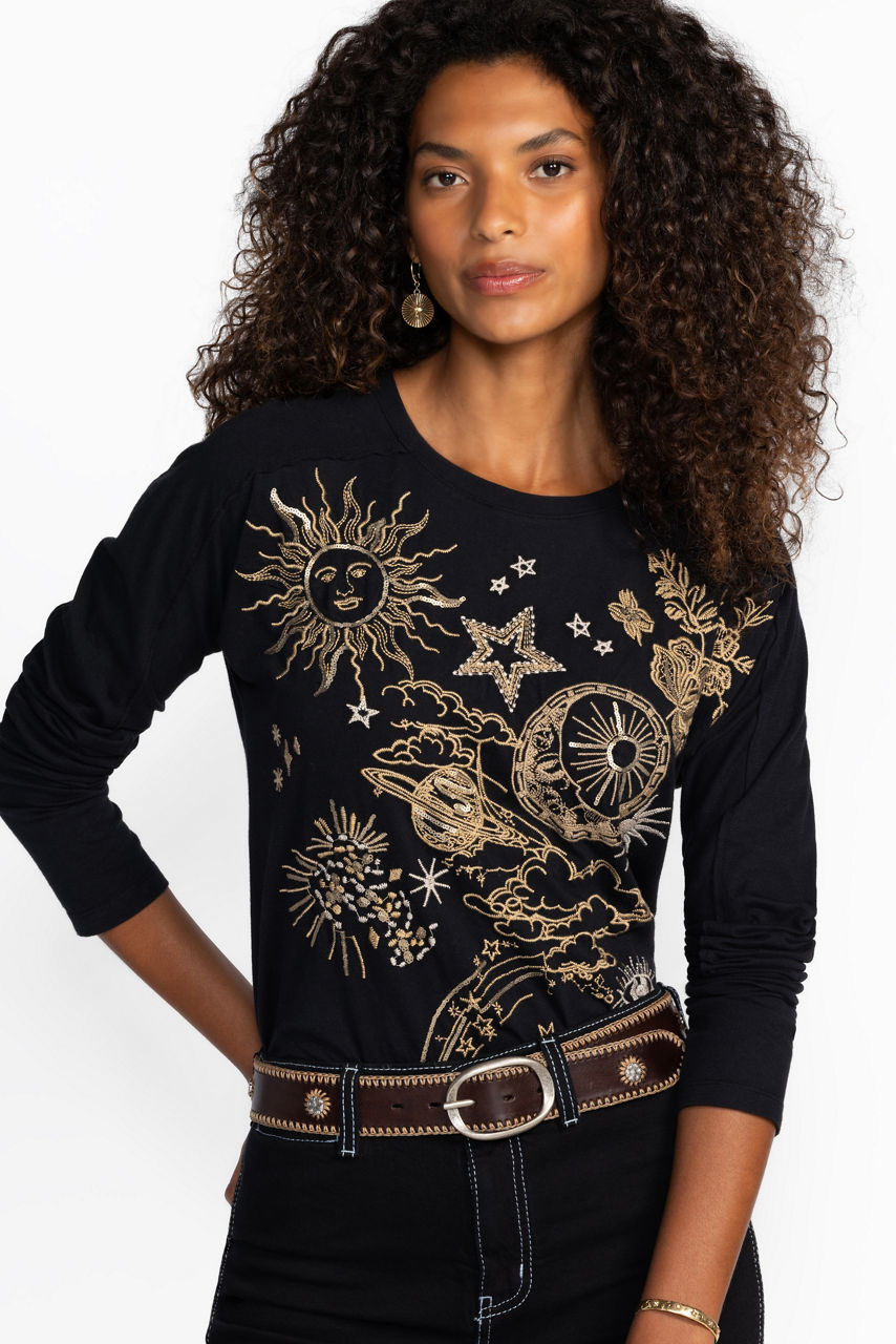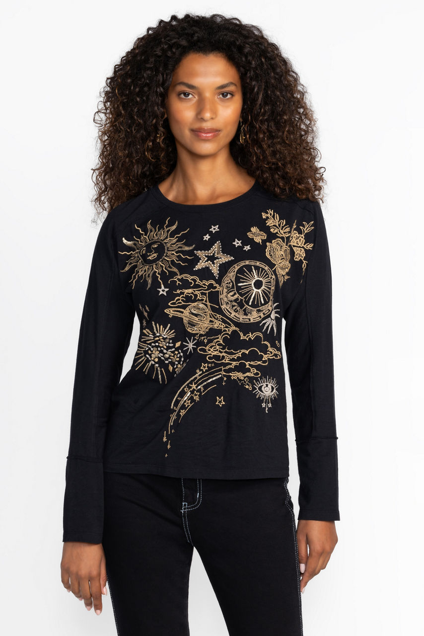 Beautifully crafted from 100% breathable cotton, the Long Sleeve Dolman Tee is the perfect balance of casual comfort and elevated style. Featuring a boat neckline and relaxed dolman sleeves, this comfortable tee is embellished with bold celestial iconography. Pair with skinny jeans and kitten heels for a polished casual ensemble.