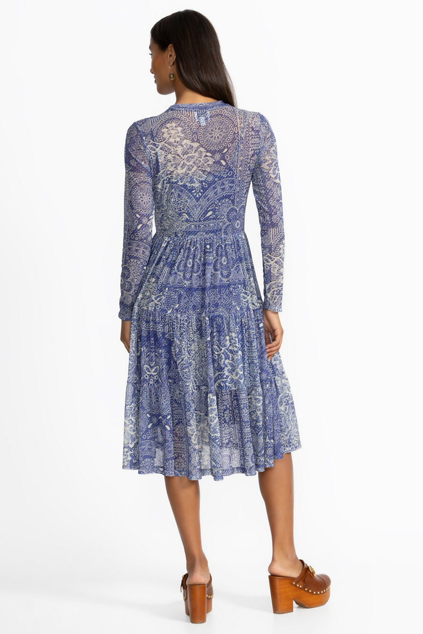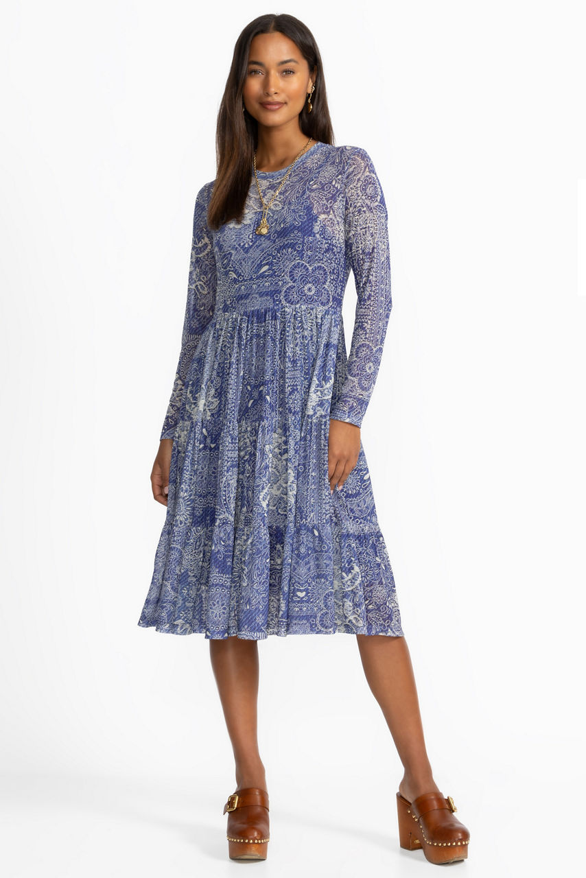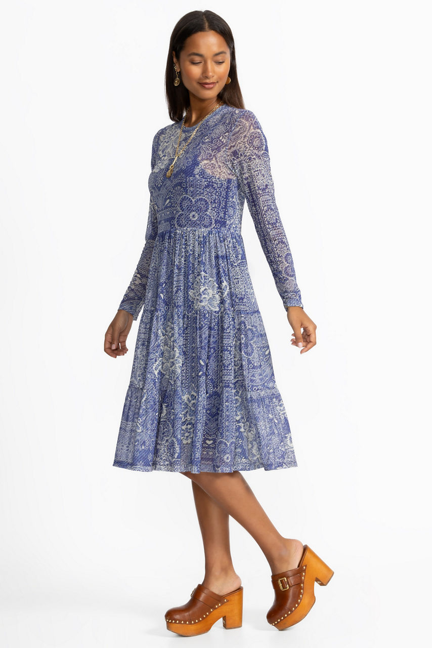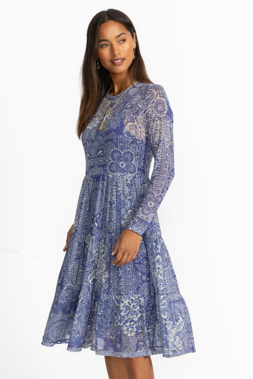 Inspired by classic denim, the Long Sleeve Mesh Tiered Dress is adorned with a combination of paisley and floral patterns in hues of blue. Featuring a crew neckline and long sleeves, this slip-lined mesh dress is finished with a flowing tiered skirt with layers of volume. Pair with white sandals and add bold jewelry for a perfect brunch ensemble.