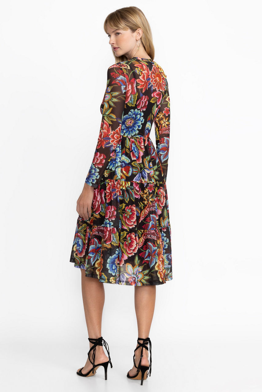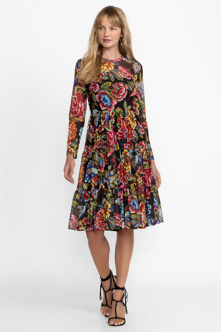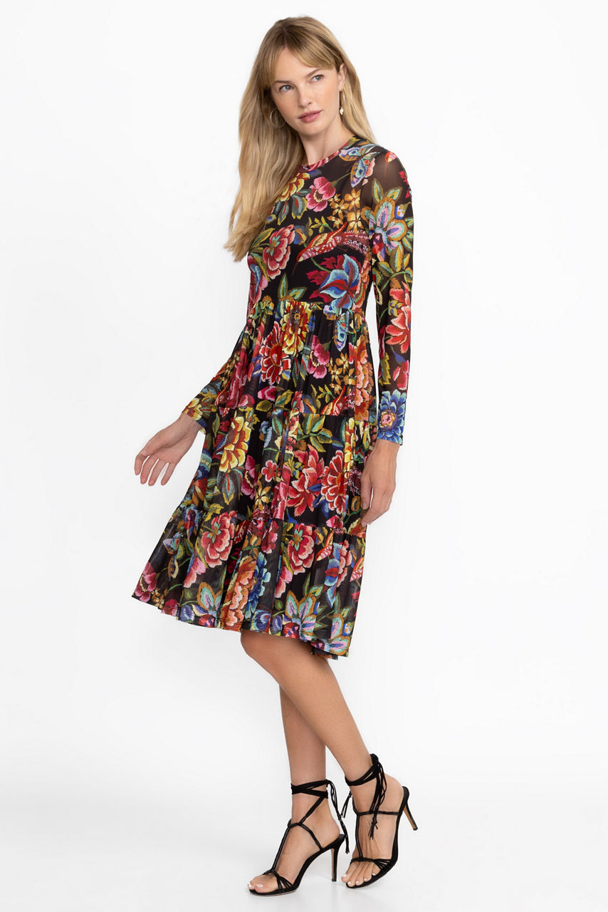 Crafted from a lightweight mesh fabric with a hint of stretch, the Long Sleeve Mesh Tiered Dress is adorned with a bold floral pattern rich in color. Featuring a high, rounded neckline and an A-line silhouette, this slip-lined dress is finished with a tiered skirt. Pair with espadrille sandals and delicate jewelry for a vacation-worthy look.