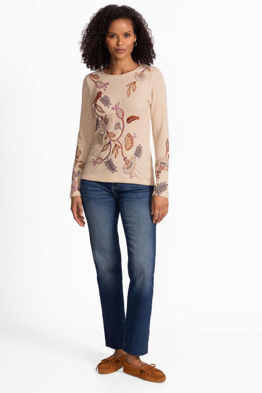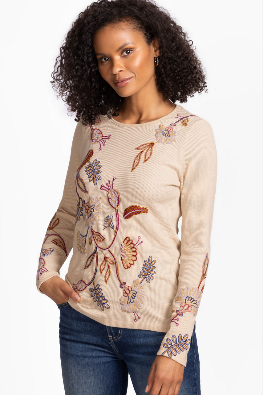 Crafted from a unique cotton blend, the Gineva Long Sleeve Thermal is equal parts cozy and stylish. Featuring a crew neckline and long sleeves, this classic thermal top is embellished with vibrant floral embroidered details on a neutral backdrop. Pair with classic denim and fashion sneakers for a weekend outing.