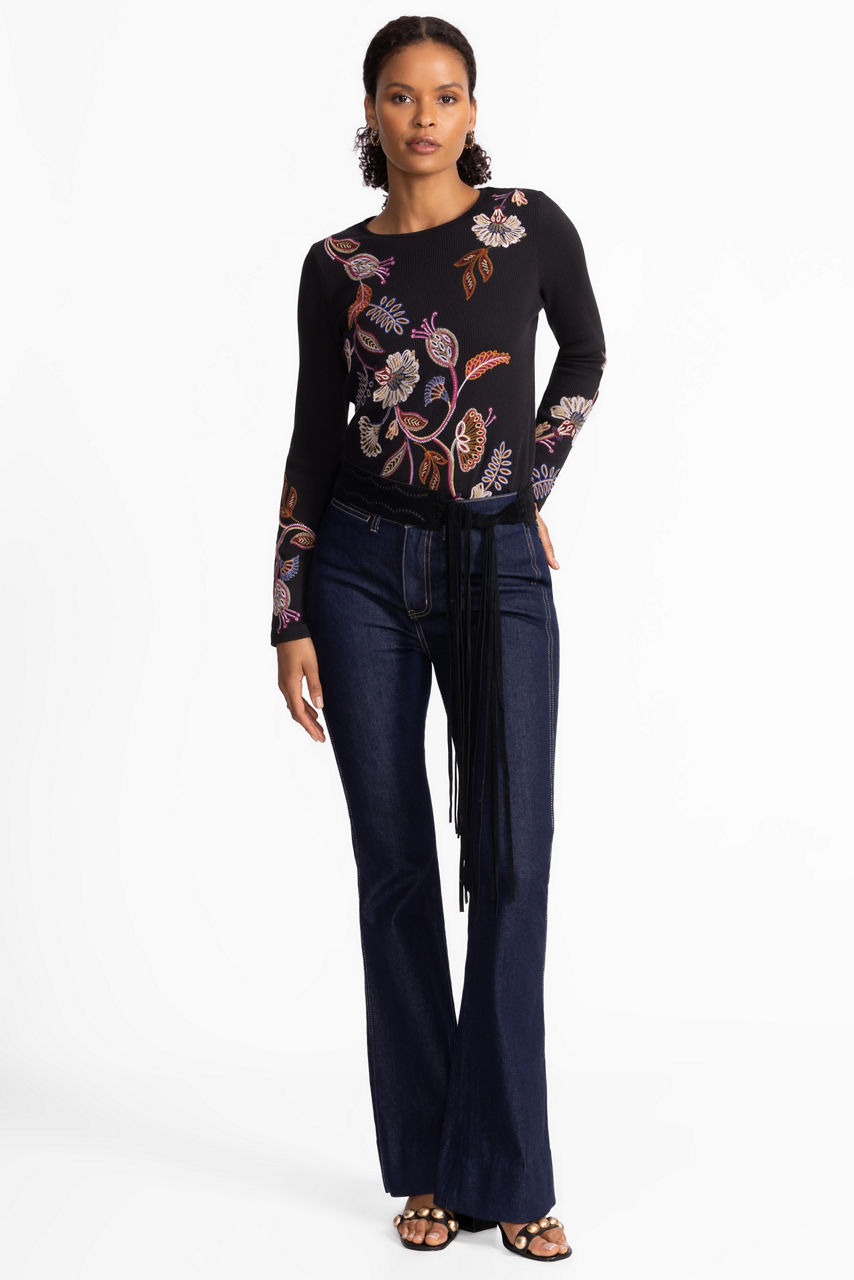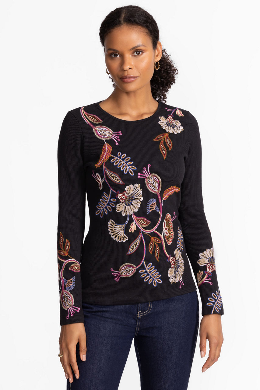 Crafted from a unique cotton blend, the Gineva Long Sleeve Thermal is equal parts cozy and stylish. Featuring a crew neckline and long sleeves, this classic thermal top is embellished with vibrant floral embroidered details on a neutral backdrop. Pair with classic denim and fashion sneakers for a weekend outing.