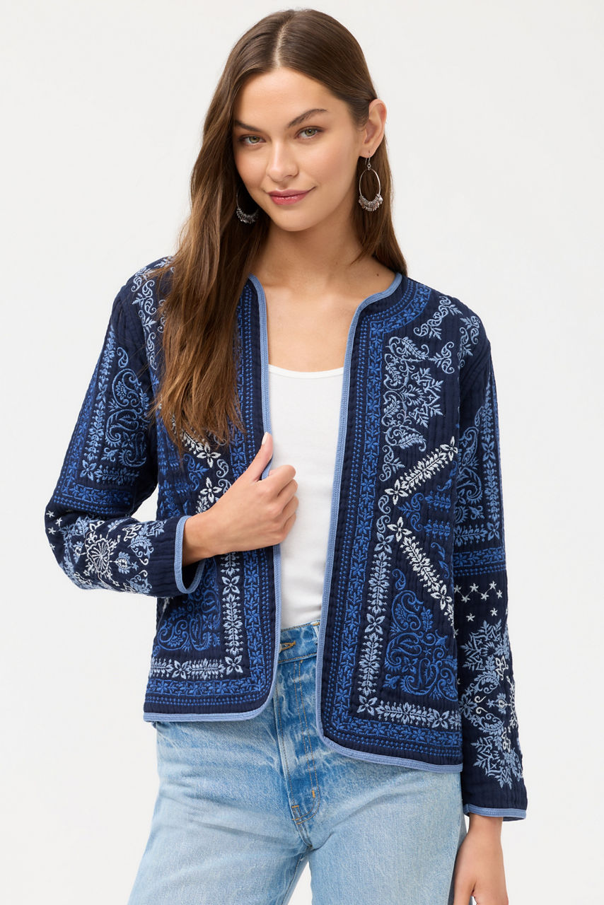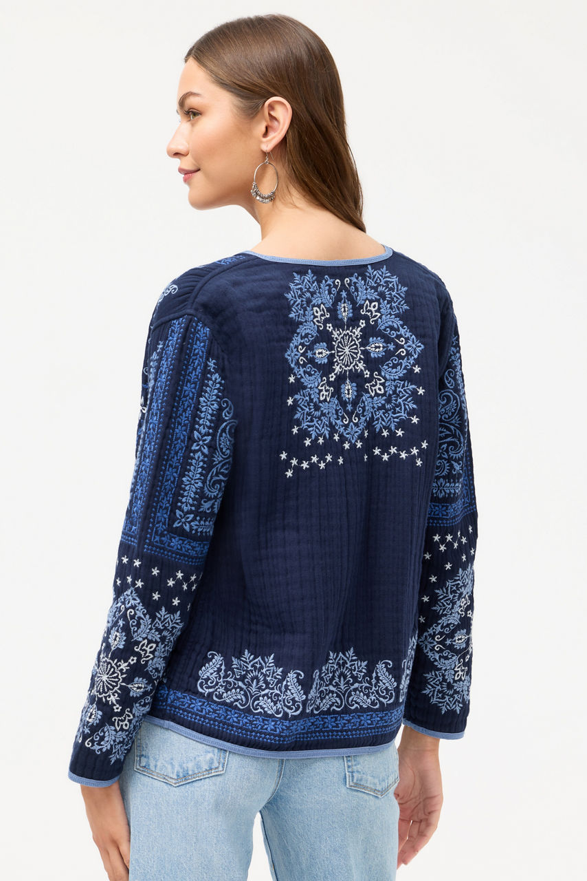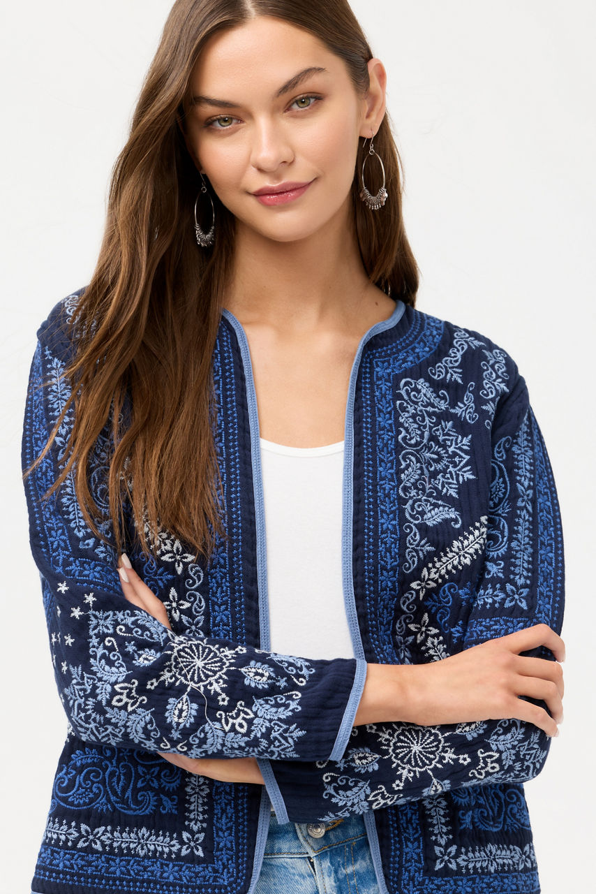 Intricately adorned with rich tone-on-tone embroidered detailing, the Lorem Gauze Jacket is crafted from breathable 100% cotton. Designed with an open front and long sleeves, this beautifully ornate jacket is finished with a uniquely curved hemline. Layer over a crisp white linen top and pair with light wash denim for a polished casual look.
