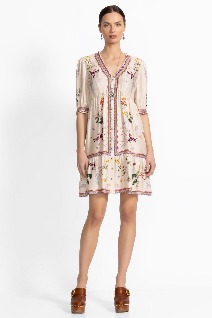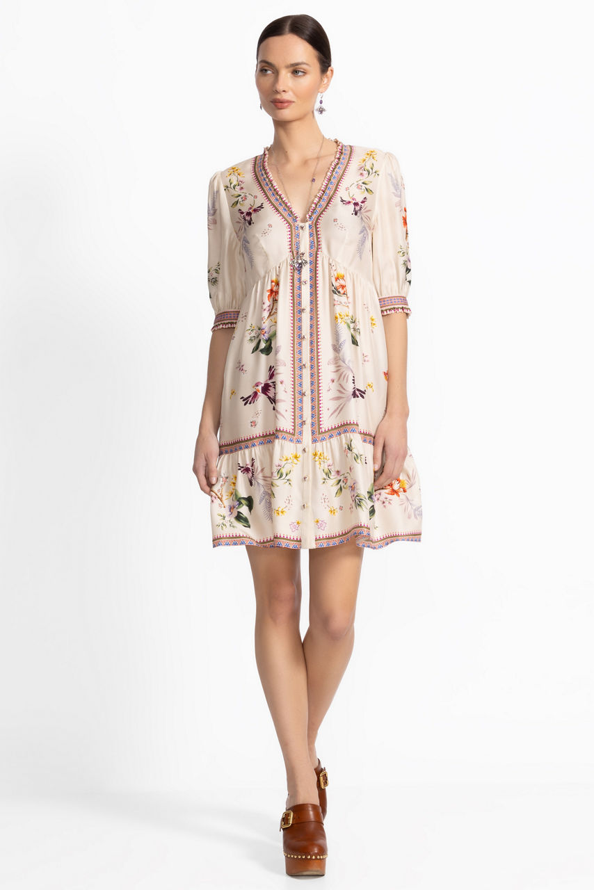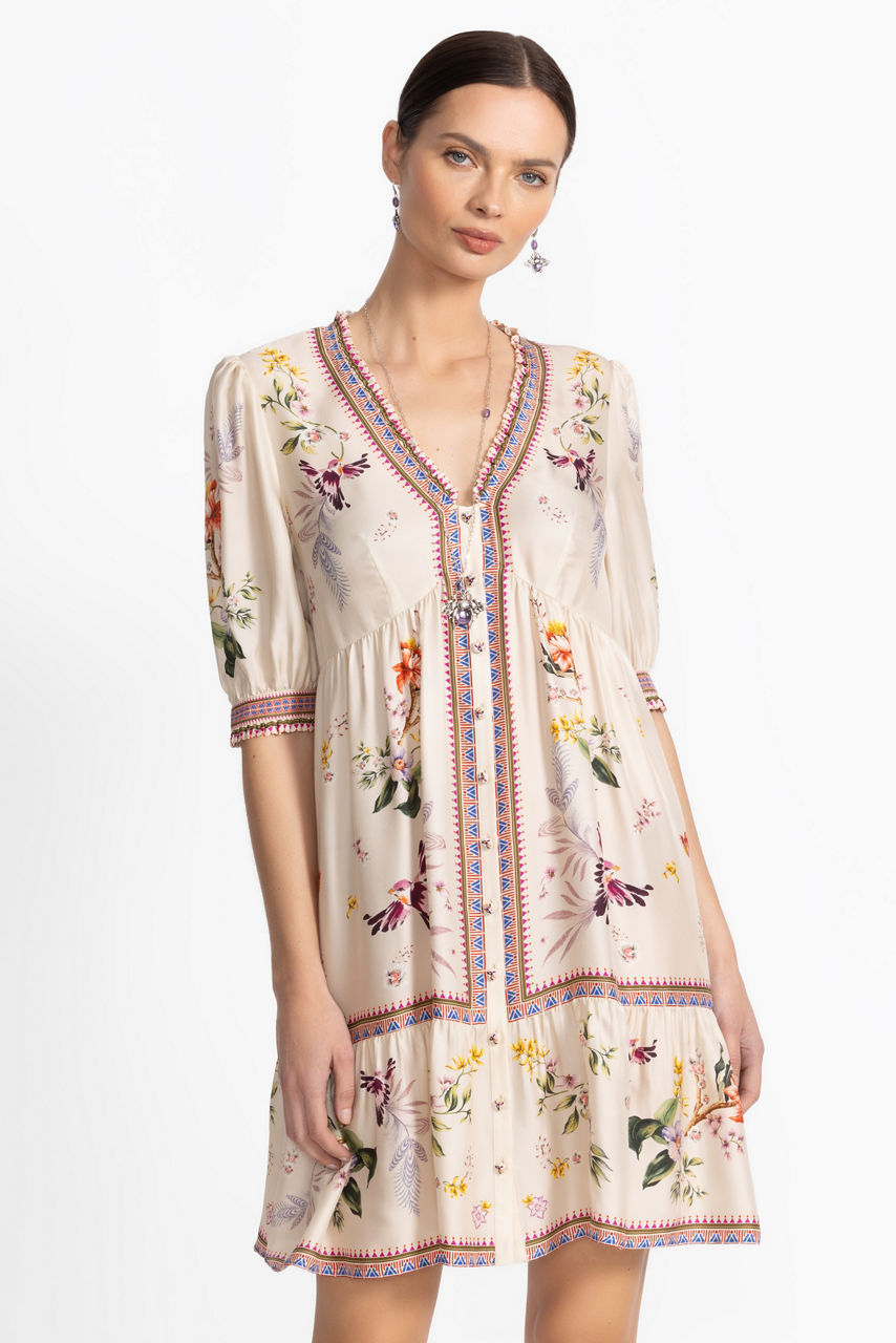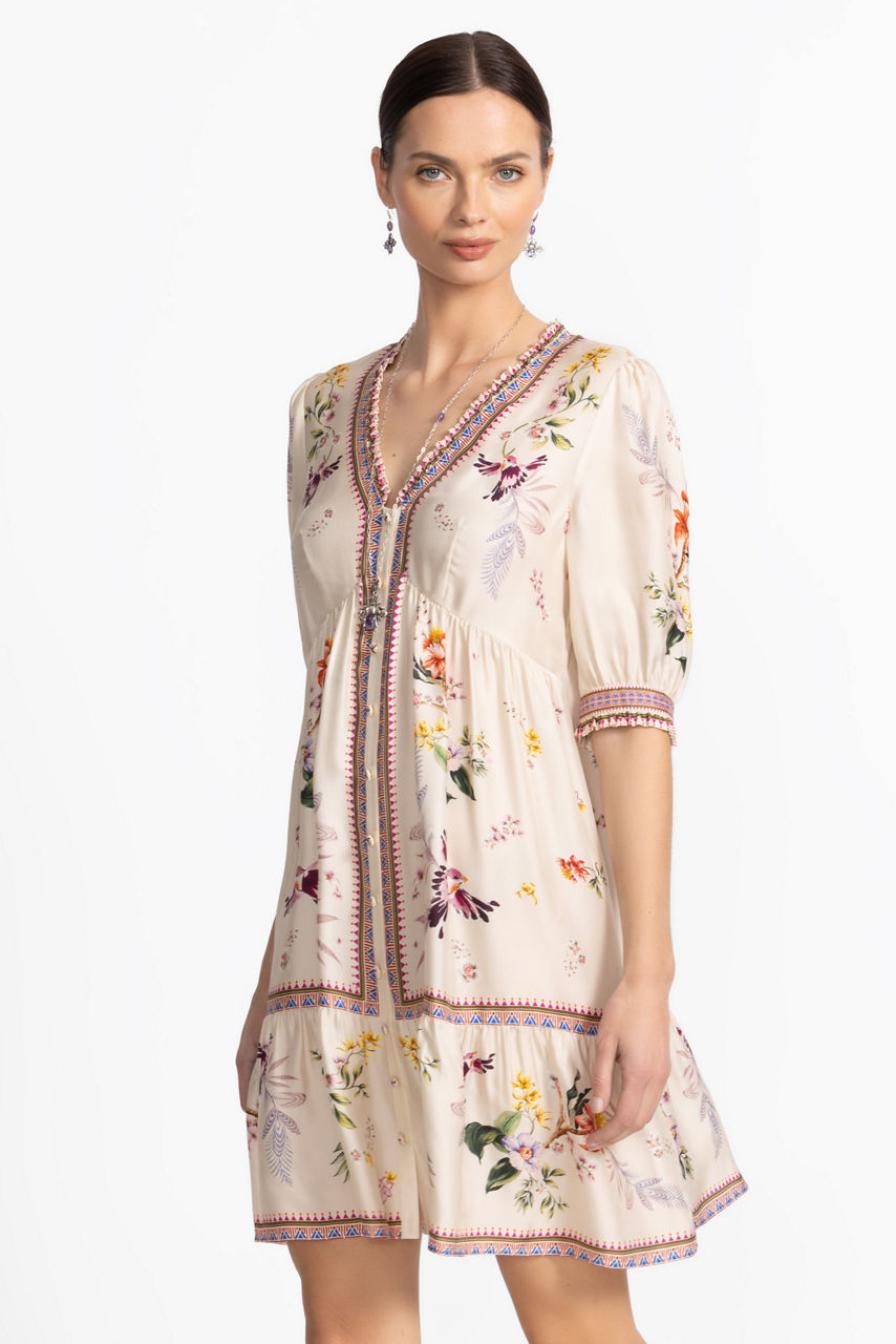 Crafted from a luxurious silk blend, the Loren Mini Dress is accented with a brilliant floral pattern in vibrant color. Featuring a V-neckline with a zippered back closure, this stunning dress offers 3/4 sleeves and an empire waist seam that creates a stunning silhouette. Pair with bold heels and colorful jewelry pieces for a fun girls' night out.